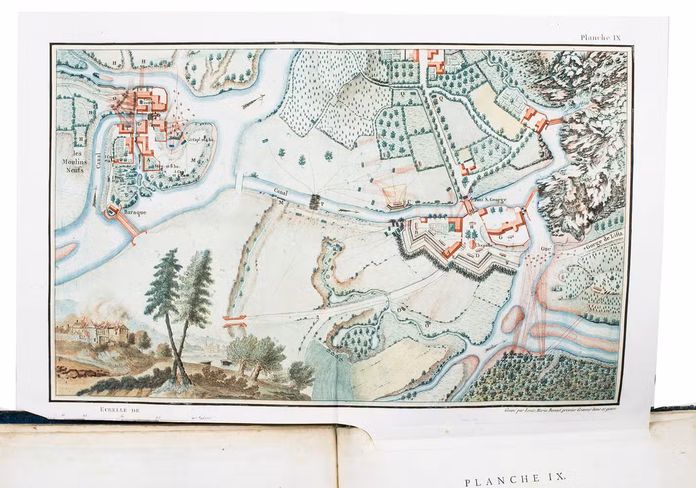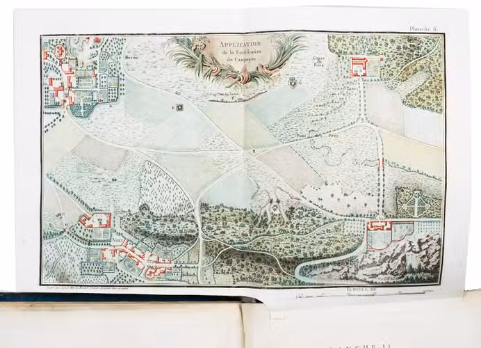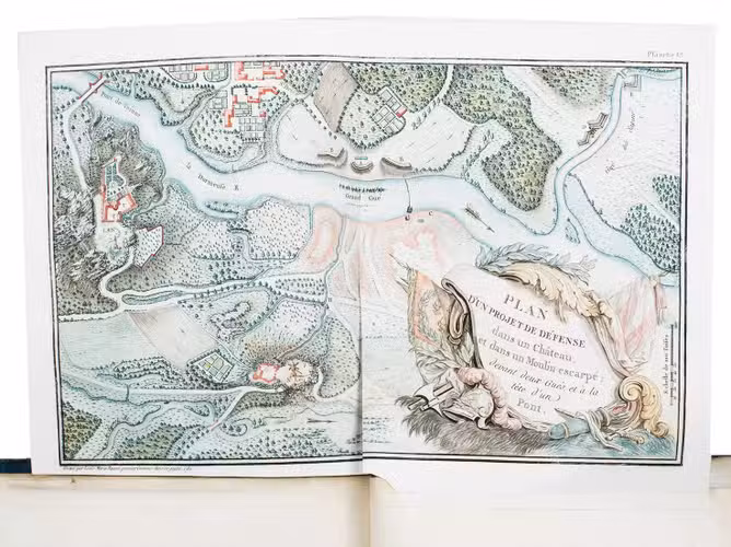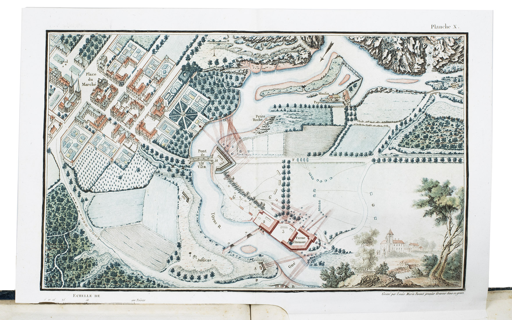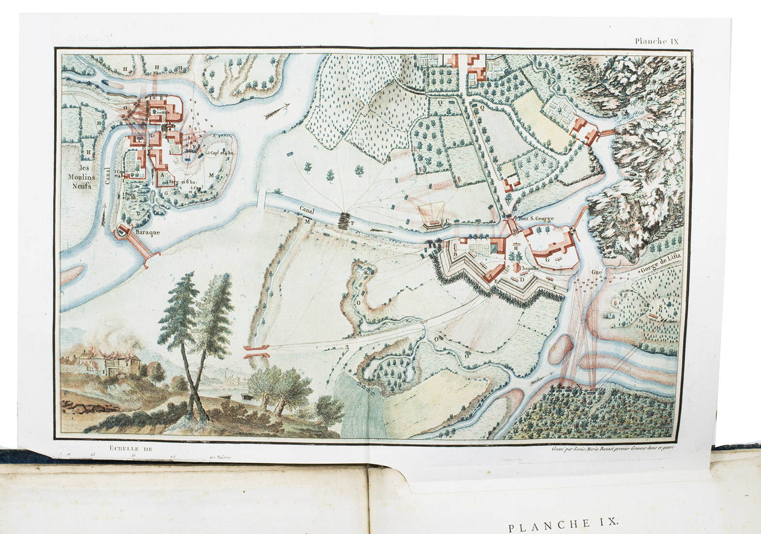 Rare first edition of a manual of military strategy and cartography with elegant illustrations colour-printed in crayon-manner by the inventor of this technique, Louis Marin Bonnet. Charles Louis François Fossé (1734-1812) was a military engineer who distinguished himself in active service during the Seven Years War and as a military cartographer. The present work is a manual for the defence of and attack on small military positions (like a farmhouse, small forest, bridge etc.). In the second part Fossé explains the rules for charting landscapes and buildings on military maps, including the meaning of the different colours, and how to indicate the shooting range of the positions. The 11 topographic maps follow the main text, each hinged to the head margin of a letterpress caption page (verso blank) with an extensive list of features in the plates, keyed to them by letters and/or numbers. The maps fold up (and the folding ones then open out to form a double page) so that the reader can view the map above the