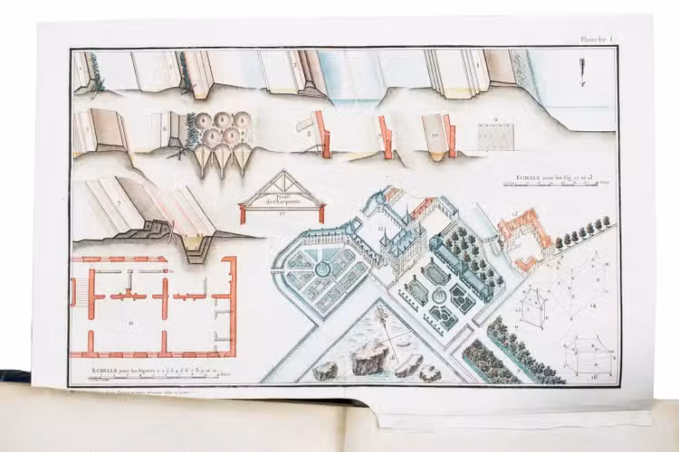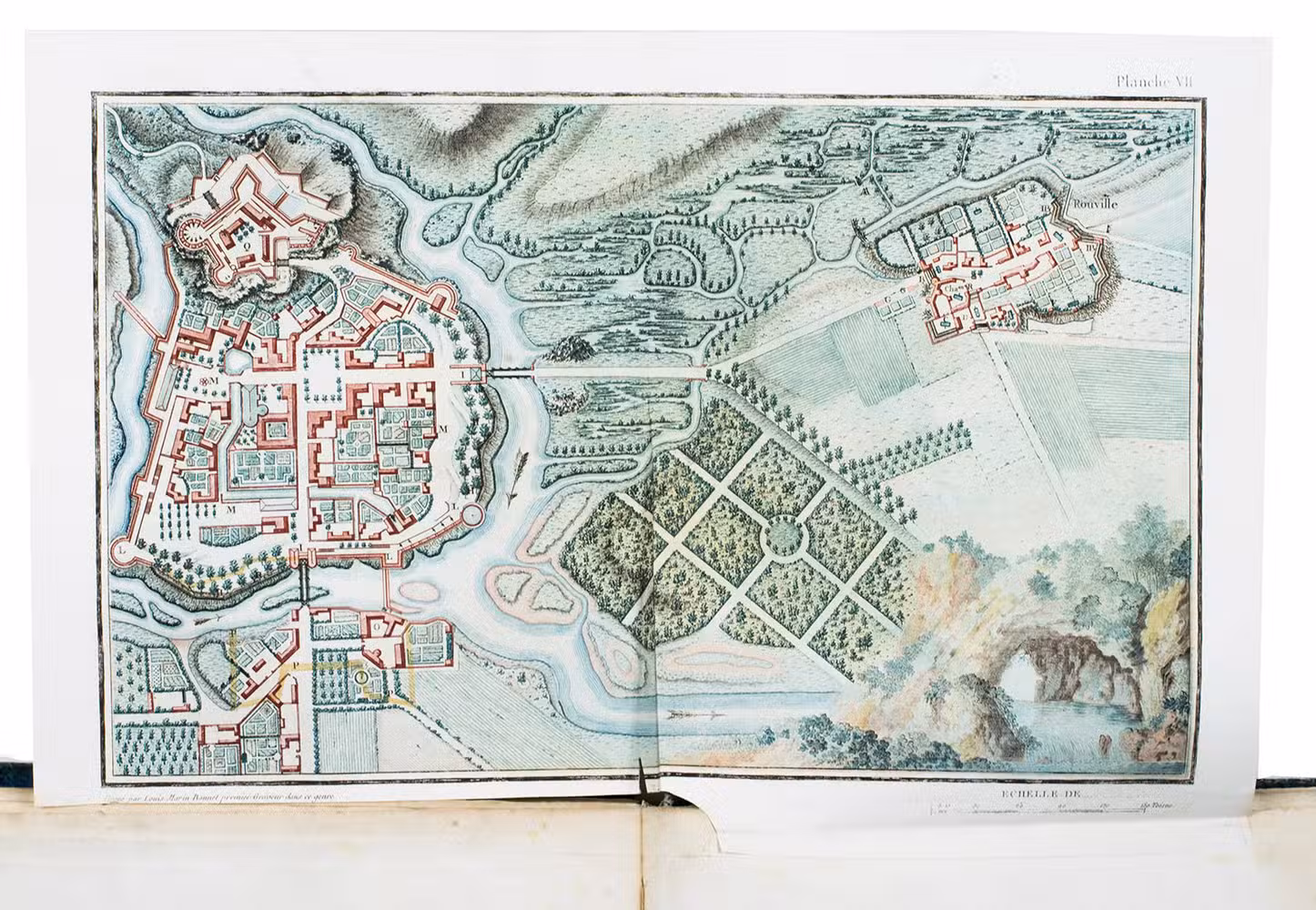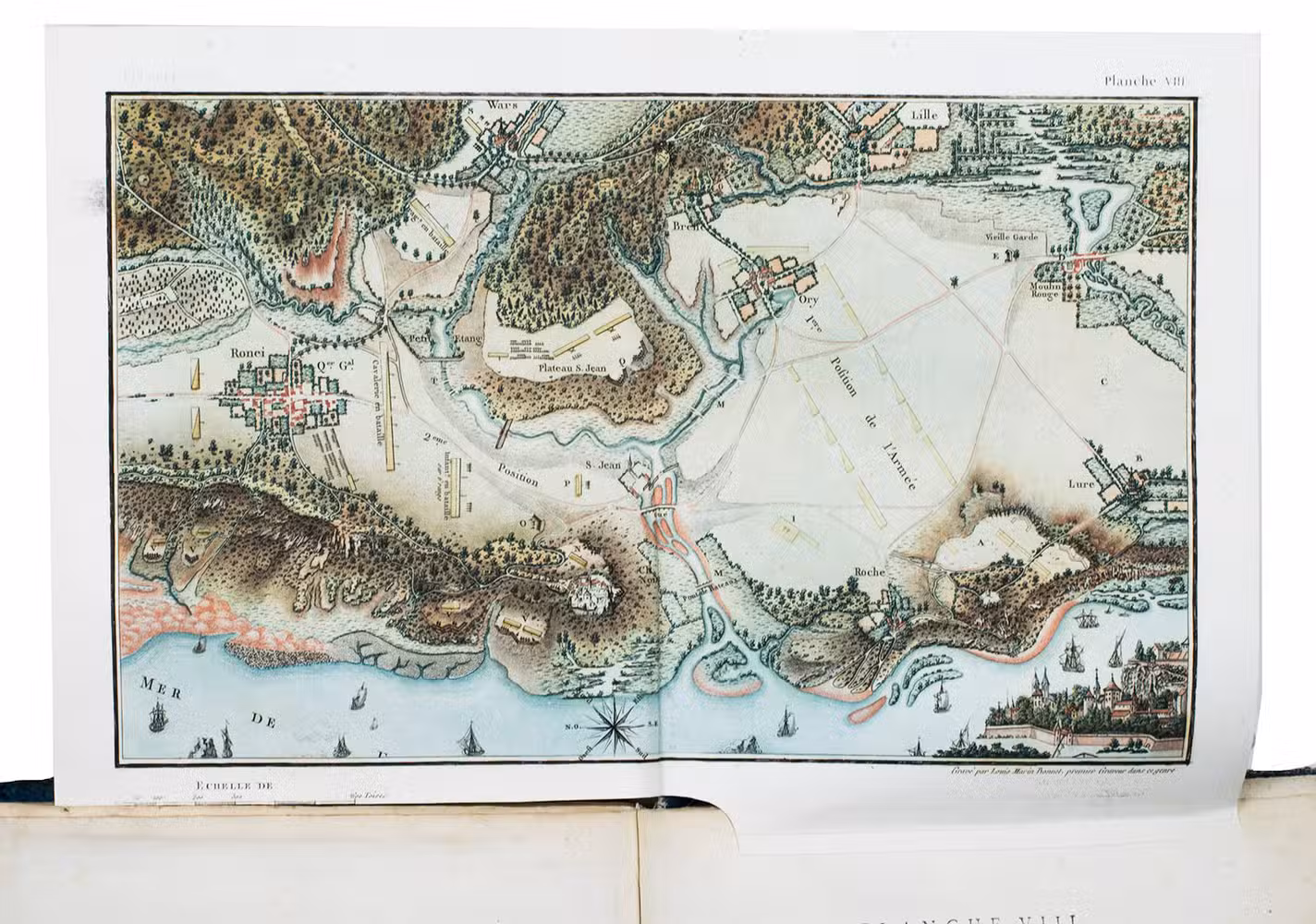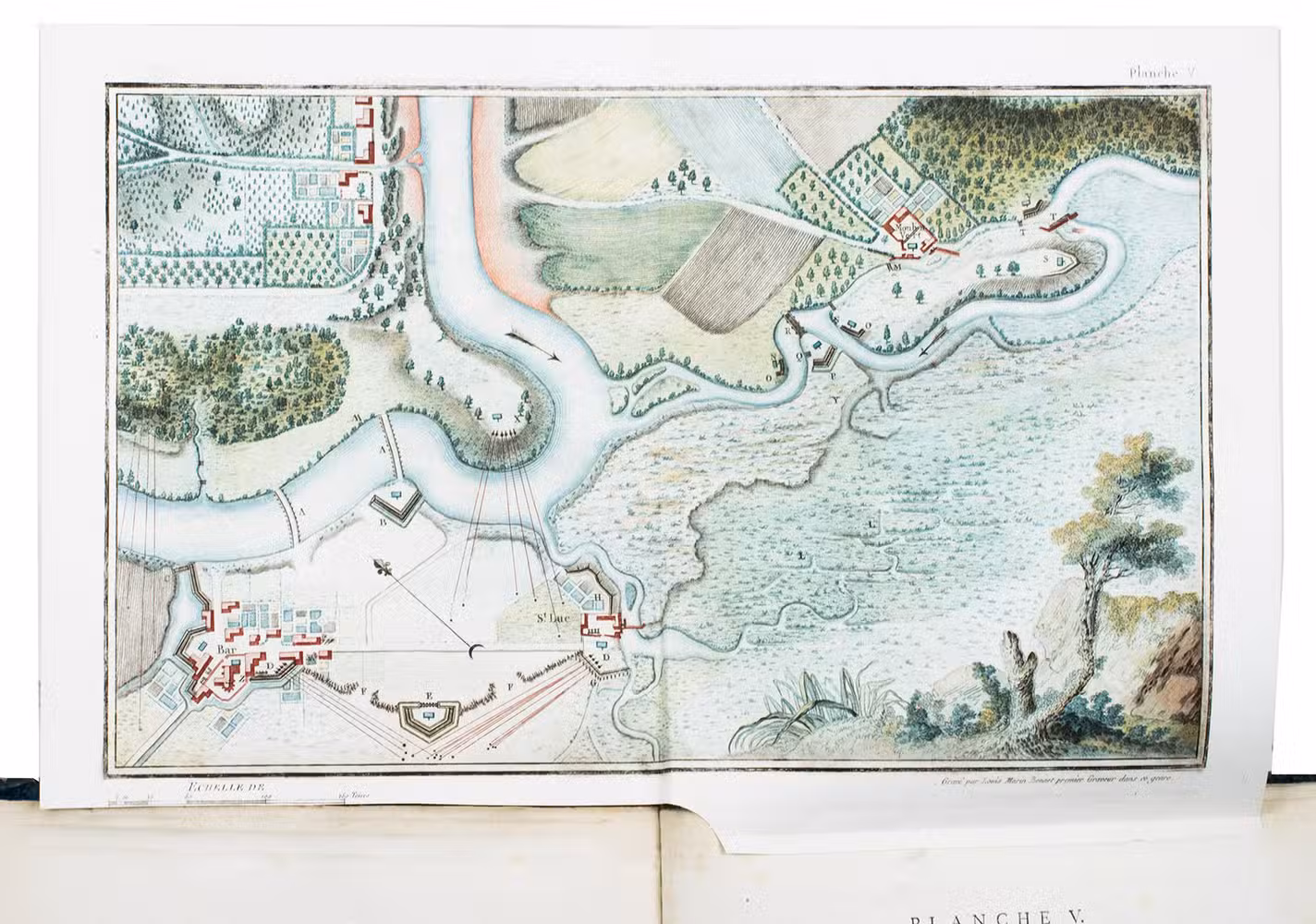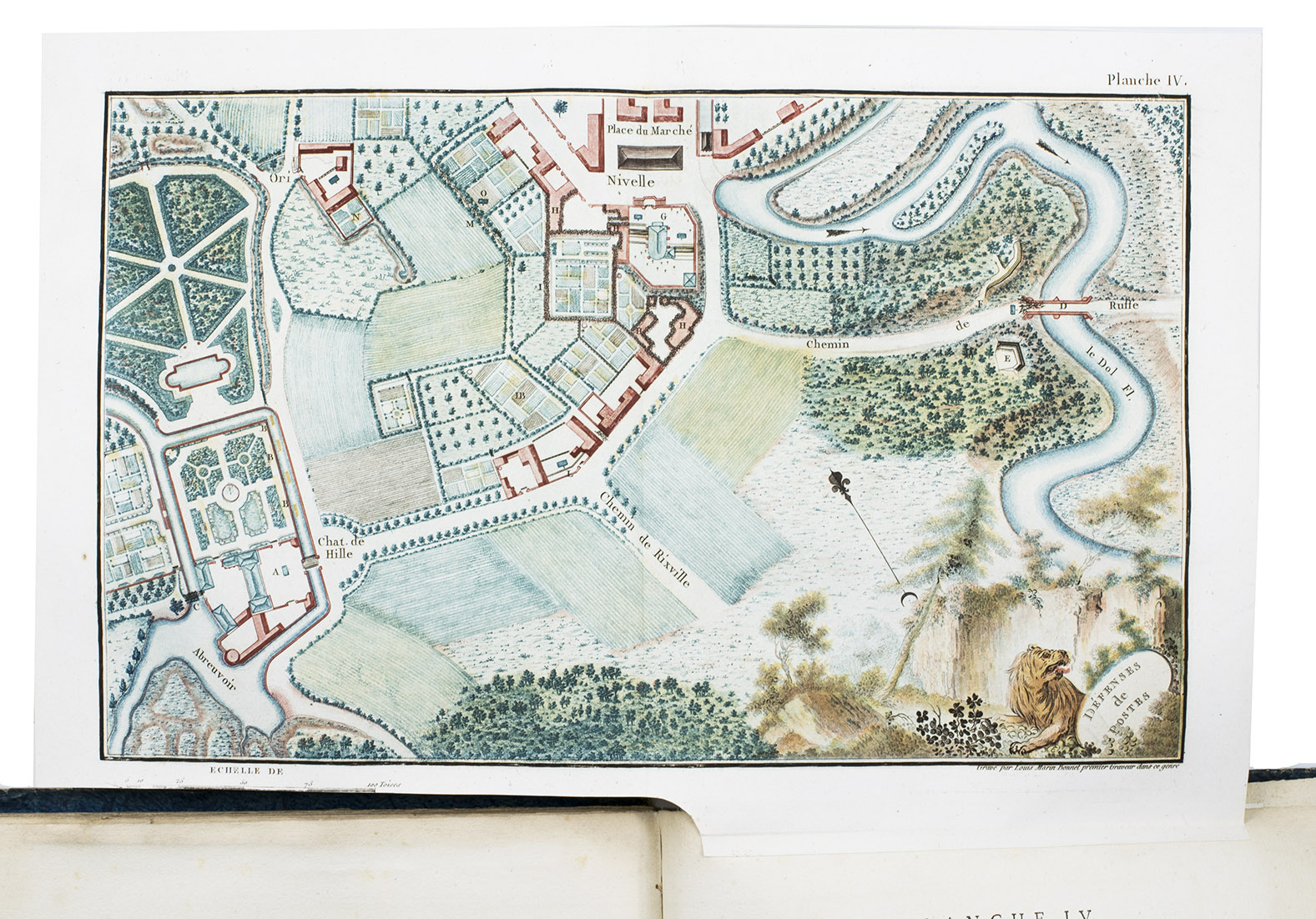 Rare first edition of a manual of military strategy and cartography with elegant illustrations colour-printed in crayon-manner by the inventor of this technique, Louis Marin Bonnet. Charles Louis François Fossé (1734-1812) was a military engineer who distinguished himself in active service during the Seven Years War and as a military cartographer. The present work is a manual for the defence of and attack on small military positions (like a farmhouse, small forest, bridge etc.). In the second part Fossé explains the rules for charting landscapes and buildings on military maps, including the meaning of the different colours, and how to indicate the shooting range of the positions. The 11 topographic maps follow the main text, each hinged to the head margin of a letterpress caption page (verso blank) with an extensive list of features in the plates, keyed to them by letters and/or numbers. The maps fold up (and the folding ones then open out to form a double page) so that the reader can view the map above the
