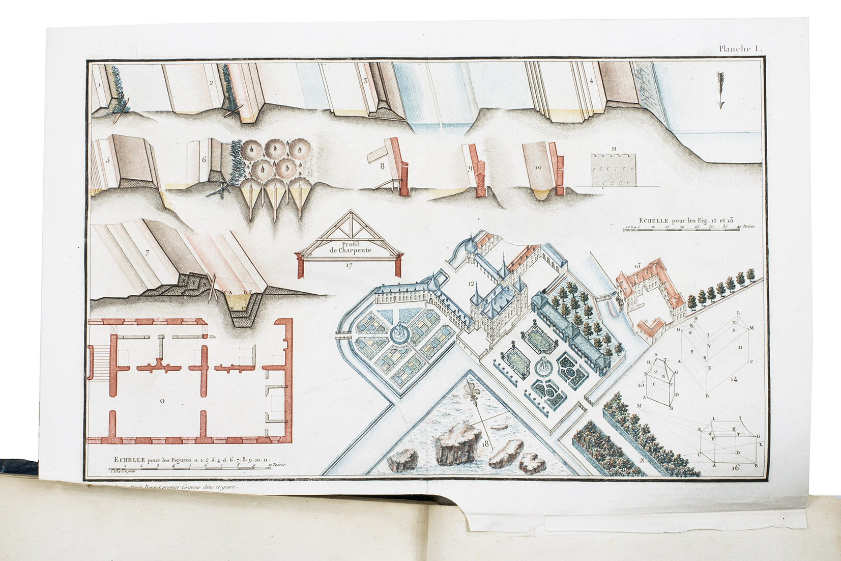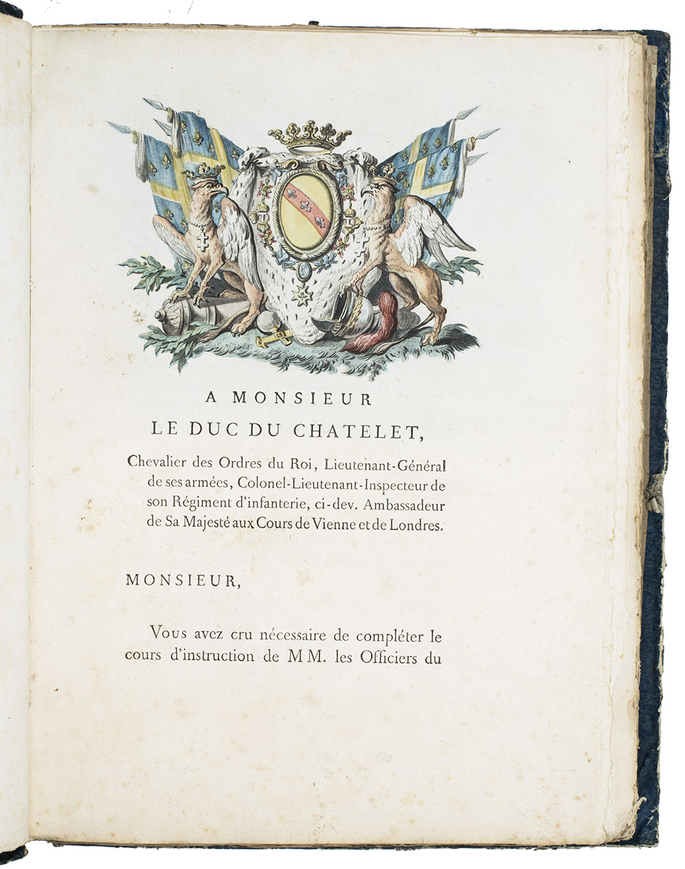 Paris, François Ambroise Didot l'ainé, 1783. 2 parts in 1 volume. Large 4to. With 11 colour-printed crayon-manner plates (10 folding) by Louis-Marie Bonnet, 1 similar armorial headpiece for the dedication to the army general and diplomat Louis Marie Florent, Duc du Châtelet (1727-1793), Didots woodcut device on title-page ("FAD" in clouds with putti and garlands, "[Pierre Charles] Jombert inv. Milliere sculp. 1782"). Contemporary boards covered with blue paper, untrimmed and with some bolts unopened. [14], 116, 60, [24] pp.