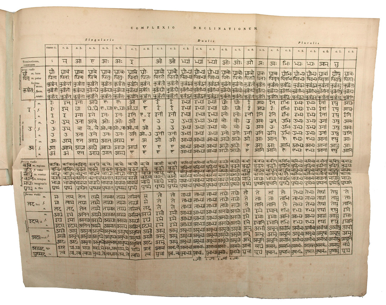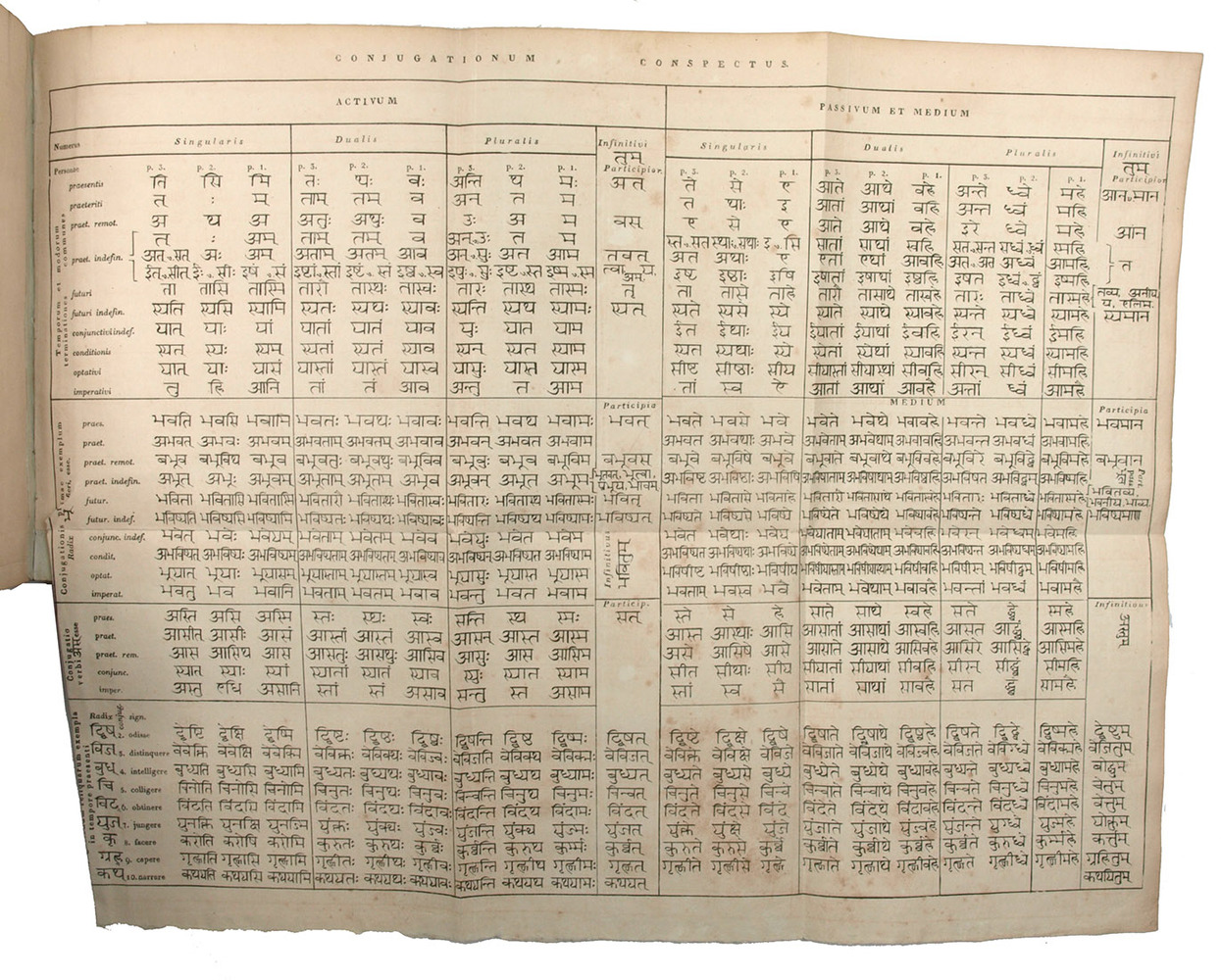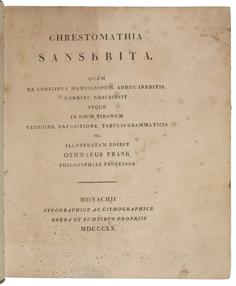 Rare; one of the first Sanskrit works published in Germany. Lithographed throughout (with the exception of a single letterpress page at the beginning of part 2) and published at the authors expense: "Alles über Umdruck lithographisch gedruckt" (Winkler). It contains the earliest (partial) edition of the Bhagavadgita (in part 2), pre-dating August Wilhelm Schlegels edition - admittedly better printed - by several years. The former Benedictine monk Frank (1770-1840), an admirer of Persian philosophy, studied oriental languages in Paris and London. In 1821 he took the chair of Indian and Persian at Würzburg University and went to Munich in 1826 as Professor of Sanskrit. In spite of his pioneering work, he exerted little influence on the development of linguistics and Sanskrit studies, probably due to his penchant for mysticism and his laboured, nebulous prose (cf. ADB).