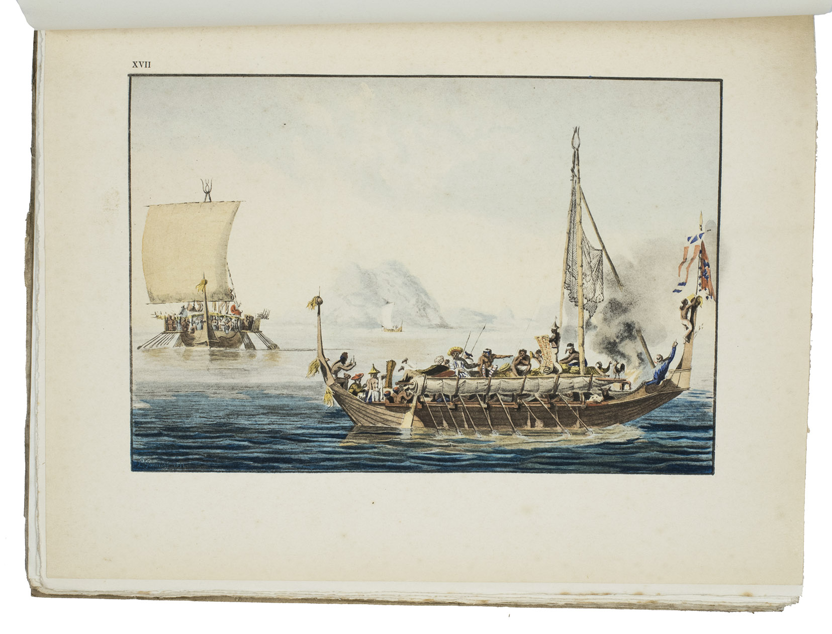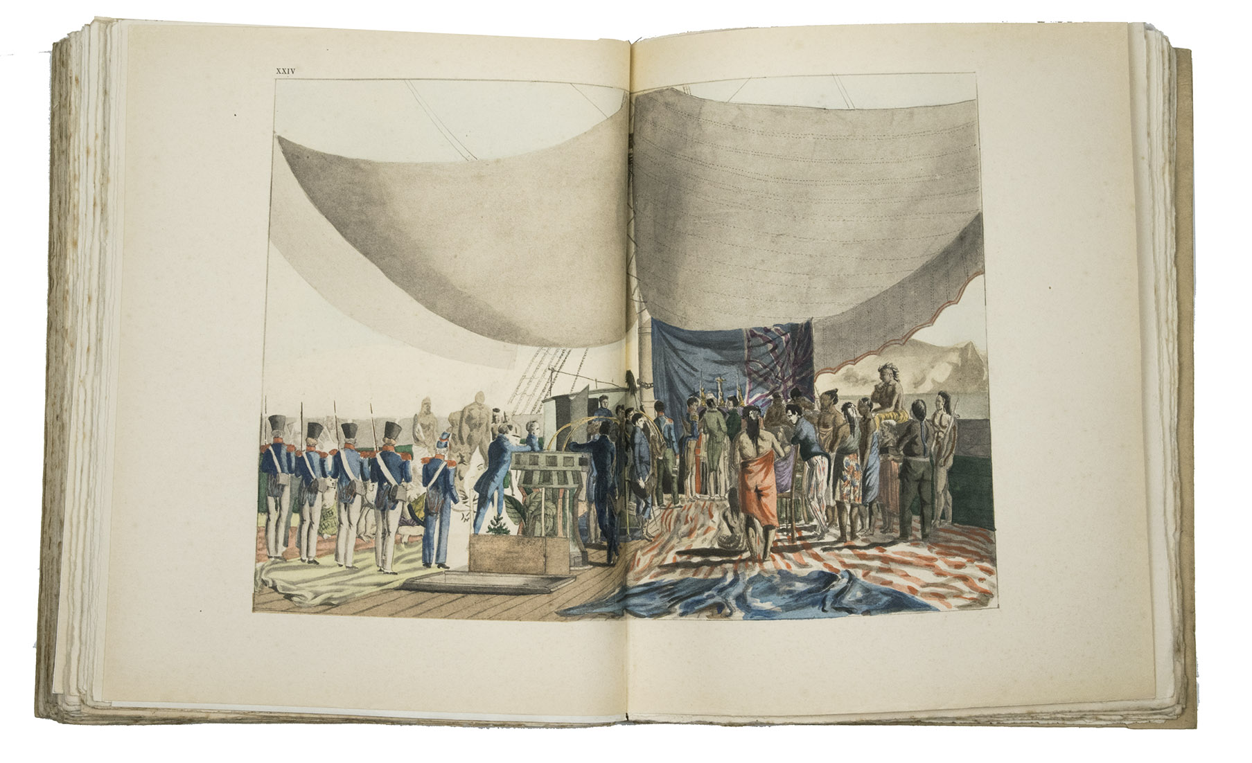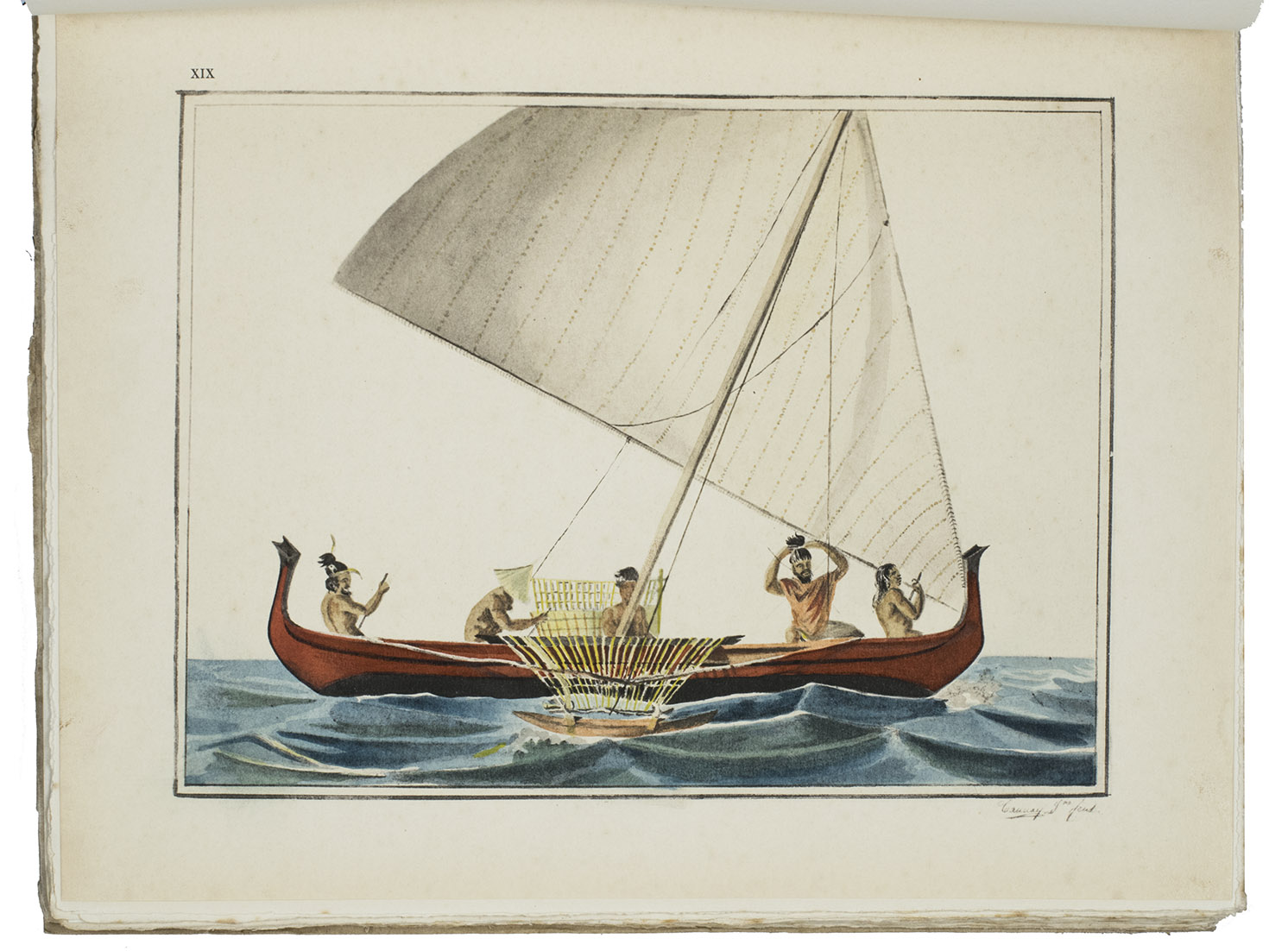 Paris, Société d'Éditions Géographiques, Maritimes et Coloniales (colophon: Chartres, printed by Durand), 1927. Large 4to (28.5 x 23 cm). With 1 map and 25 full-page plates, 13 colour-printed and 3 double-page (plate 7, 24 and 25), all after designs by Jacques Arago, the official artist of the voyage. Original publisher's paper wrappers. [2 blank], XIII, [1 blank], 190, [2] pp.