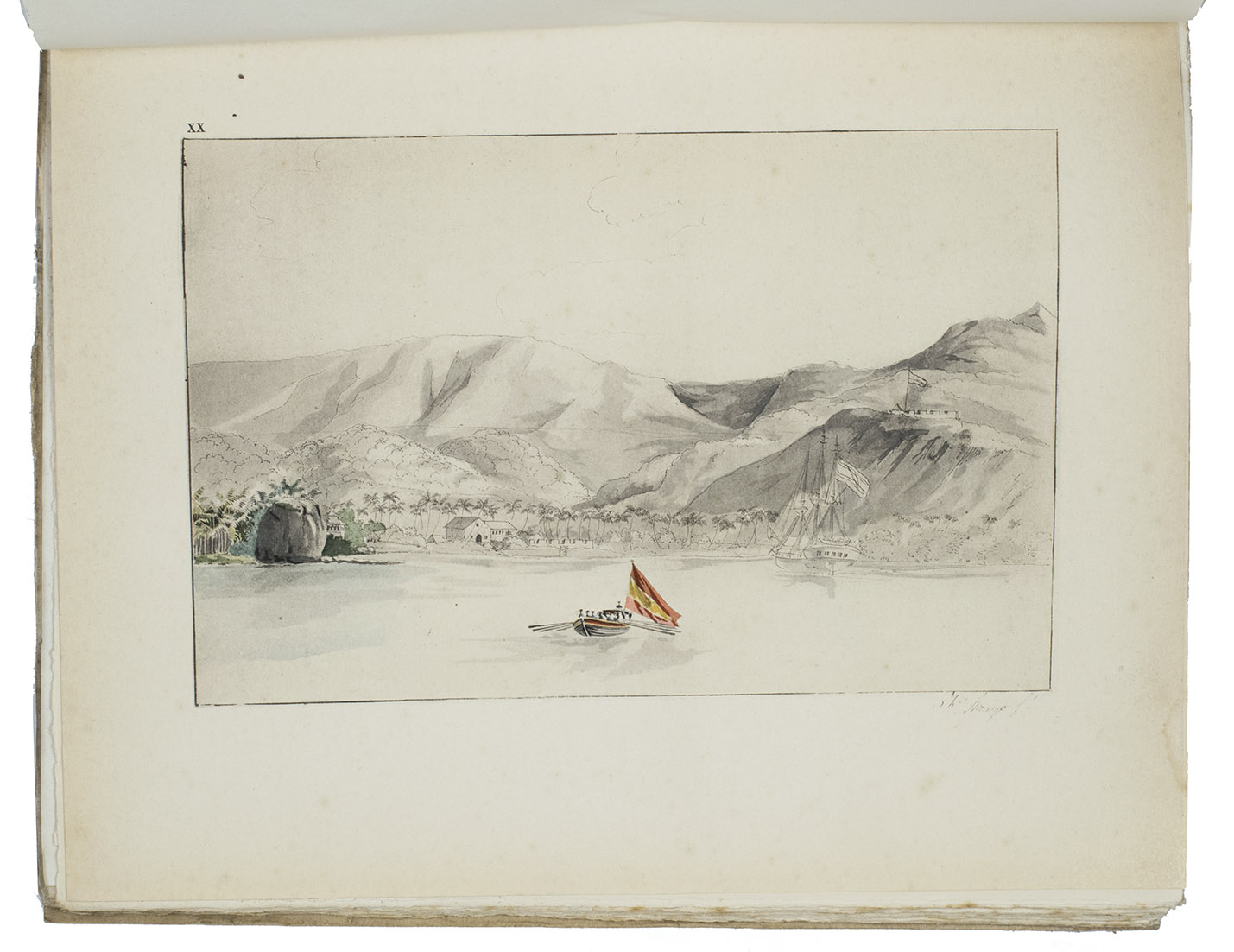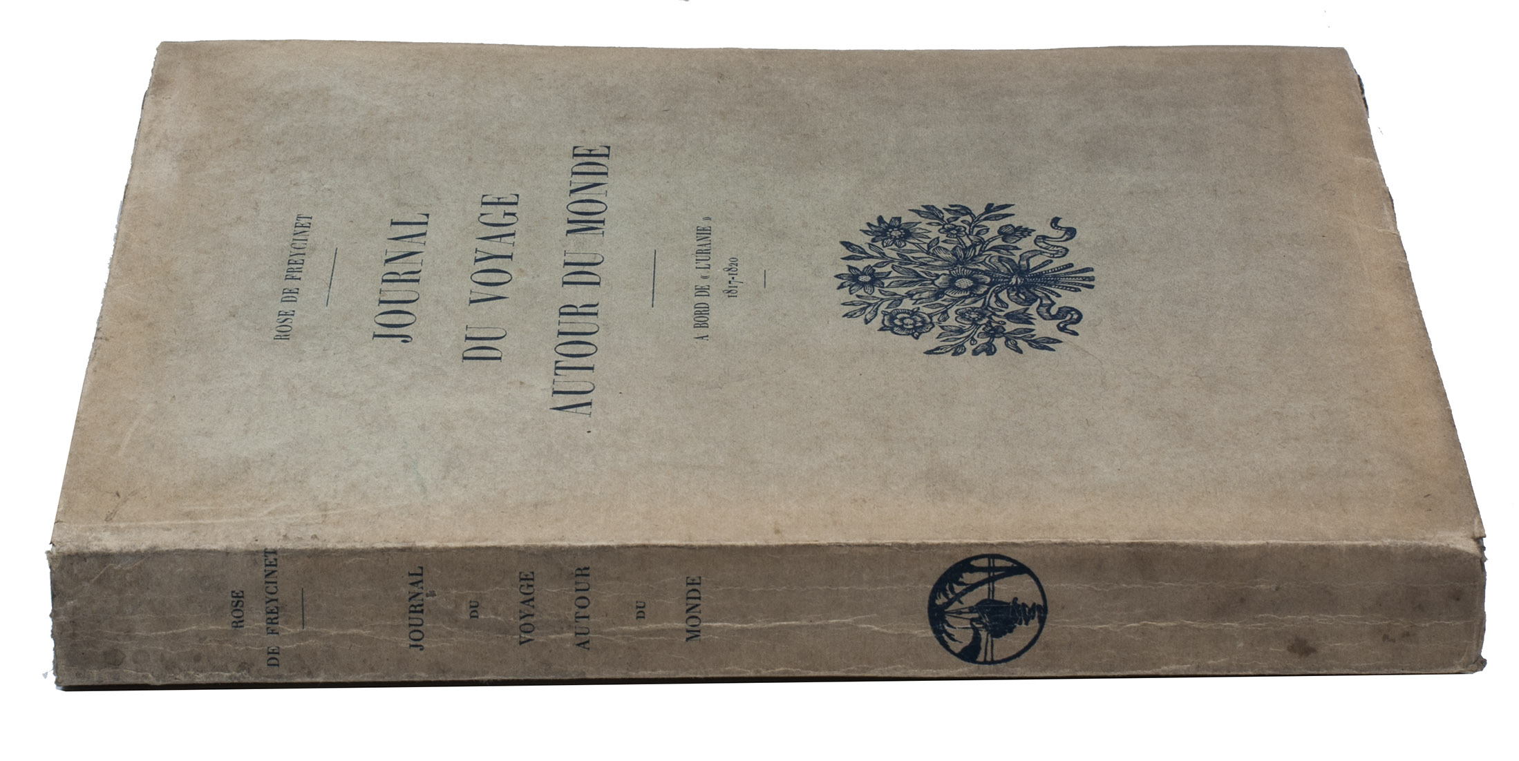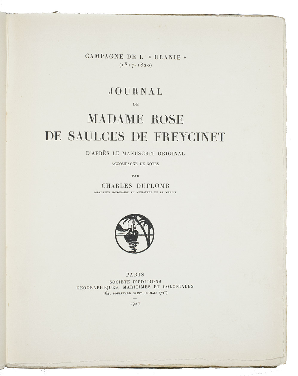 First edition of the letters written to a friend by Rose de Freycinet (1794-1832) aboard the ship named Uranie. Her husband, the great French explorer Louis Claude Saulces de Freycinet (1779-1841), smuggled her onto the ship when setting out on a voyage around the world in 1817. The French government, under the restored monarchy, organized the expedition to show the flag around the world and to make scientific observations on geography, magnetism and meteorology. Captain Freycinet himself published the official journal of the voyage, and the ships doctors Quoy and Gamard, and pharmacist, Gaudichaud contributed special zoological and botanical studies made during the voyage. Jacques Arago, the artist of the expedition, also published and beautifully illustrated a more popular and entertaining account. The present book is illustrated with his plates. The captain's wife, Rose, who secretly joined the voyage, wrote each day to her friend Caroline de Nanteuil. Her letters are here published for the first time, edited by Charles Duplomb, with an introduction by one of the captain's descendants, Baron de Freycinet, dated at Laage, August 1925. The expedition, equipped for a scientific circumnavigation, sailed in 1817 and visited Gibraltar, Tenerife, Rio de Janeiro, the Cape of Good Hope, Mauritius, Australia, Timor, the Caroline Islands, Hawaii, New South Wales, etc. After a shipwreck near the Falkland Islands, Freycinet bought another ship from Americans which he baptised Physicienne, and sailed home, arriving in 1820. It was one of the most important voyages of exploration of the early 19th century, and Rose's charming letters present it from her unique and interesting point of view.
