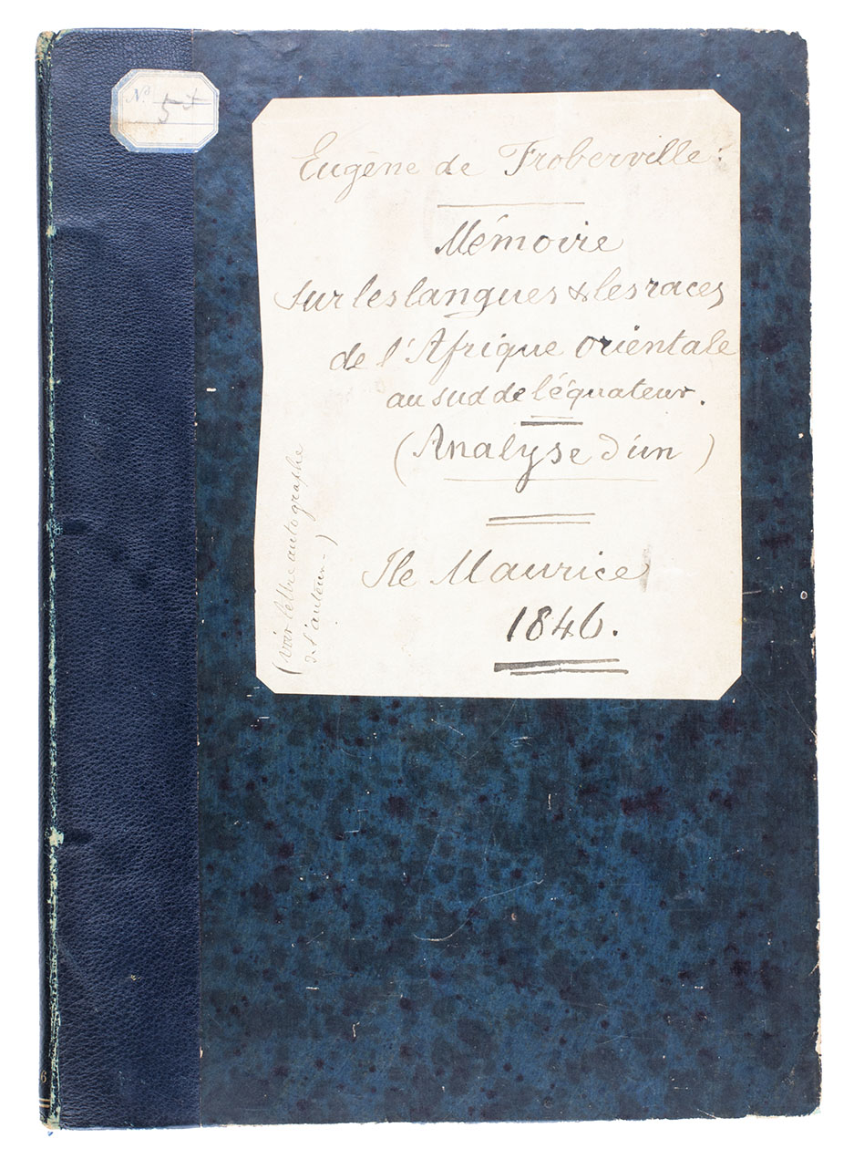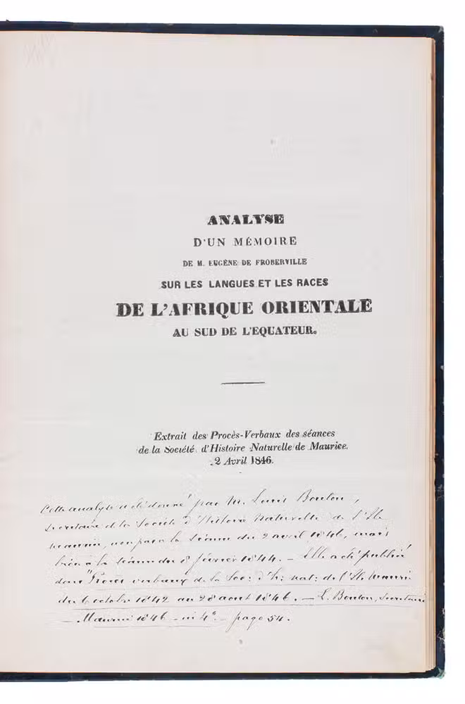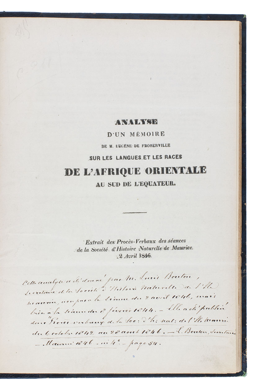 Two offprints discussing the researches of the French ethnographer Eugène de Froberville (1790-1871) in Mauritius on the languages and races of sub-equatorial East African, the first one published in Mauritius. The first is especially interesting, because it is an account of a lecture De Froberville gave at the Royal Society of Arts and Sciences of Mauritius, apparently on 8 February 1844, and his lecture does not appear to have been published on its own. The present account, comprising primarily long quotations from De Froberville's lecture (including an 11-page comparative table of East African languages), may therefore be the best record of his lecture.