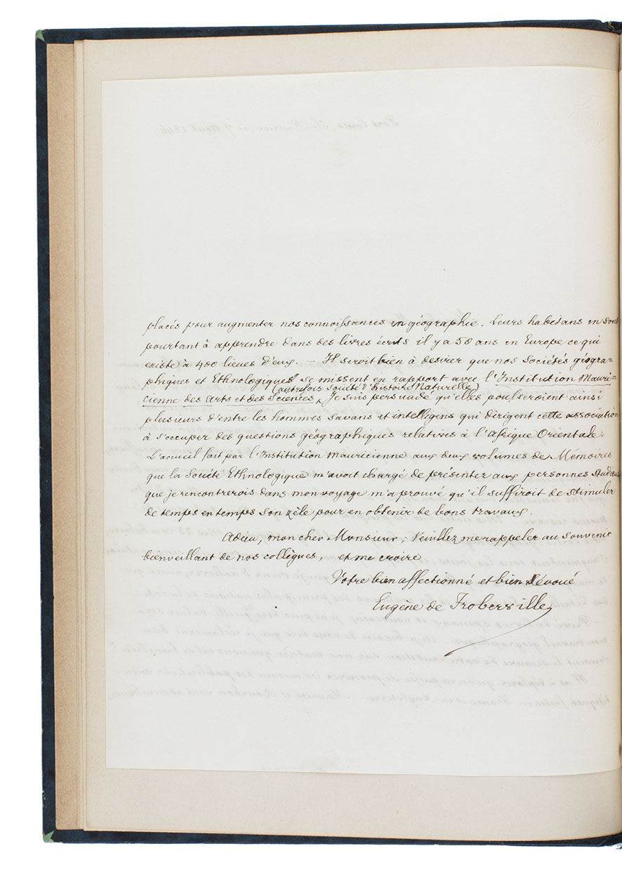 Bound before the offprints is a signed autograph letter from De Froberville, written in Port Louis, Mauritius, on 7 August 1846. It does not name the person he is addressing, but it seems likely to have been sent to Louis Bouton concerning his publication of De Froberville's lecture. A signed autograph note by Bouton on the first page of the 1846 offprint identifies him as the author of the parts that are not directly quoted from De Froberville.
