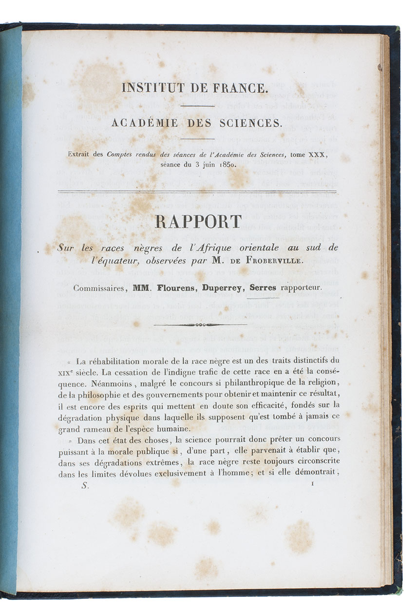 With: (2) FLOURENS, Pierre, [Louis-Isidore?] DUPERREY and Etienne SERRES. Rapport sur les races nègres de l'Afrique Orientale au sud de l'équateur, observées par M. de Froberville.