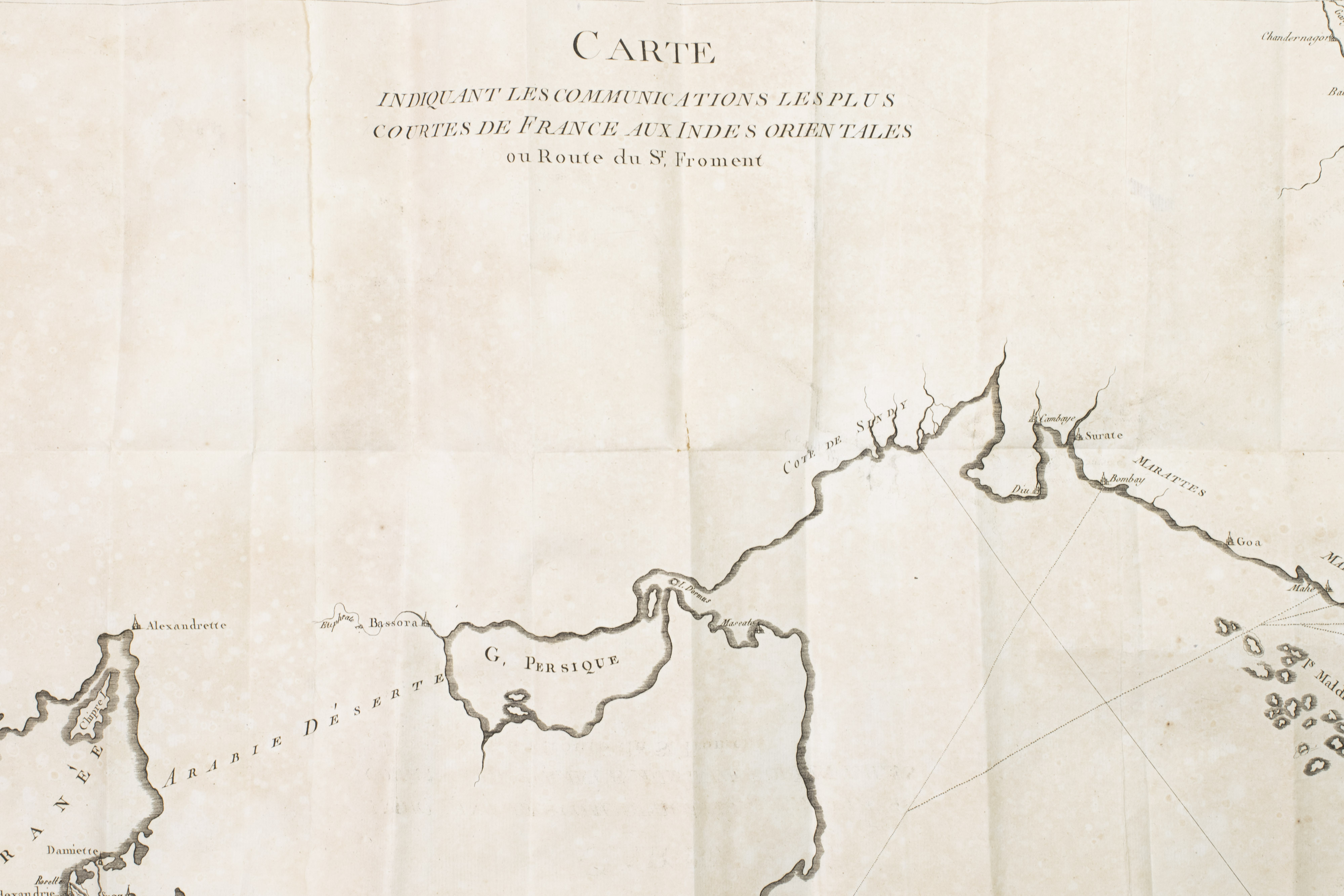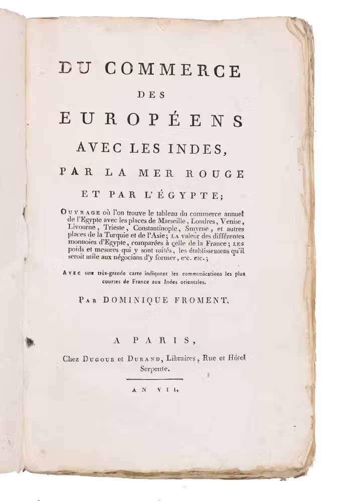 Even before there were any concrete plans to build the Suez Canal, Europeans were highly aware of the fact that India could be reached much faster via Egypt. The French in particular knew that being in control of Egypt could mean being in control of the trade with India. However, when the Ottomans conquered Egypt in the early 16th century, they no longer allowed European ships in the Red Sea. France obeyed, because it preferred to stay at peace with the Ottoman Empire. The British East India Company then was the first to come to an agreement for the use of the route in 1773, gaining a head start on other interested parties. The French were spurred into action as a result and were able to conclude a commercial treaty of their own in 1785. Dominique Froment (dates unknown) was a French merchant who spent many years in Egypt. As such, he was one of the first to make use of this new route and explore what it had to offer, which he details in the present work.