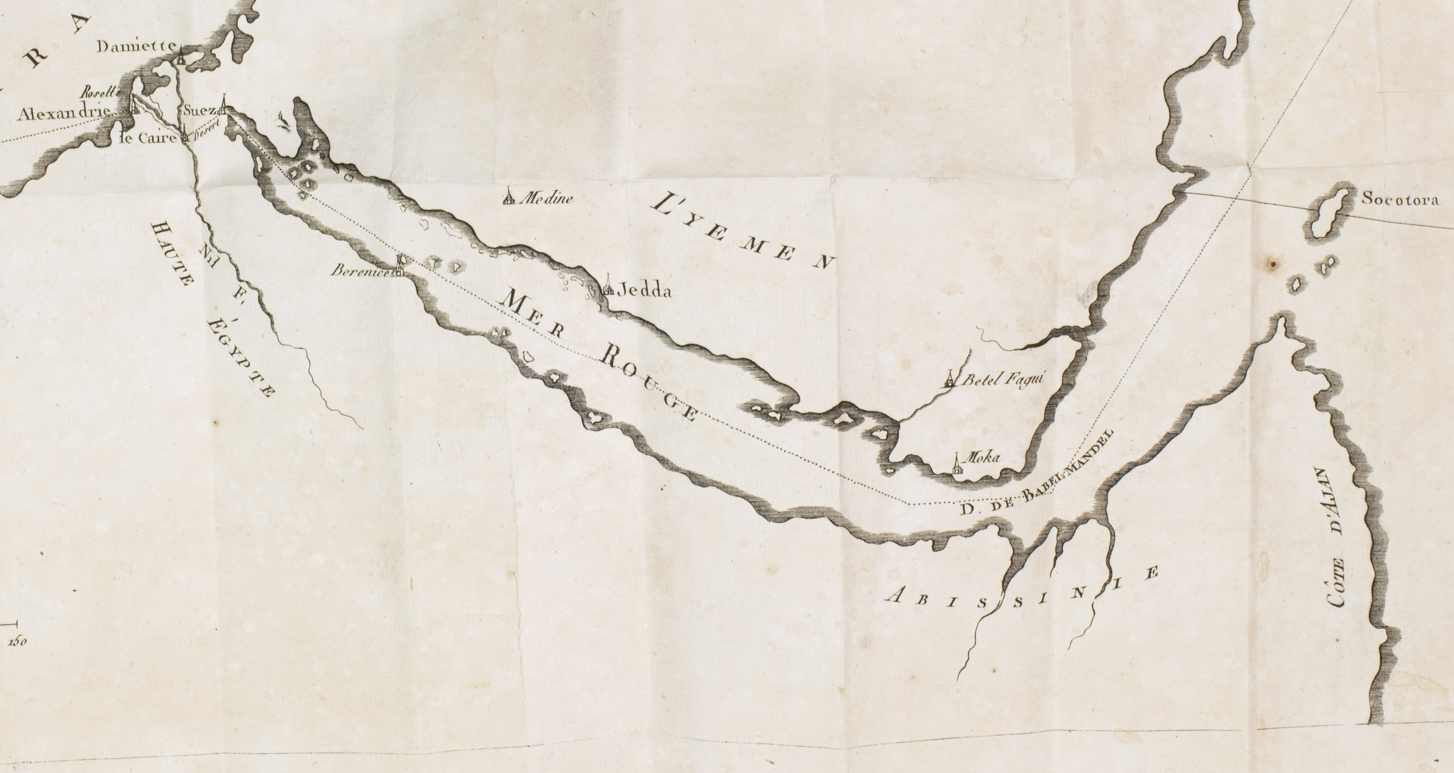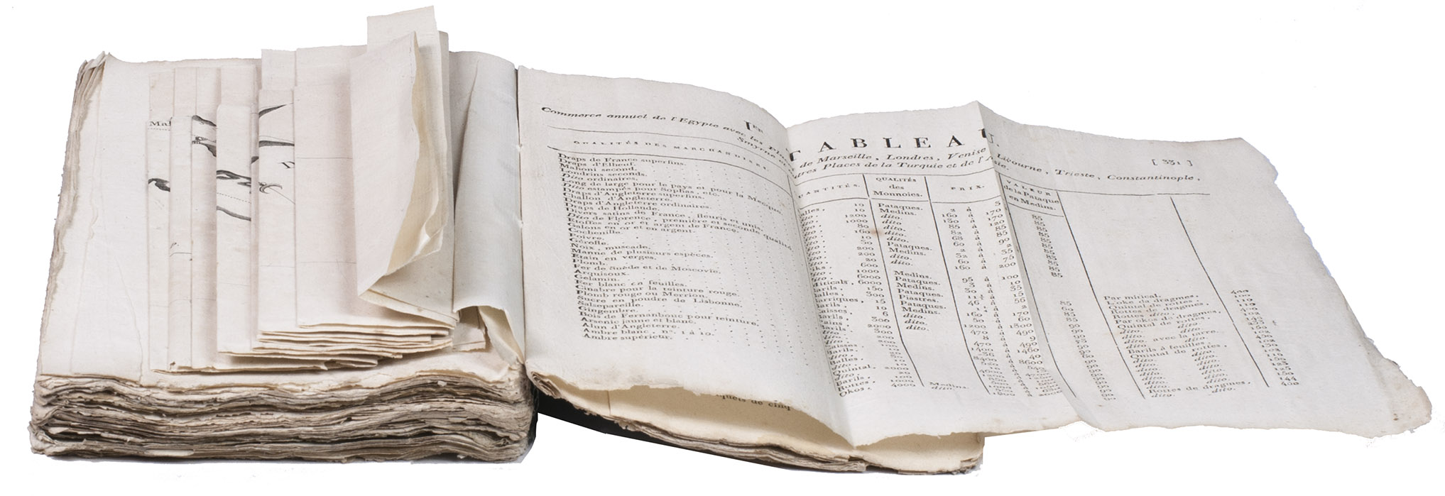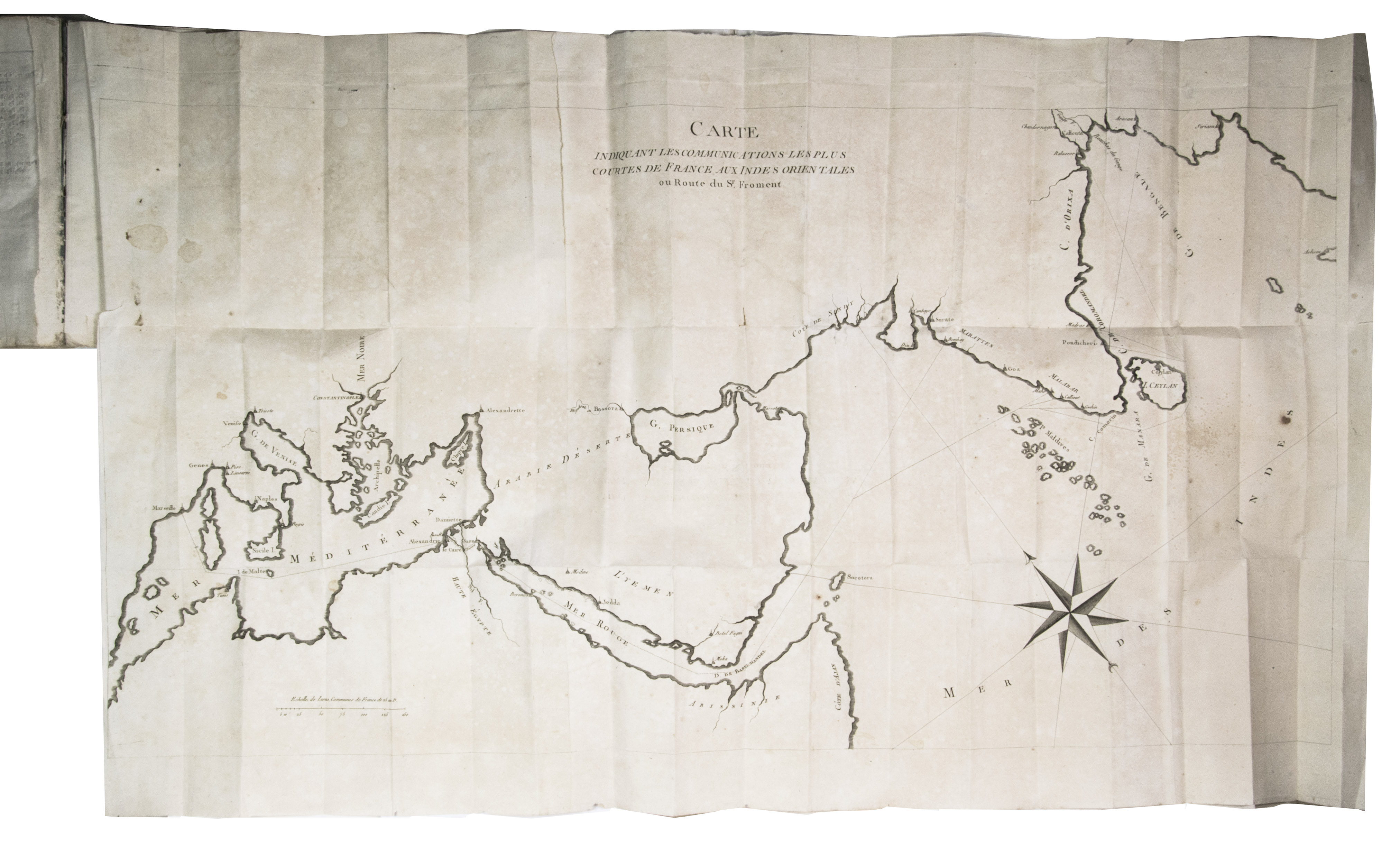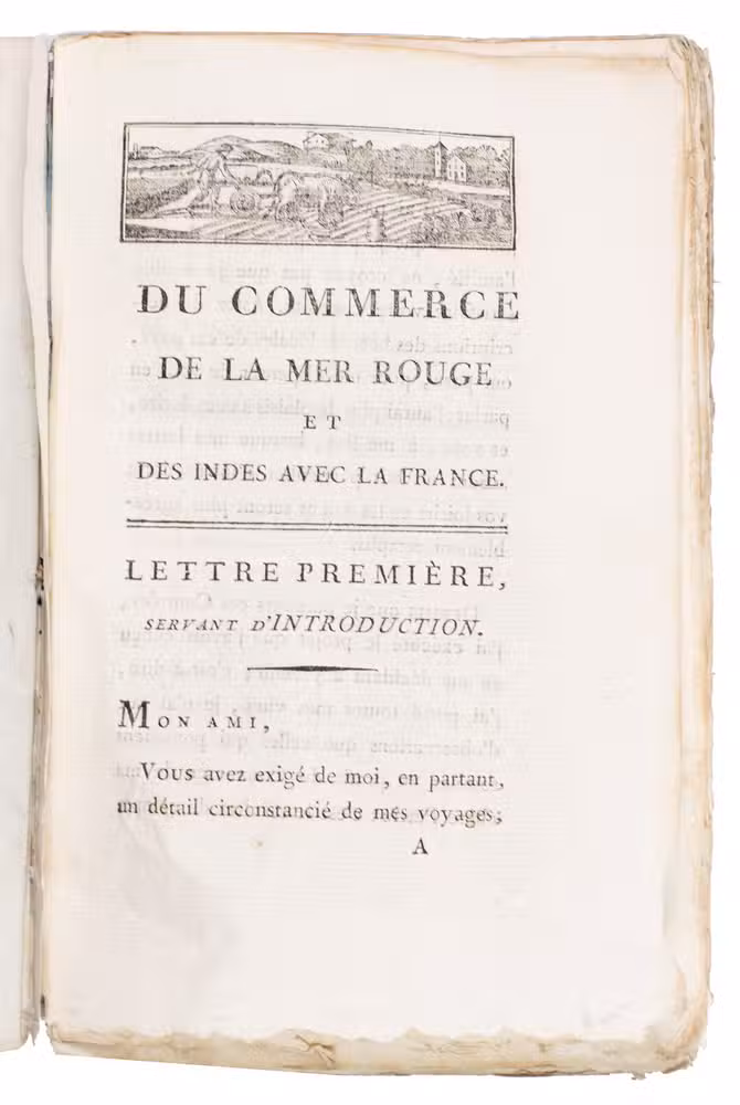 Very rare work about the trade of European countries, especially France, with Egypt and India. It discusses many different goods and their prices, in multiple currencies, the weights and measurements used in Egypt, and offers advice to French traders in the region. The author also explains the new route he uses to reach India from Marseille, namely via Egypt and the Red Sea, illustrated by a very large map. This was before the opening of the Suez Canal (1869), which meant he had to cross Egypt on horseback or with camels. The work is very rare, as we have not been able to trace any copies of it in any sales records of the past 100 years.