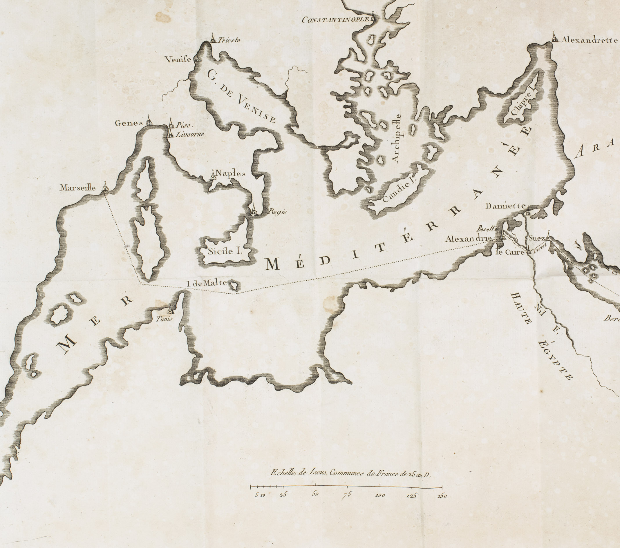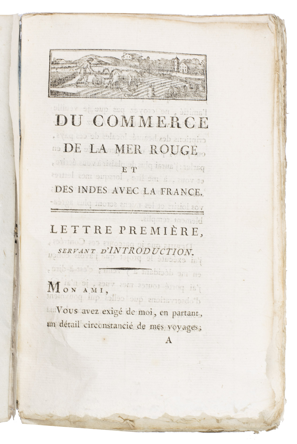 Paris, Dugour et Durant, an VII [= 1799]. 8vo. With a very large, folding map showing the fastest route from France to India (via the Mediterranean, Egypt, the Red Sea and the Indian Ocean), 7 folding tables, and a woodcut illustration at the head of the first chapter. Contemporary dark blue paper wrappers, protected by a semi-opaque coated paper dust jacket. [2], XIV, 211, [1 blank] pp.