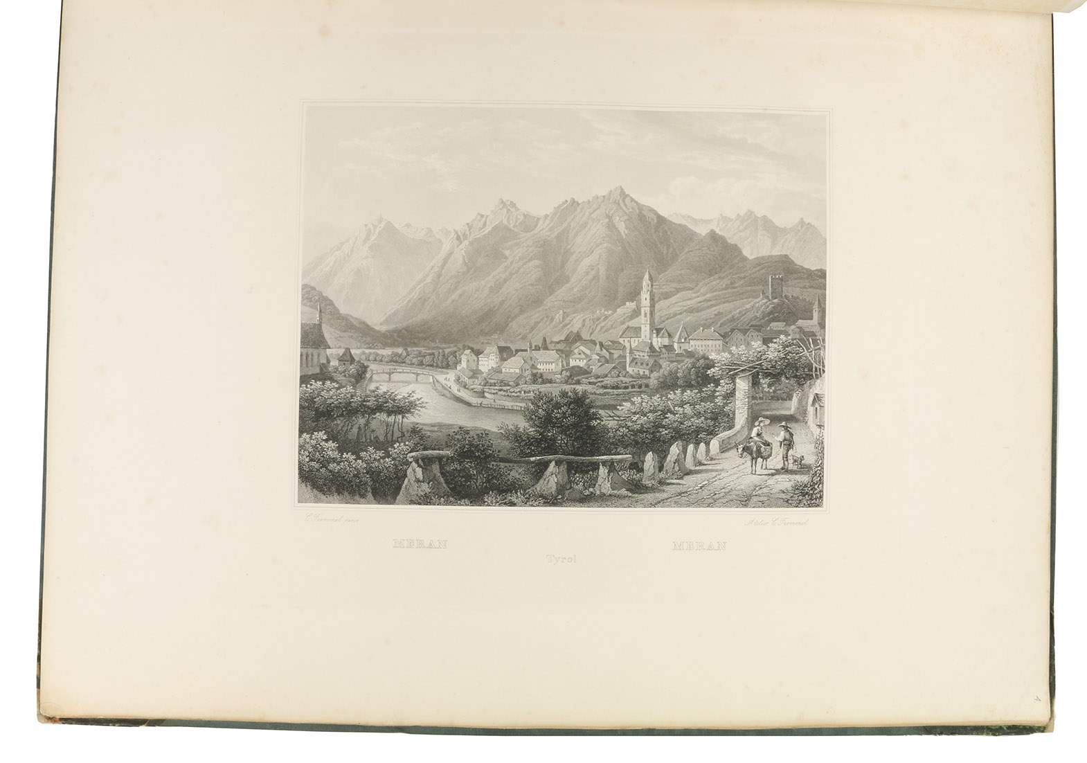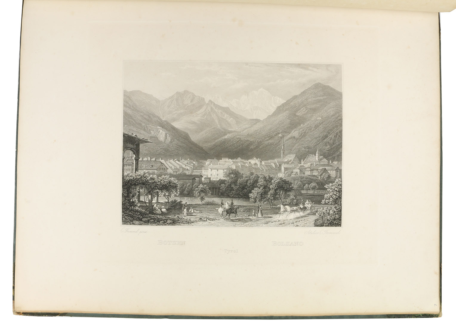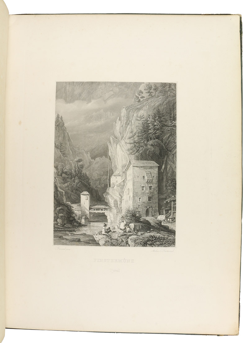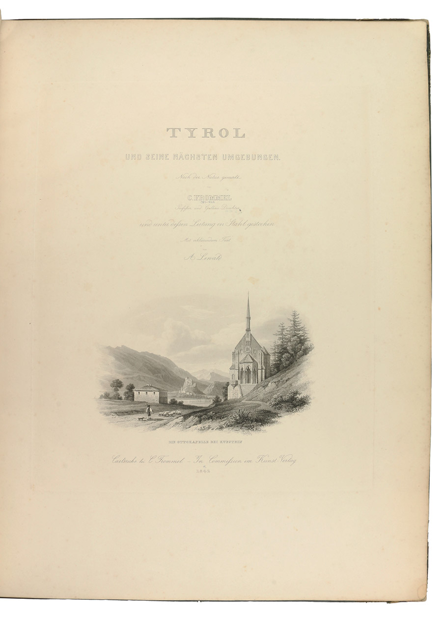 Annual gift (for the past year 1841) for the members of the Kunstverein für das Großherzogtum Baden: a large paper copy of a series of steel-engraved views of Tyrol and vicinity. It includes views of Ambras castle, Berchtesgaden, Bozen, Finstermünz, Hohenschwangau, Innsbruck, Meran, Riva, Salzburg (2), etc. The notes by A. Lewald, bound in here in their entirety, were available only separately, so complete copies with the entire text are very rare.
