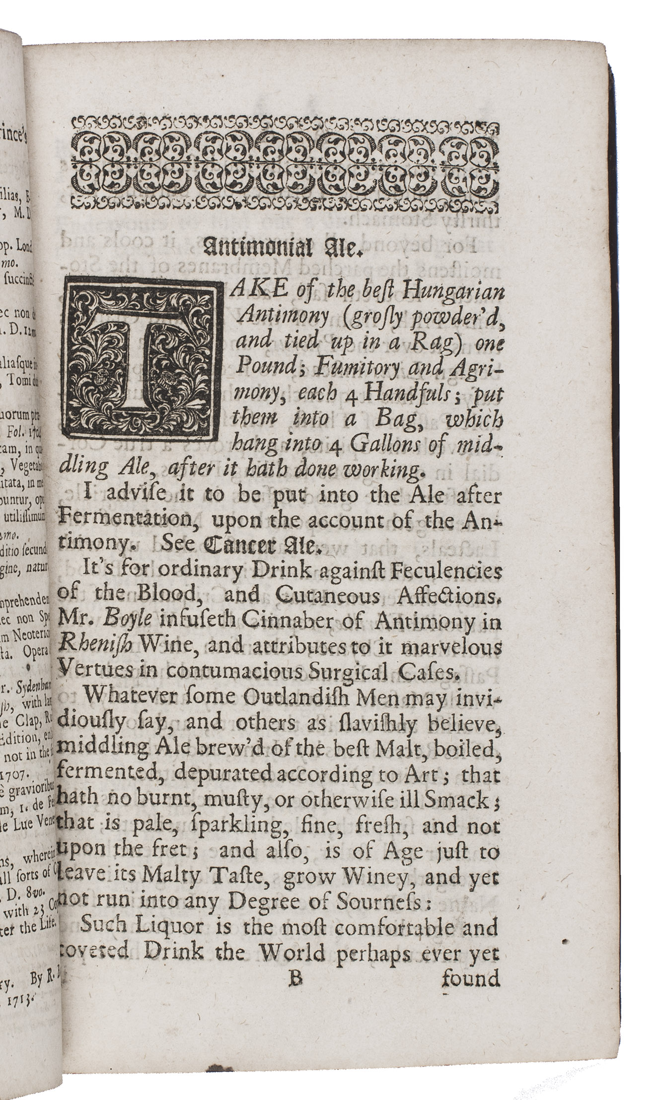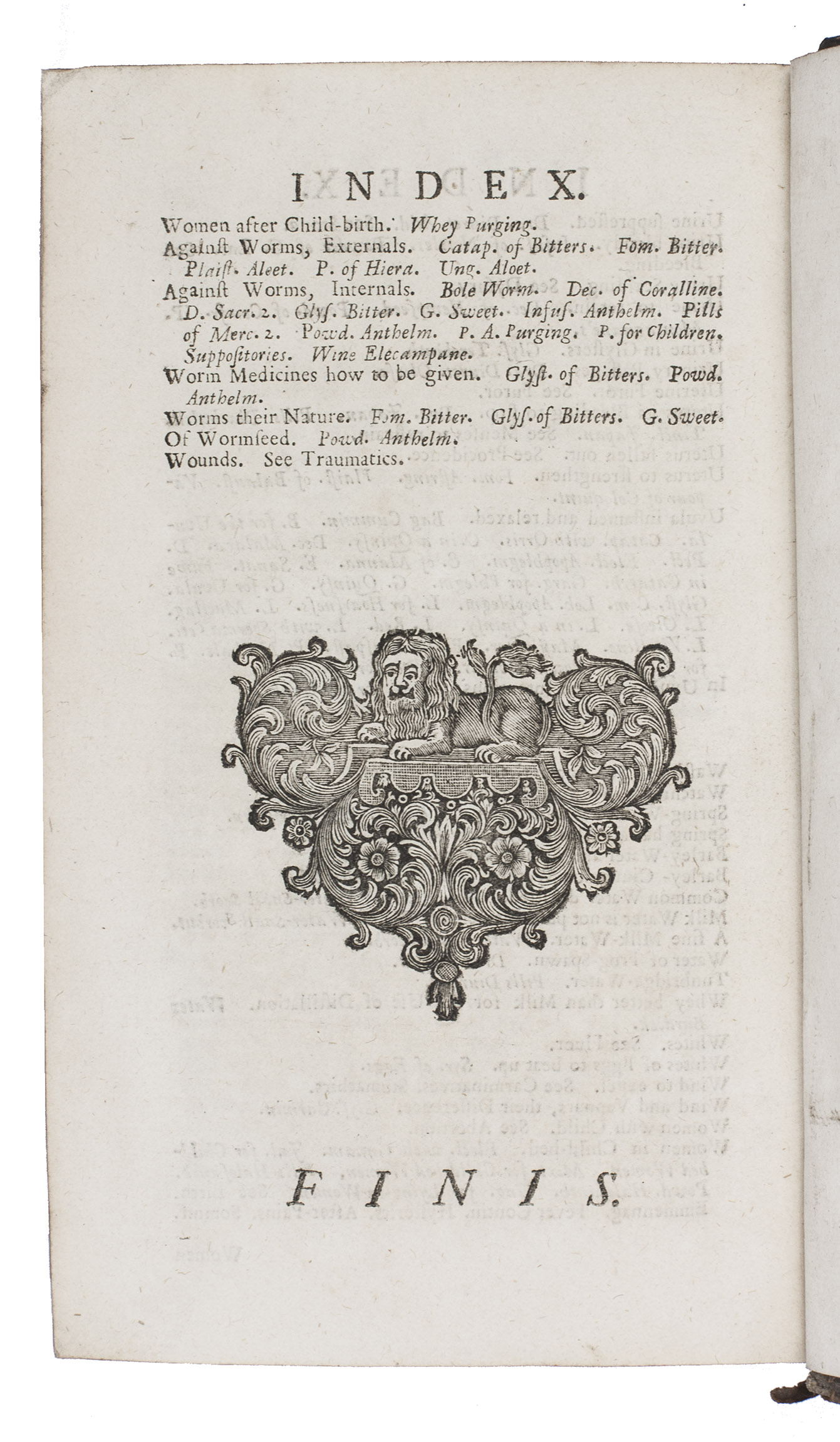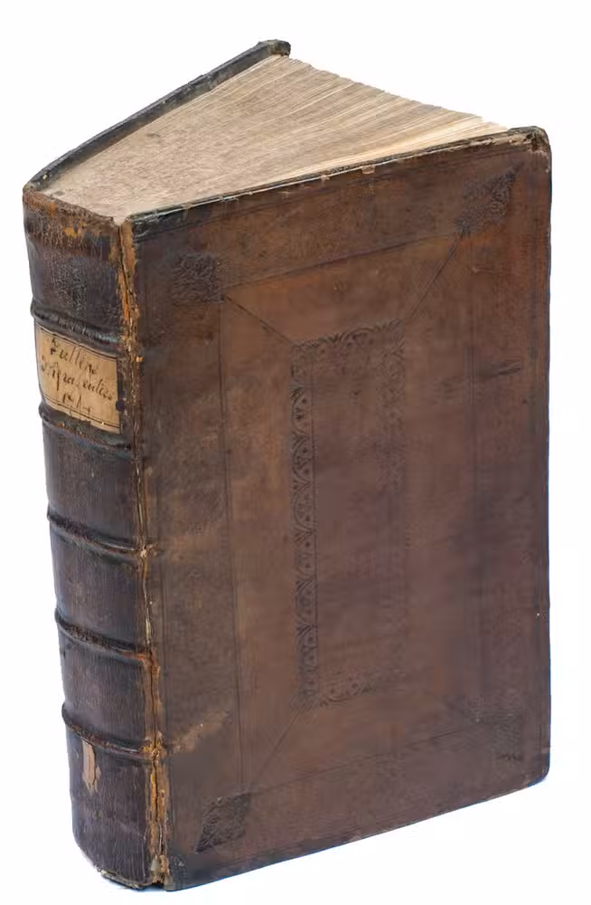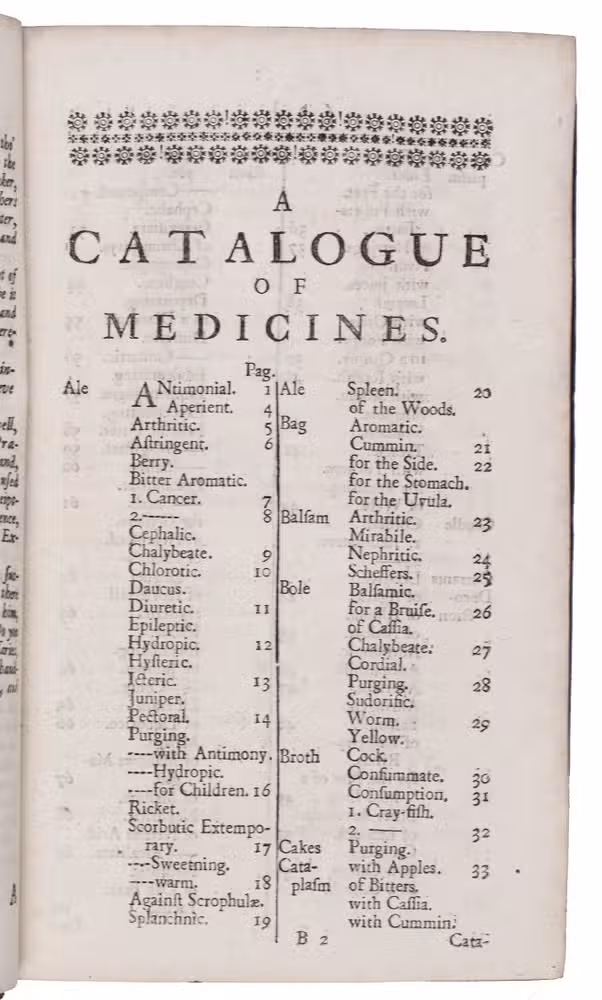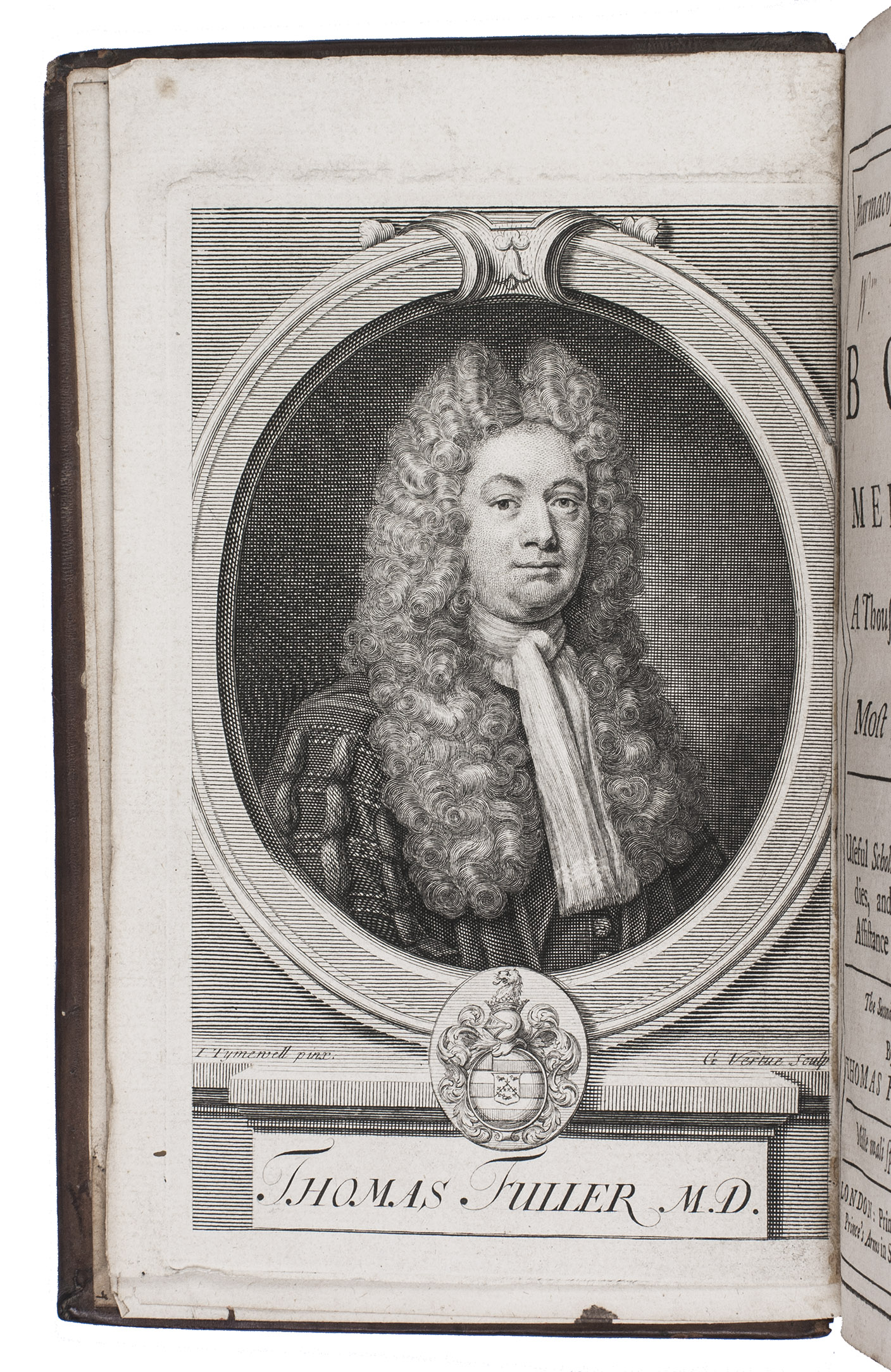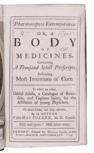 Second edition in English of a popular pharmacopoeia, based on the fifth Latin edition of 1714. According to the introduction, the author had originally compiled "a very great Collection of the best, and neatest Medicines" for personal use, constantly testing and amending the recipes and sharing the manuscript with others. "Now it so chanced, that a certain young Gentleman, a Batchelor in Physick, having gotten one of these, and carrying it into Holland, died and left it there. This unlucky Accident gave me great Uneasiness; for I knew not into what Hands it might fall; and perhaps the Dutch might print it upon me rough as it was, and unprepared for the Press" (A3v). Fuller made a selection from his notes, from which the first Latin Pharmacopoeia extemporanea was published in 1701.