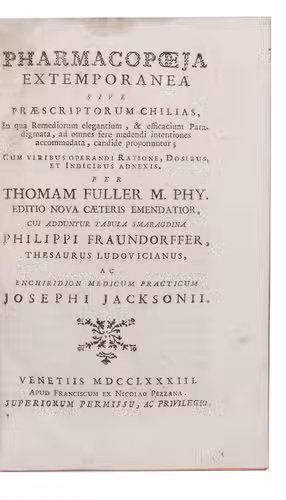 Very rare fourth(?) Venice edition of Fuller's popular pharmacopeia, first published in 1701. All Venice editions include three additional pharmaceutical works: a collection of recipes by Philipp Fraundorffer first published in 1699, Wolfgang Christian's "thesaurus" of the work of Daniel Ludwig first published in 1707 and Joseph Jackson's medical compendium first published in 1698.