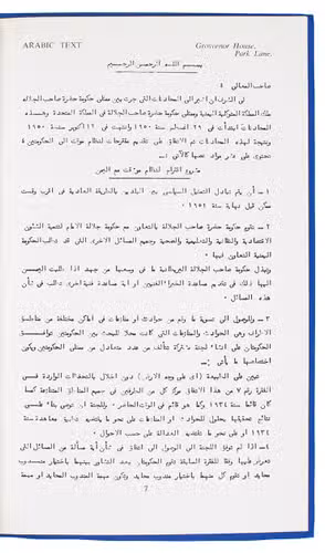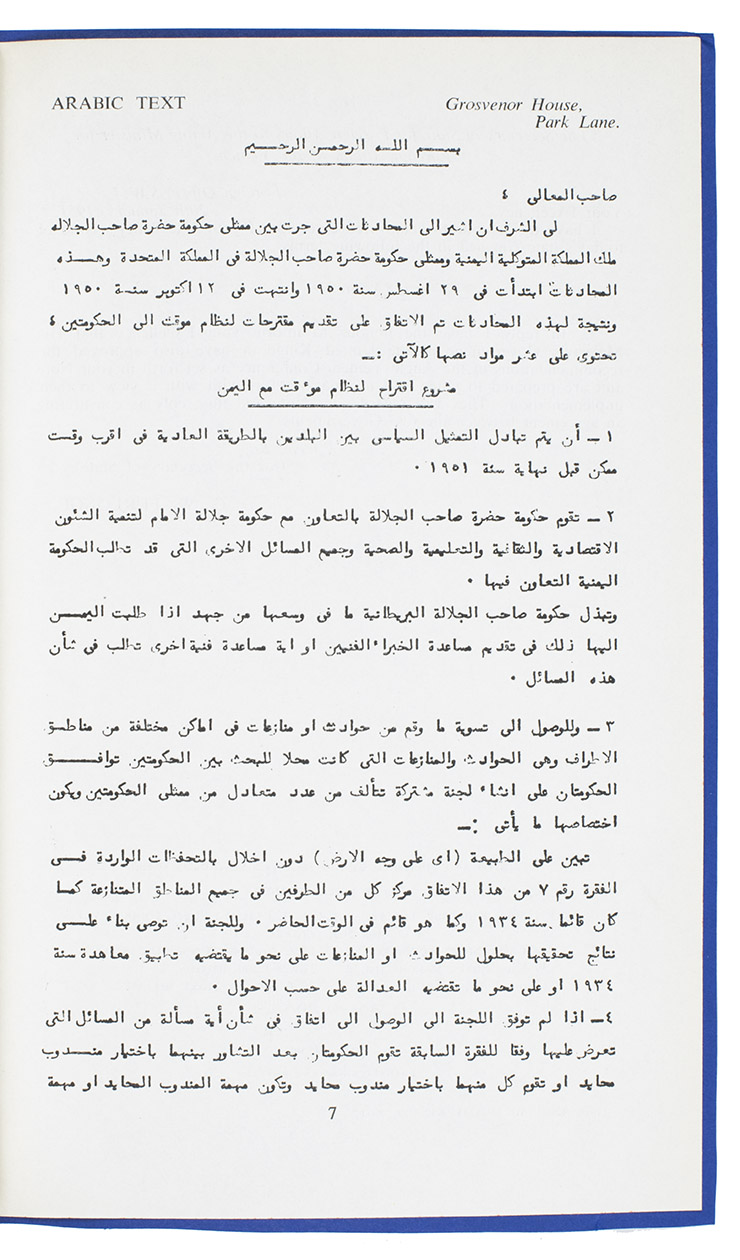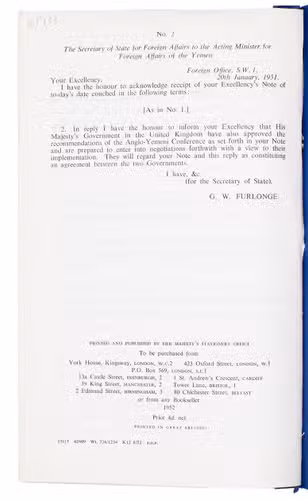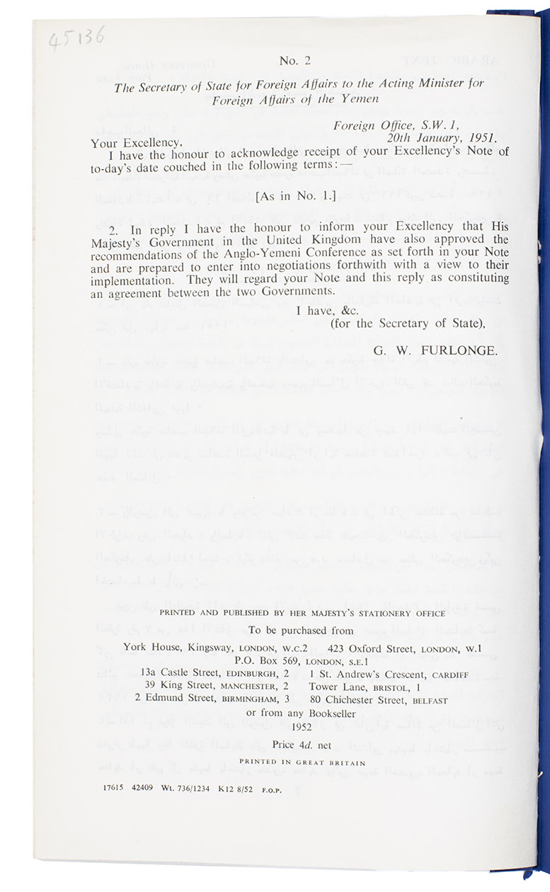 Bilateral treaty between the United Kingdom and the government of His Majesty the King of Yemen, presented to Parliament by the Secretary of State for Foreign Affairs. The negotiations between the governments commenced on 29 August 1950 and ended on 12 October 1950. Some of the terms agreed are: the establishment of diplomatic representation according to normal practice, the settling of incidents and disputes with bordering areas of Yemen, the undertaking of appropriate measures to subdue any propaganda against either government, and more. The main text (with ten numbered points) is signed at the end with the initials of ambassador Sir Geoffrey Warren Furlonge, the UKs acting Minister of Foreign Affairs, and the shorter note that follows by "Alkadi" (Qadi) al-Amri, acting Foreign Minister of Yemem. The texts are repeated in Arabic (set in a small Naskh type) before the closing statements.