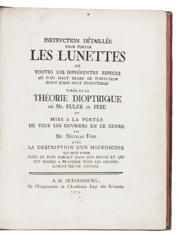 Instruction détaillée pour porter les lunettes de toutes les différentes especes au plus haut degré de perfection dont elles sont susceptibles tirée de la théorie dioptrique de Mr. Euler le pere et mise a la portée de tous les ouvriers en ce genre. Avec la description dún microscope qui peut passer pour le plus parfait dans son espèce et qui est propre à produire tous les grossissemens qu'on voudra.