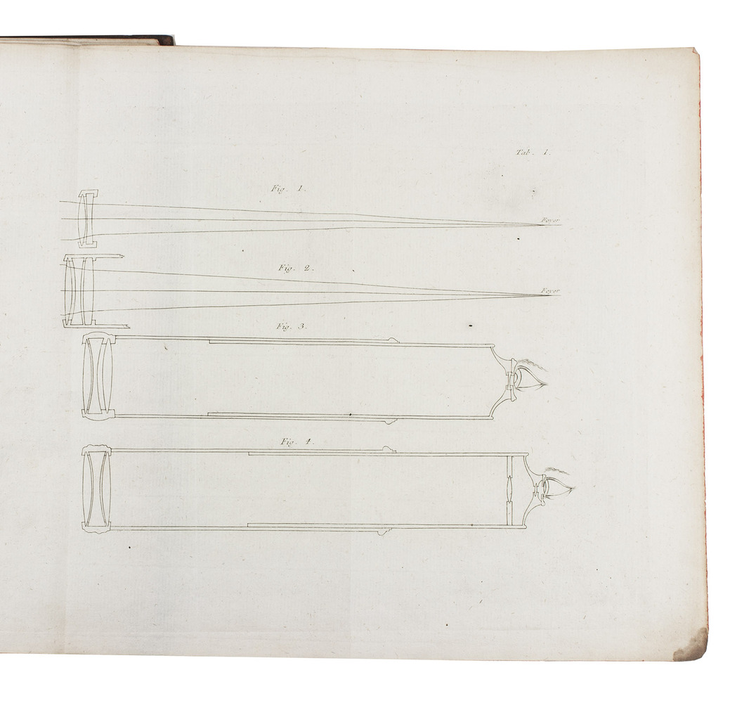 First and only edition of an important manual on the construction of telescopes and microscopes, the first publication by Nicolas Fuss (1755-1826), who grew up in a modest Swiss family but was to become one of the leading mathematicians and astronomers of his generation. The majority of Fuss's writings present solutions to problems raised by Leonhard Euler, in the fields of mathematics, mechanics, astronomy and geodesy. Euler's memoirs had been published earlier, but they were inaccessible to most people working in optics. Fuss published the present work, giving a very simple and rather schematic résumé of Euler's work. He listed "a number of formulae for the construction of telescopes with a magnification of five to fifty times, for achromatic telescopes with three lenses and a magnification from 25 to 320 times, and for achromatic telescopes with four or five lenses" (Daumas). Fuss gave all the necessary theoretical measurements for constructing these instruments. It ends with a description of a microscope with an achromatic objective of three lenses.