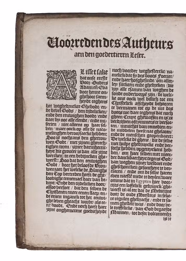 Rare first and only edition of the Dutch translation of the Artzneybuch of Oswald Gabelkover (1538-1616), who was the personal physician to the dukes of Württemberg. It was originally printed in 1589 under the patronage of Ludwig von Württemberg and soon followed by several other editions. The present translation was made by Carolus Battus, a physician in Dordrecht, who was the first to translate medical works into Dutch. He is known as the author of one of the earliest Dutch cookery books, which was published together with his translation of Wirtsung's Arzney Buch (1568) with the confusingly similar title: Medicyn-boeck. Battus present translation served as served as the basis for the English translation The boock of physicke, which was published a year later, also in Dordrecht.