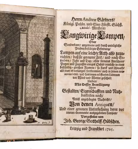 Rare first edition in book form (parts had been published in 1720 in the periodical Berlinische und Cölnische ordinaire Post-Zeitung) of descriptions of lamps capable of burning for prolonged periods without having to be refuelled, invented by the Saxon court mechanic Andreas Gärtner (1654-1727), a cabinet maker and mechanic who had learned his trade during twelve years travel throughout Germany and Italy (Venice, Bologna and Rome). By 1686 he was royal cabinet maker to the Dresden court, and later also royal mechanic. Delighting in complicated mechanical models and devices, he soon became known as the "Saxon Archimedes". Unfortunately, most of his works perished in a fire at the Wackerbarth Palace in 1728. Gärtner's famous world clock (ca. 1700), boasting 365 dials, survives and still draws crowds at the Zwinger (palace and grounds) in Dresden. The frontispiece shows some of his newly-invented lamps.