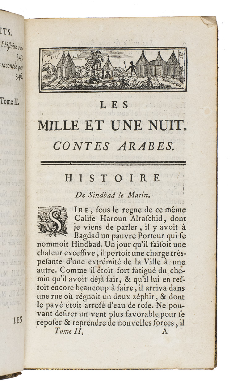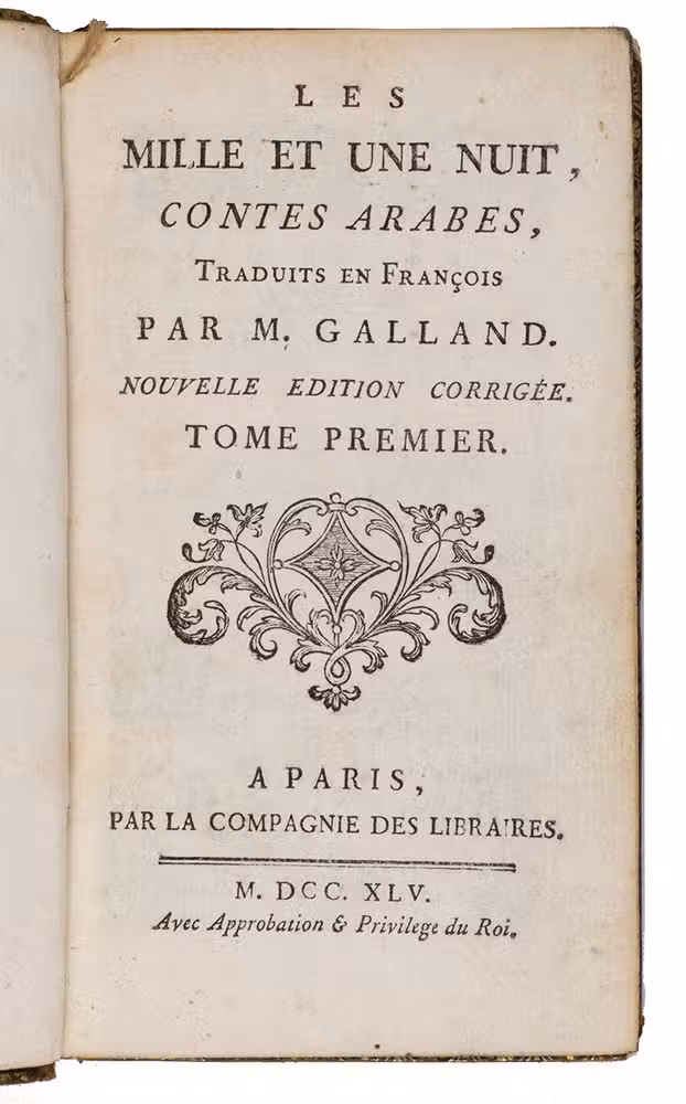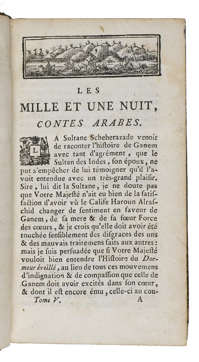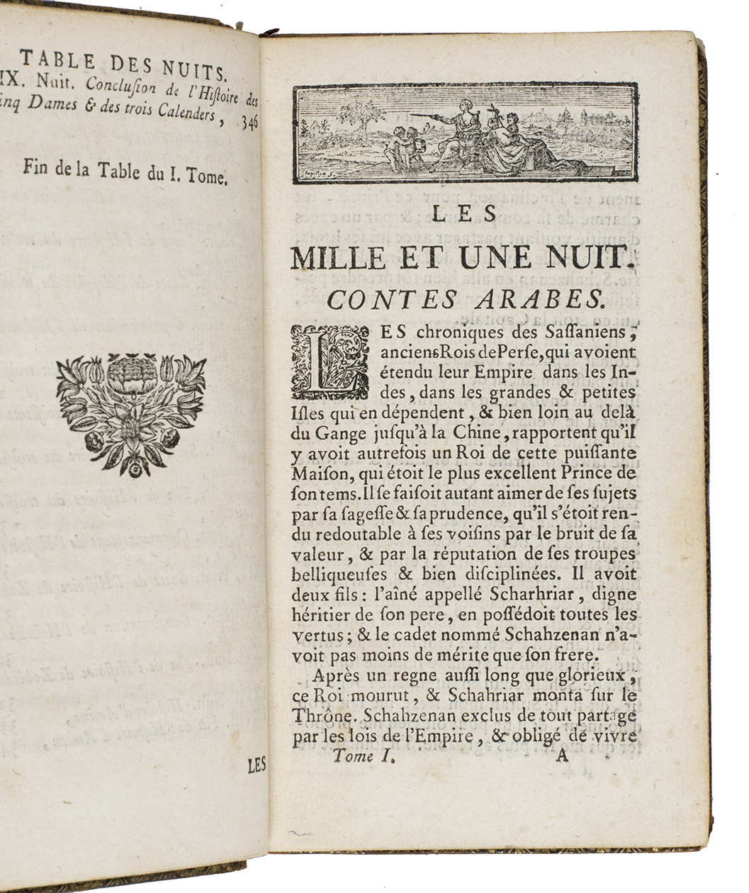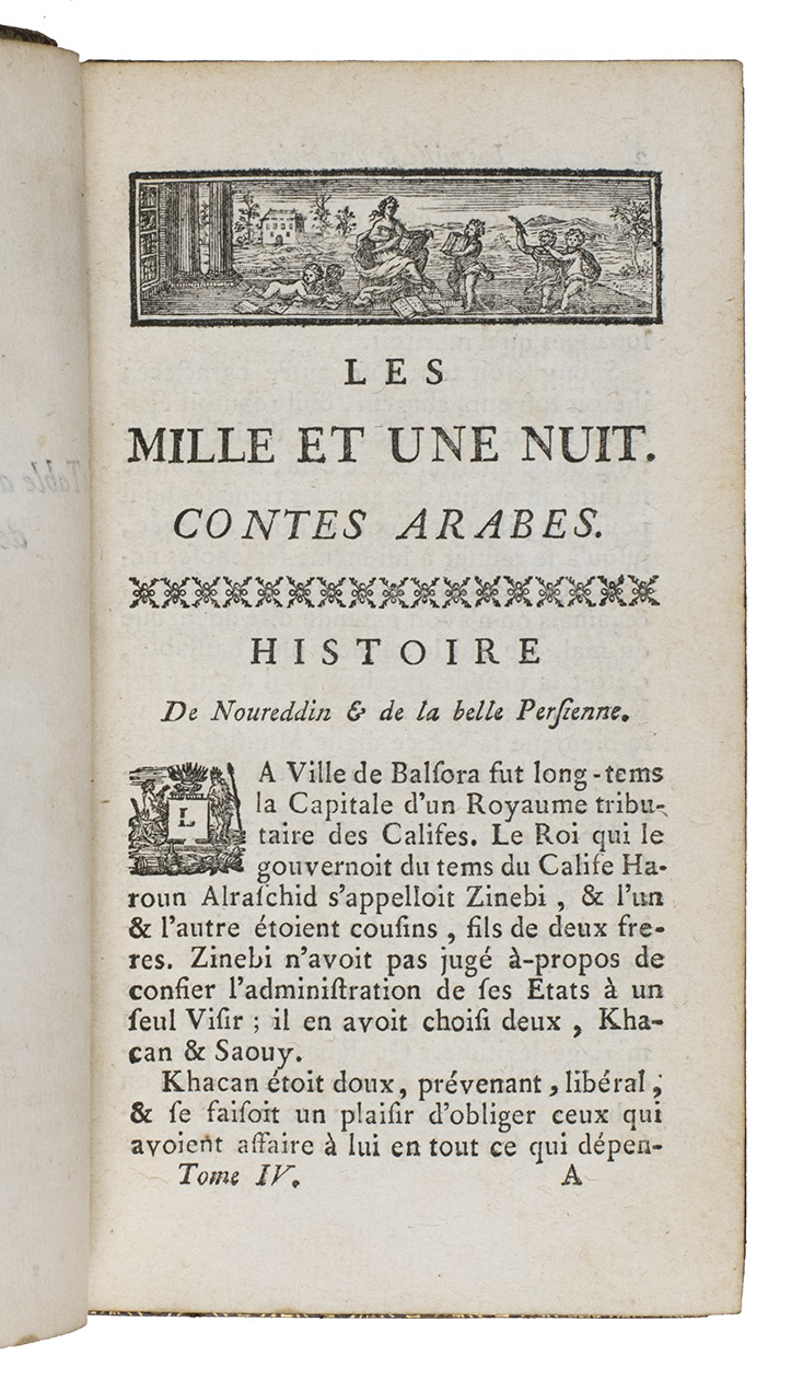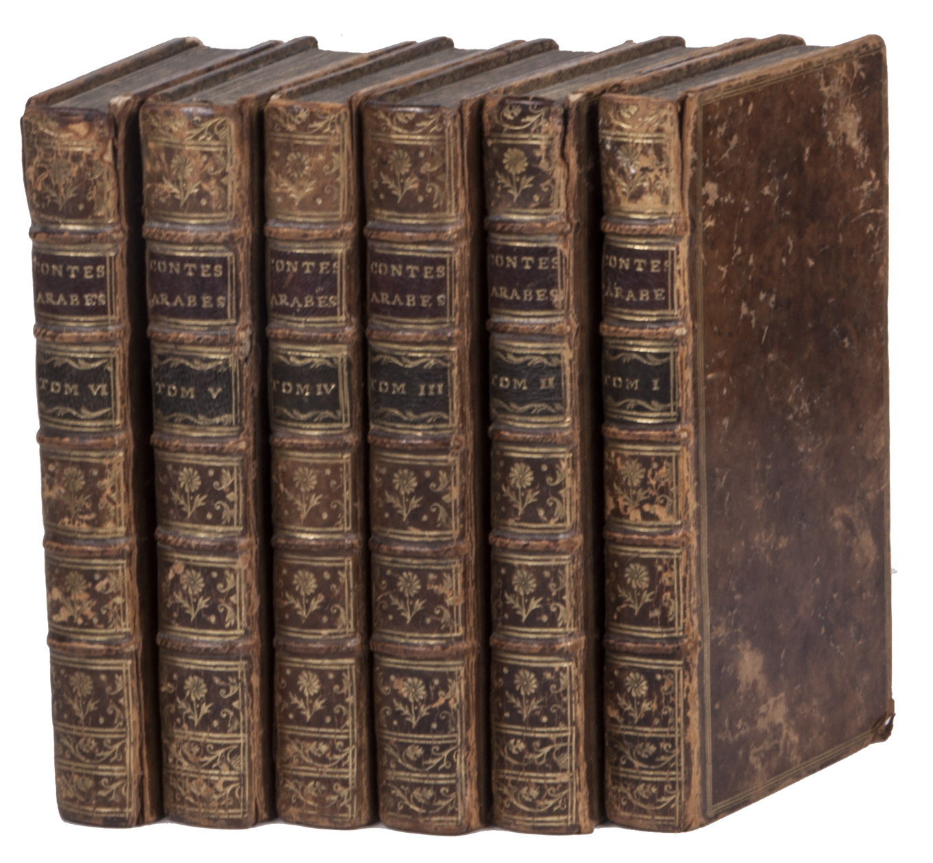 The present early edition of Antoine Gallands famous translation, in six attractive volumes, is sought after in part because of the extreme rarity of the first edition. The main source for Antoine Gallands compilation and translation was a collection of tales from Lebanon, mostly of Persian origin (or at least with Persian roots), translated into Arabic at the end of the seventh century. He supplemented it with material from at least two other manuscripts. The many editions and translations into most other Western languages many times over bear witness to its enormous influence.