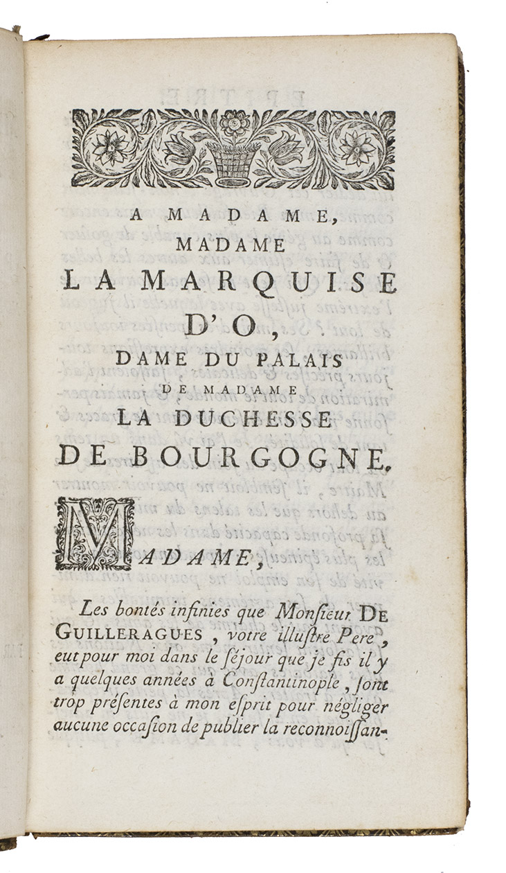 Paris, La Compagnie des Libraires (colophon vol. VI: printed by [André-François] Le Breton, imprimeur ordinaire du Roi), 1745. 6 volumes. 12mo in 4s & 8s. Uniform gold-tooled mottled calf. [16], 350; [12], 352; [8], 415, [1 blank]; [4], “369” [= 375], [1 blank]; [4], 419 [1 blank]; [4], “181” [= 183], [3], [2 blank] pp.
