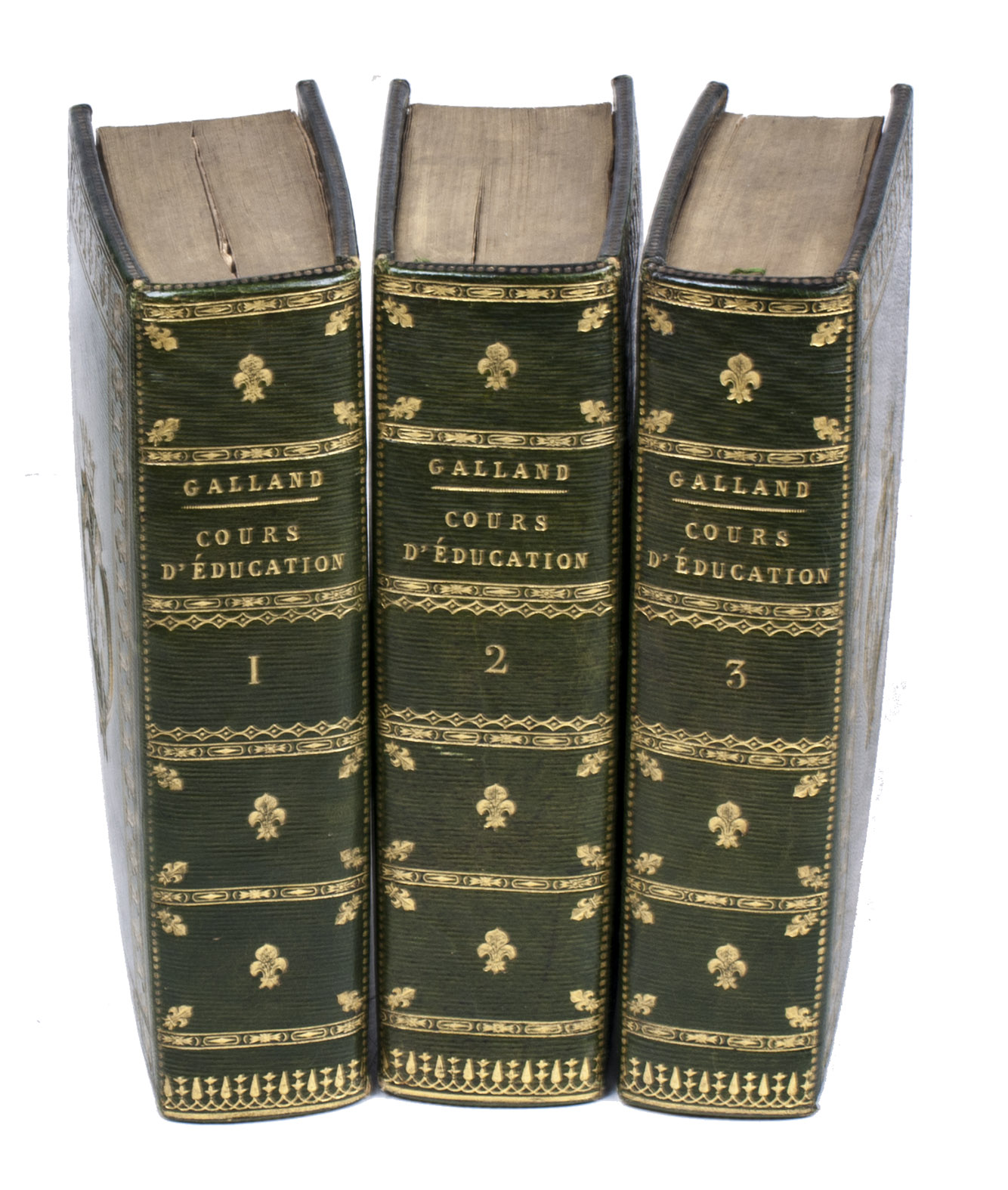 Very rare first and only edition of a compendious educational work intended for girls, dedicated (in the newly restored Bourbon monarchy) to Marie Thérèse de France (1778-1851), Duchesse d'Angoulême and daughter of King Louis XVI and Queen Marie Antoinette, the only heir directly descended from Louis XVI to survive the Revolution. The dedication itself appears in volume 1 (1817), but is noted on all three title-pages (so also 1816). The present copy is in a beautiful armorial morocco binding clearly intended as a dedication copy for Marie Thérèse, with her arms on both boards of each volume. She had married her first cousin Louis Antoine d'Artois (1775-1844), Duc d'Angoulême in 1799 (he was to be King of France for 20 minutes in 1830 when his father and he abdicated, then pretender to the throne, calling himself Louis XIX). She was nearly forty and childless when the book appeared, soon after the 1814/15 restoration of the Bourbon monarchy with her uncle as King Louis XVIII. Rather than impale the husband's and father's arms as the English did, French ladies displayed them side by side: courtoisie.