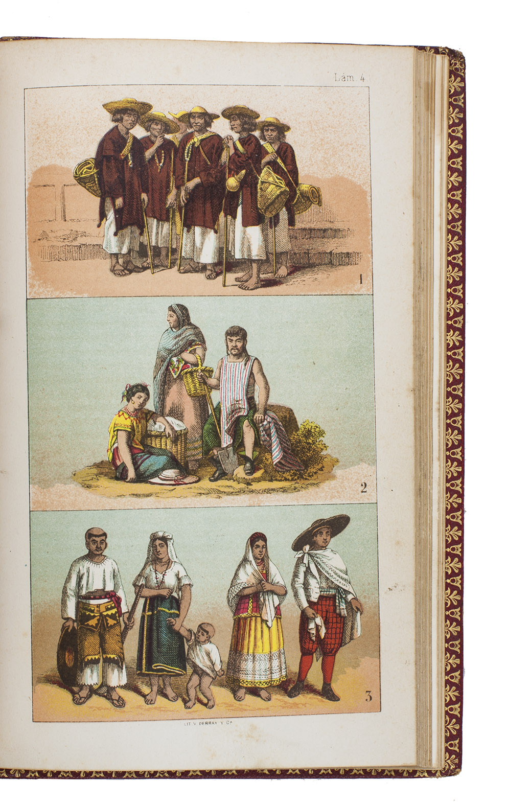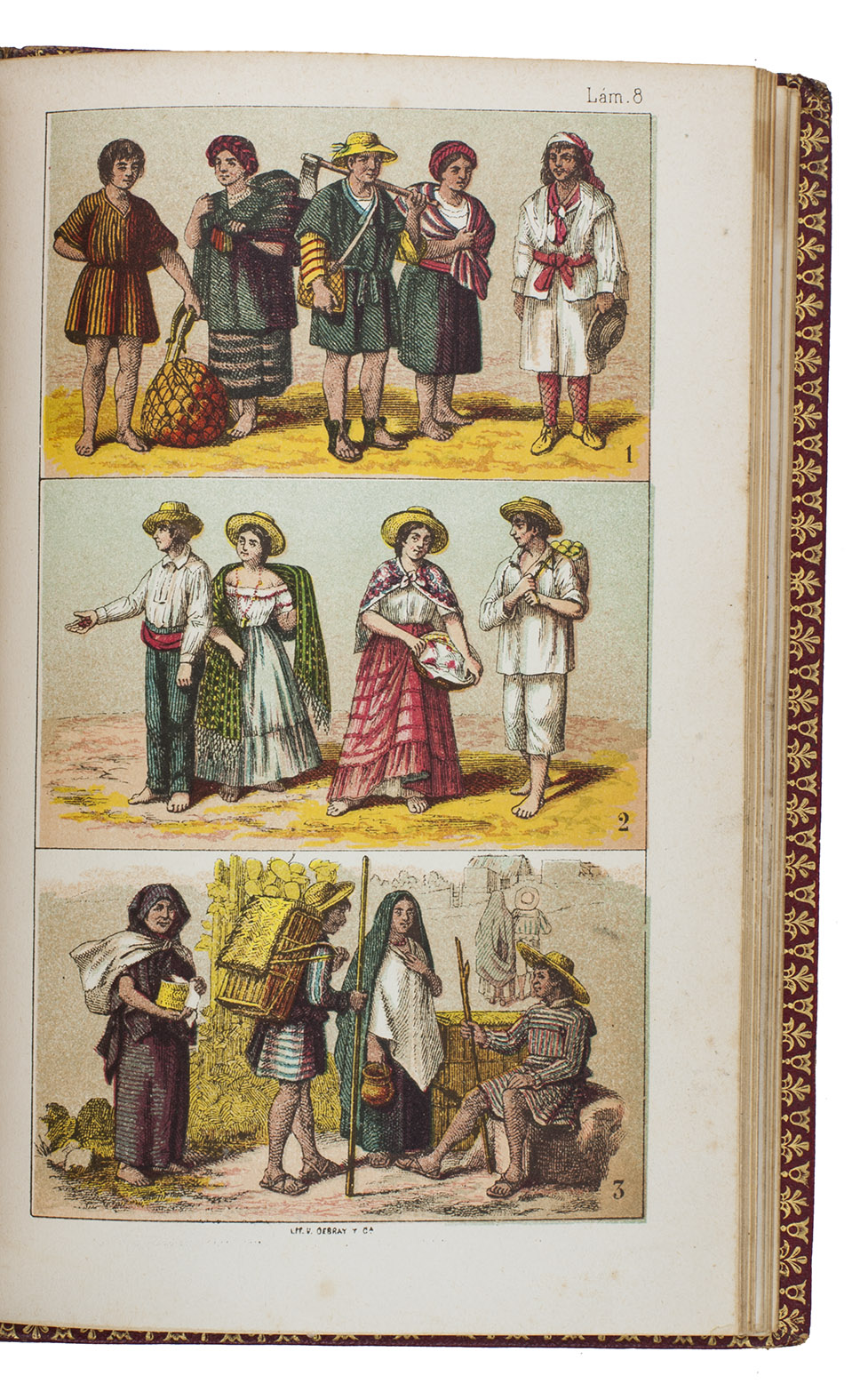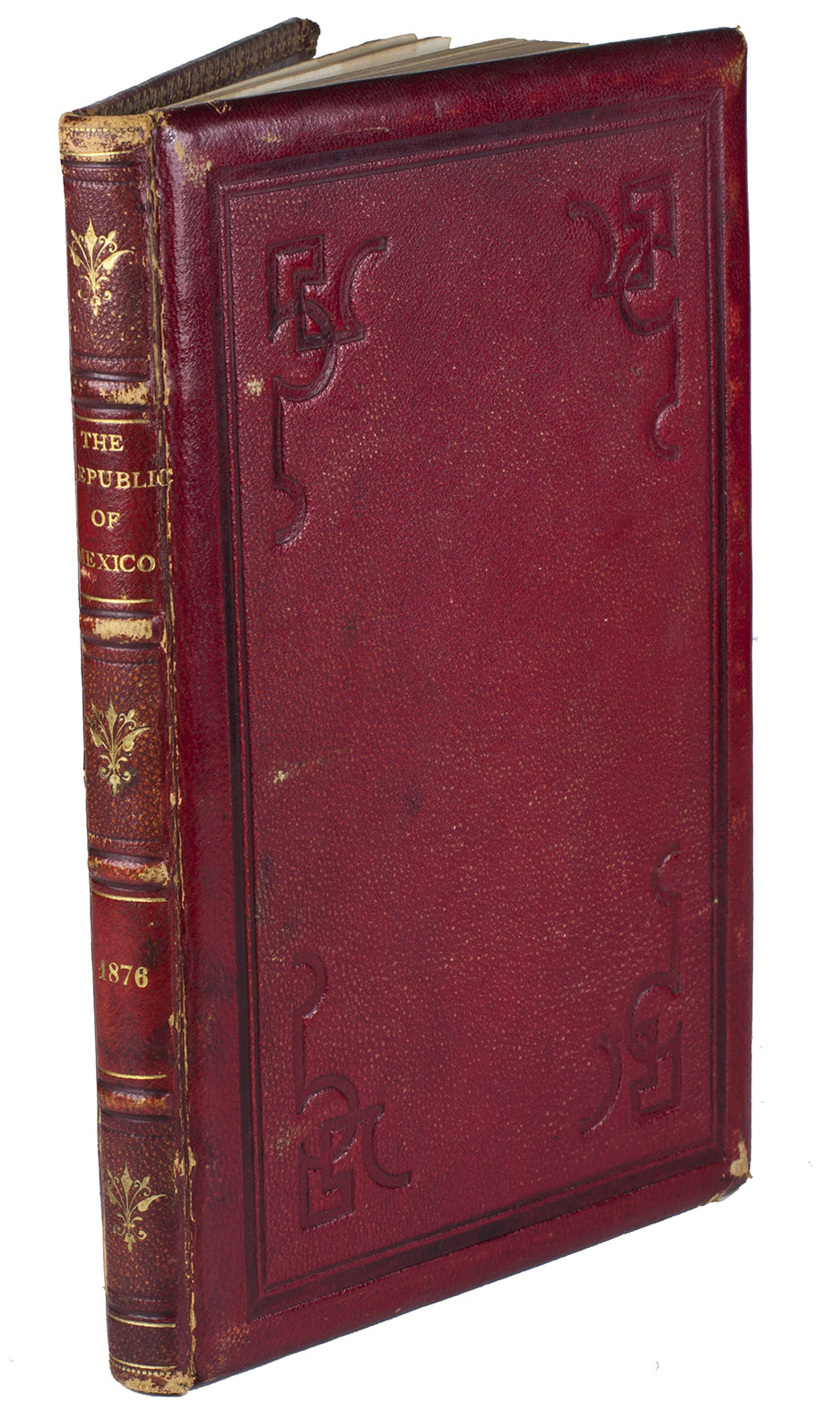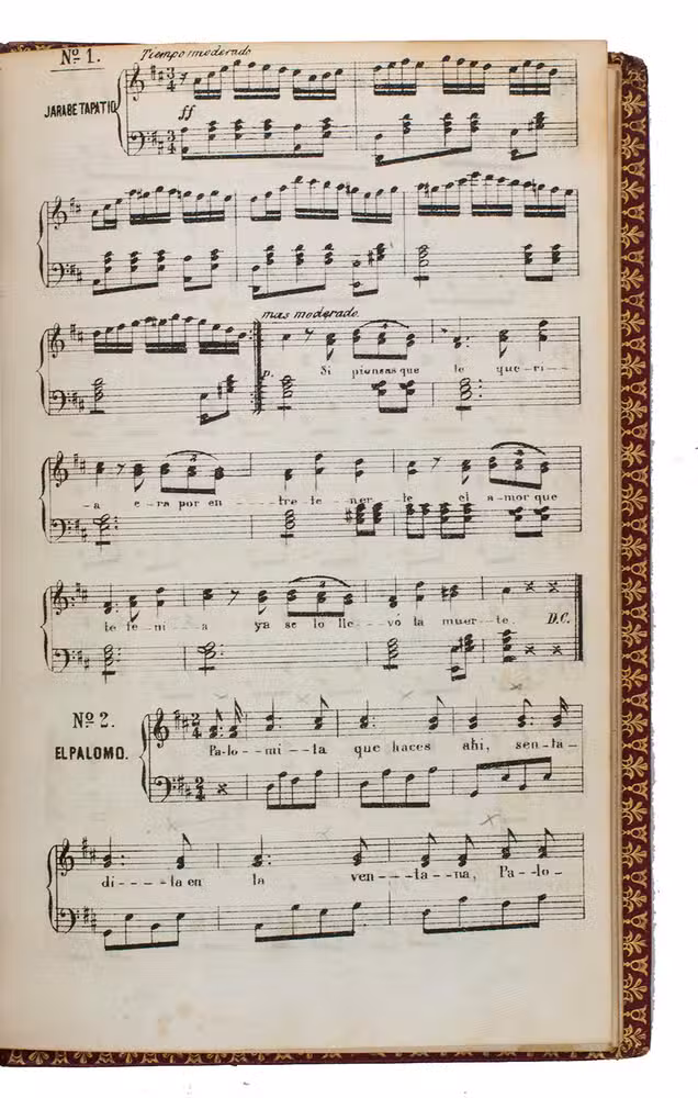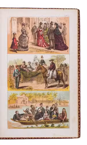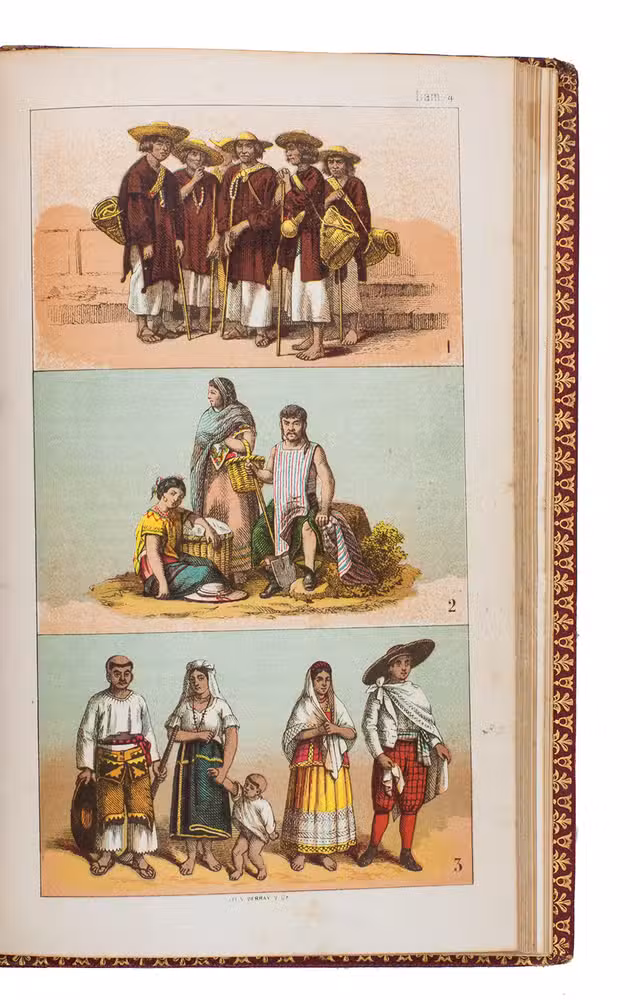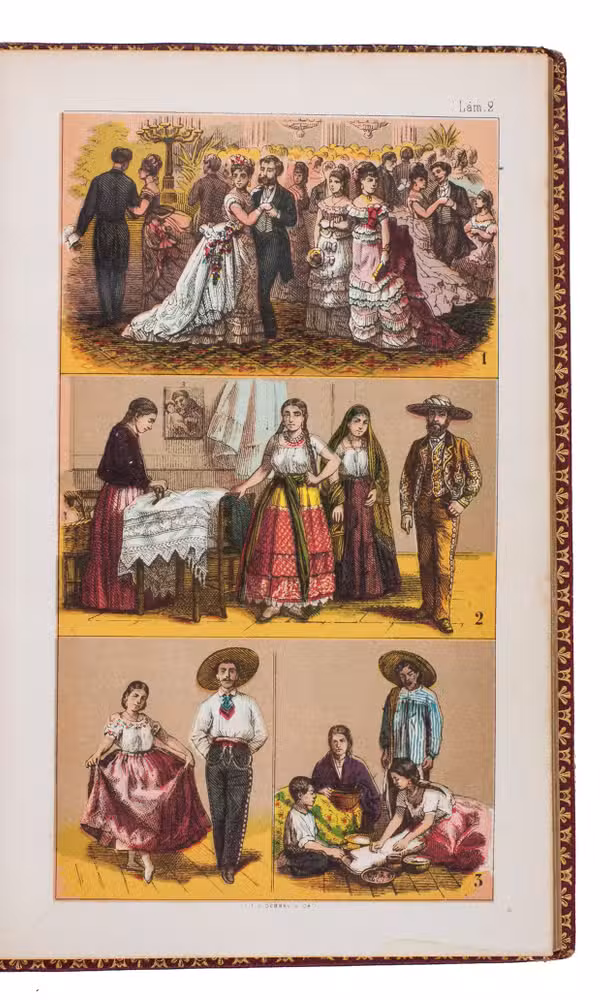 Mexico City, La Enseñanza, 1876. 8vo. With 8 chromolithographed plates, finished by hand, double-page map, and 4 leaves with printed music on both sides. 19th-century red morocco, gold-tooled spine, blind-tooled boards, gold-tooled turin-ins, gilt edges. 130, [12] pp.