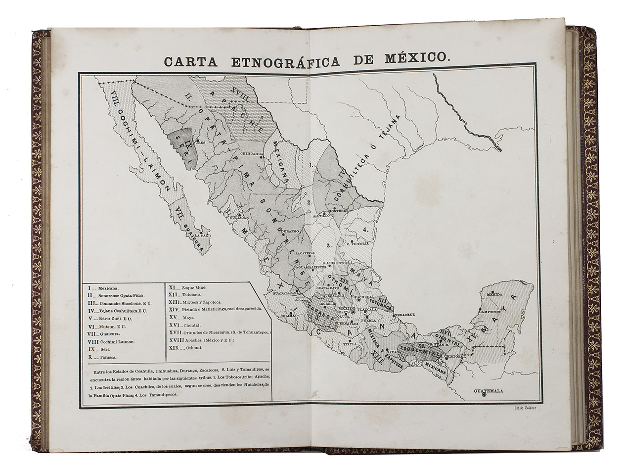 Interesting work on the politics, history and ethnography of Mexico, by the Mexican scientist Antonio Garcia Cubas (1832-1912). In the third part on ethnography the focus is on several indigenous Mexican Indian families. "For a better knowledge of the races, their real characteristics, their uses and customs should be studied, as I have mentioned on another occasion, in the depths of the mountainous regions where they still preserve their ancient habits and their dialects with greater purity. ..." (pp. 67-68).