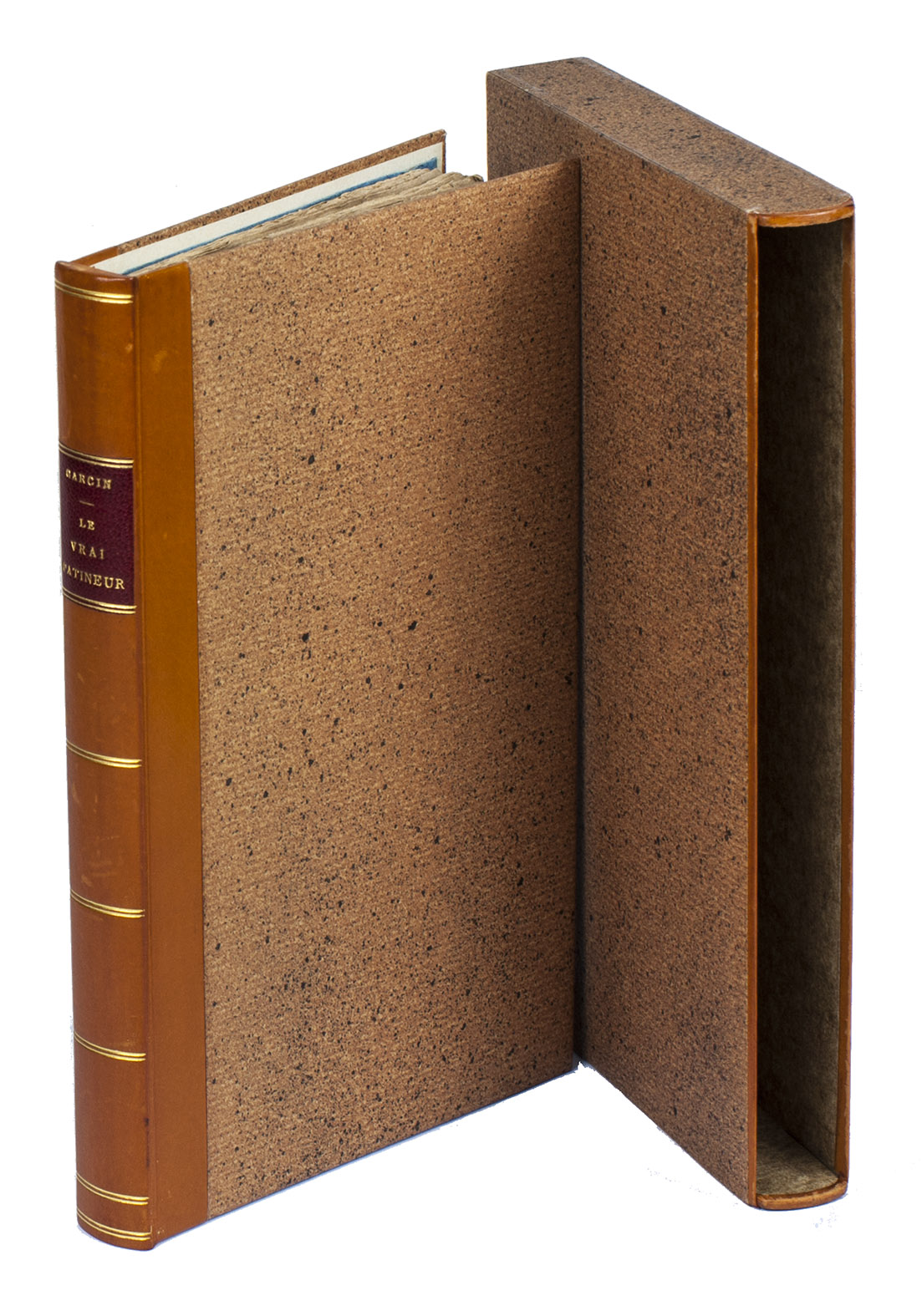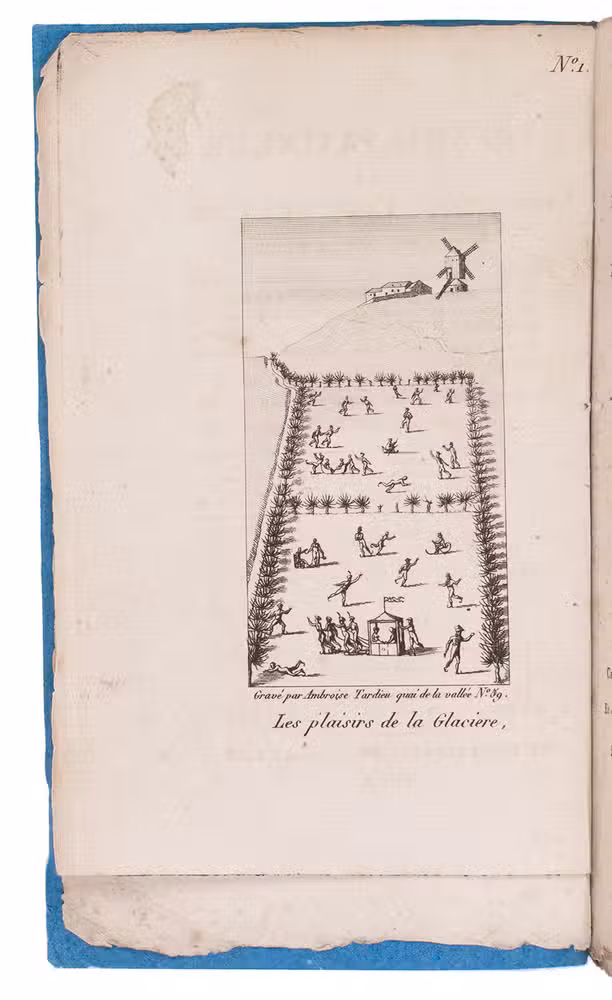 Paris, Delespinasse, Delaunaux, Nepveu, the author (printed by Joseph-Gaspard Gillé fils), 1813. 12mo (18 x 10.5 cm). With 8 numbered engraved plates, namely a frontispiece view of a skating rink with many skaters, engraved by Ambroise Tardieu, and 7 images of individual skaters, each in a different pose. Later blue paper wrappers. Preserved in modern half morocco slipcase. XXIV, 93, [1 blank] pp.