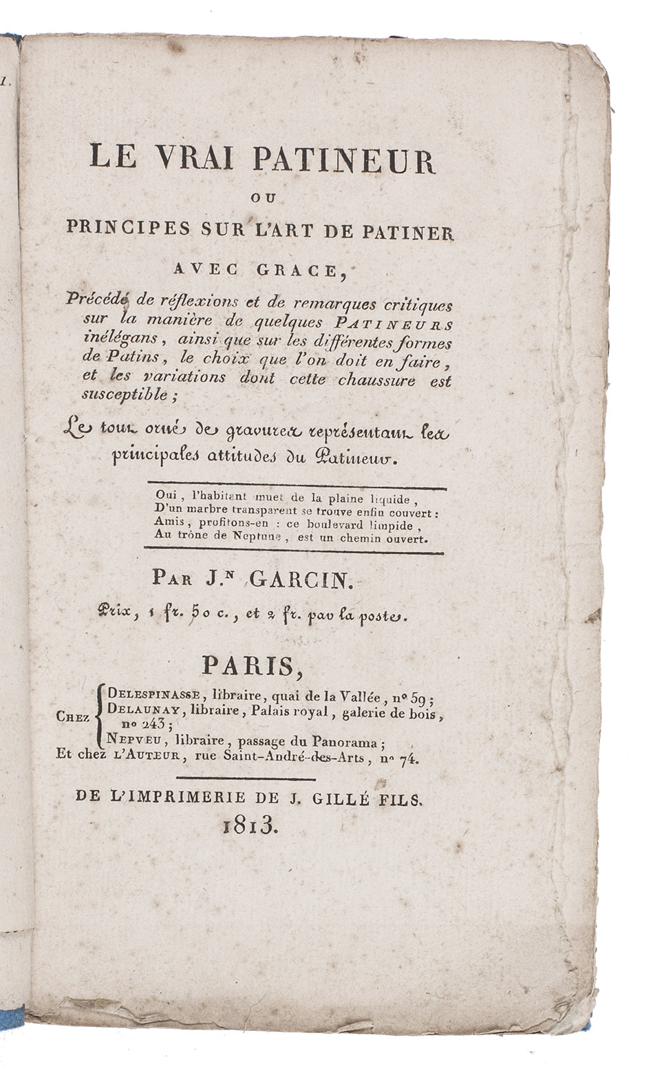 Le vrai patineur, ou principes sur l'art de patiner avec grace, précédé de réflexions et de remarques critiques sur la manière de quelques patineurs inélégans, ainsi que sur les différens formes de patins, le choix quel'on doit en faire, et les variations dont cette chaussure est susceptible.