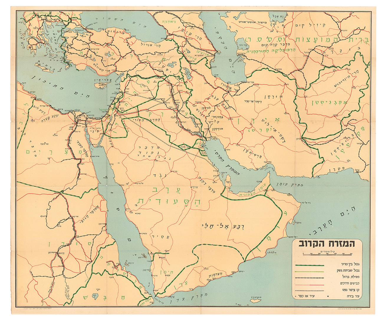 A large map of the Middle East, produced by Israel's General Staff soon after the Suez Crisis, showing the Arabian Peninsula and adjoining countries with major roads, railroads, and petroleum pipelines.