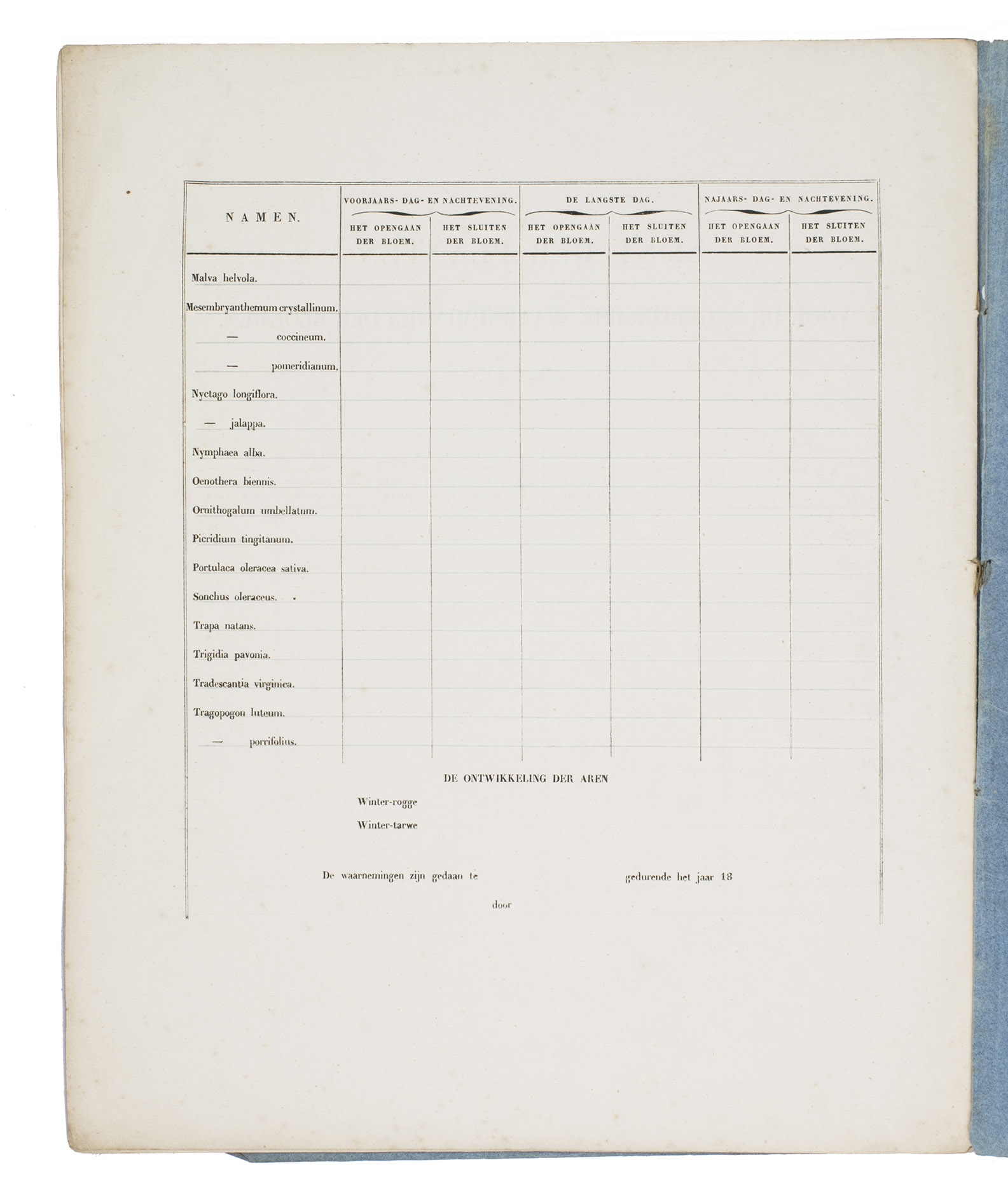 Second copy located of a remarkable example of 19th-century botanical research methods, issued by the Genootschap voor Landbouw en Kruidkunde (Society for Agriculture and Herbology) in Utrecht, the Netherlands. This society was founded in 1841 with the goal of representing the interests of and generally promoting agriculture, animal husbandry, timber cultivation, horticulture, and herbology in the Dutch province of Utrecht. The society was managed by a committee counting 6 members: mr. P.J.J. Ram, F.H.J. van der Hoop, H. van Lunteren, jhr. G.J. Beeldsnijder van Voshol, dr. J.J. Burgerhoudt, and F.W. Selle. They subsequently invited J.H. Schober to take up the position of secretary. It is Schober's name appearing at the bottom of the general introduction in the present publication, asking members of the society to participate in the observation of certain plants in order to gain knowledge regarding the influence of slight differences in climate on the development these plants.