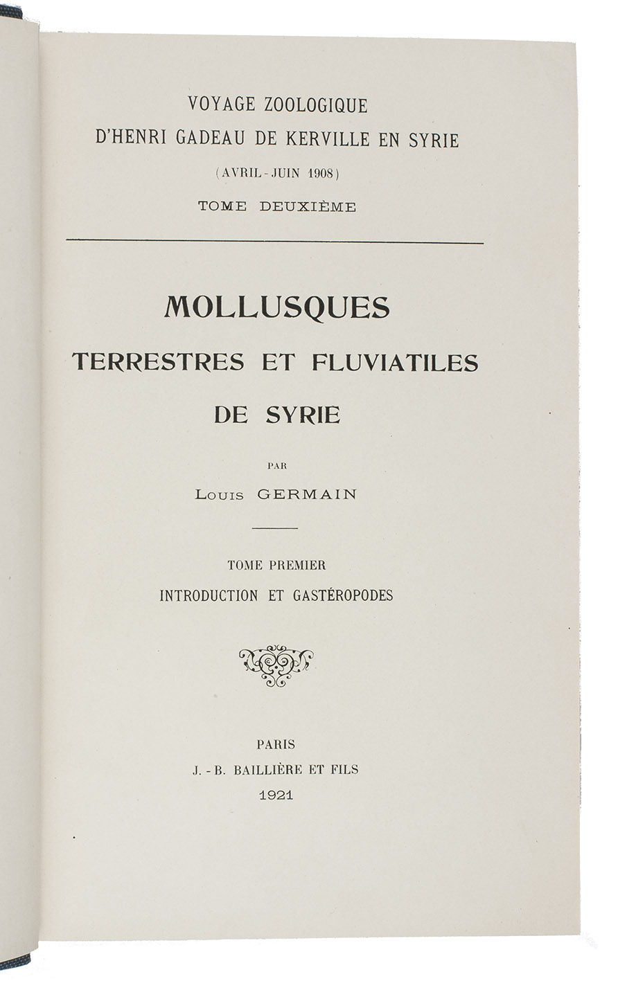First edition of an extensive work on both land- and water molluscs that can be found in Syria, by the French malacologist Louis Germain (1878-1942). It describes numerous families and species of molluscs, the first volume containing an introduction and the sections on Syrian gastropods (snails and slugs), the second volume dealing with pelecypods (bivalvia) and closing with an index.