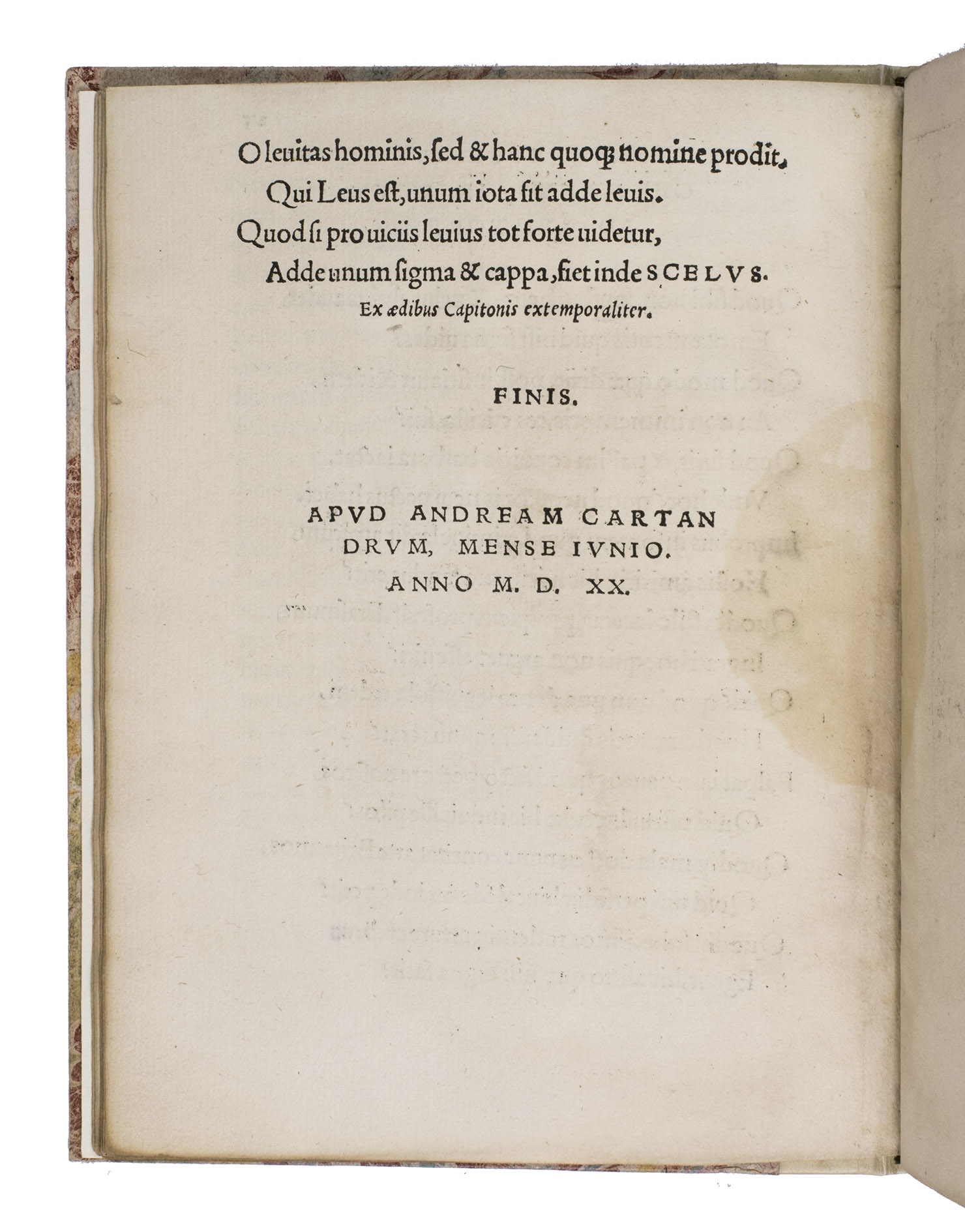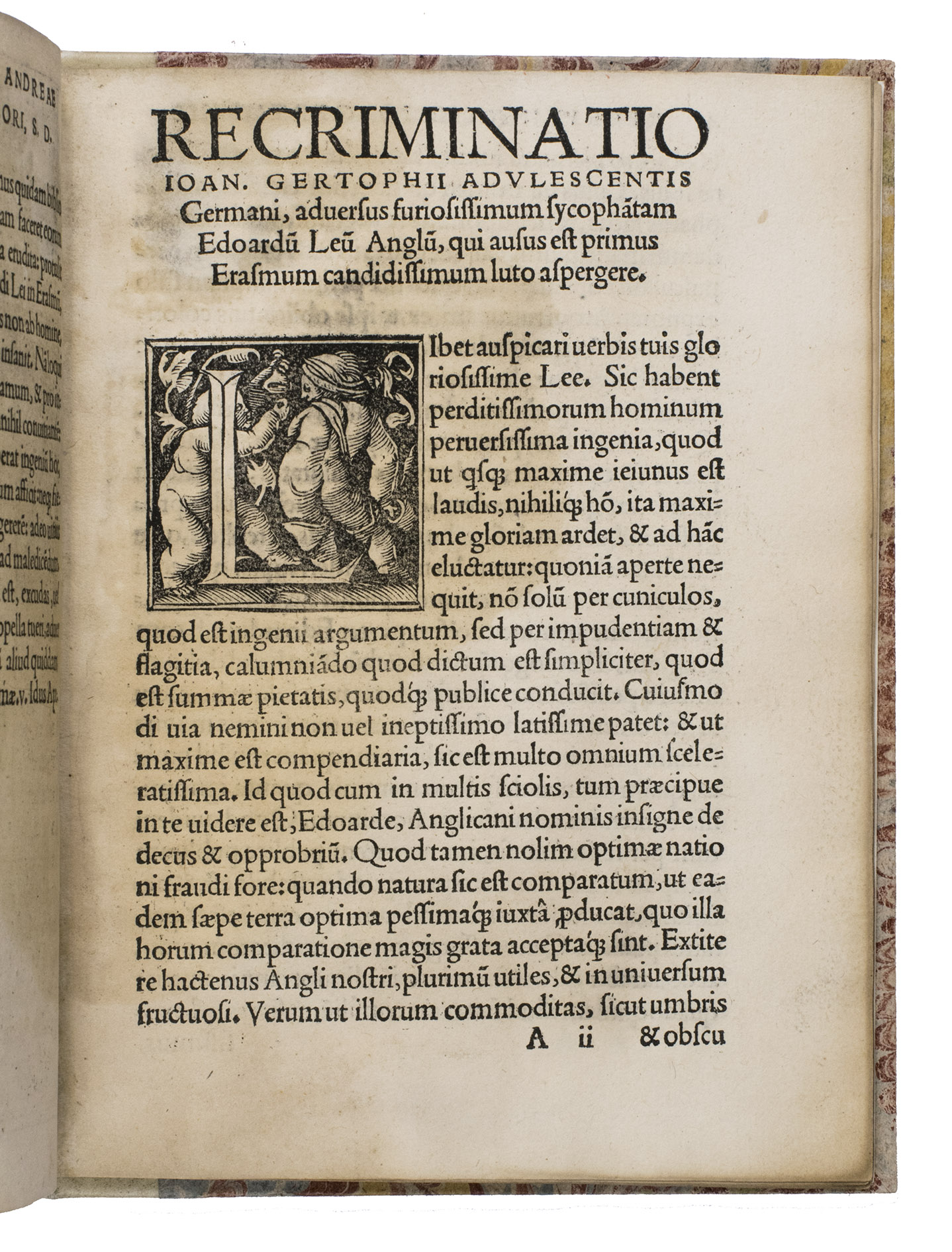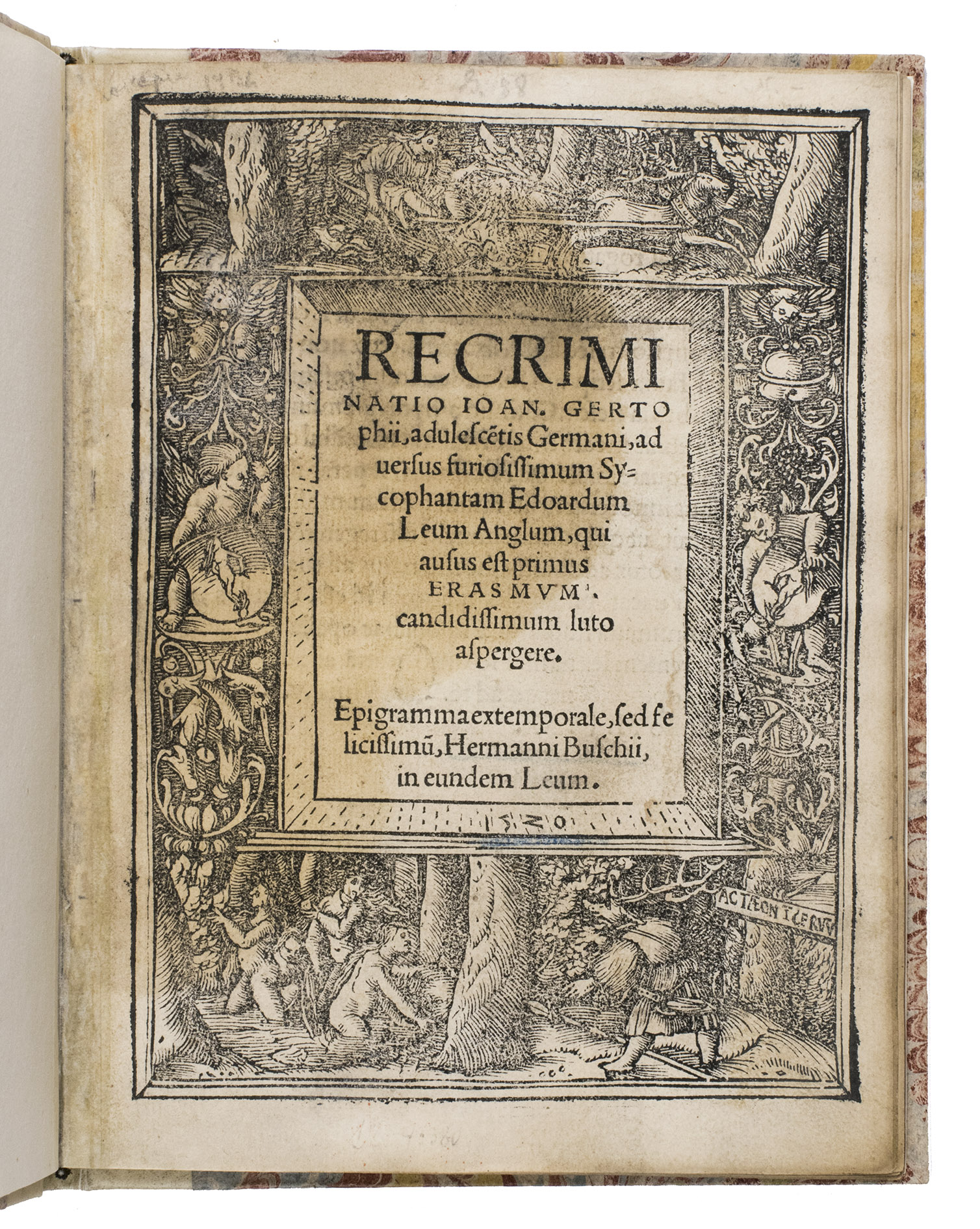 First and only edition of a work defending Erasmus against the accusations of Edward Lee, Archbishop of York. Lee had repeatedly complained about Erasmus's translation of the New Testament, criticising not only his knowledge of the Greek language, but also accusing him of heresy, and of stealing Lee's own ideas. In response, Erasmus and his friends, including Johannes Gertophius (dates unknown), ridiculed him on several occasions, such as in the present work. The title refers to the author as an "adolescens Germanus", but nothing more seems to be known about him. Other than a defence of Erasmus's New Testament against Lee's charges, the present work also includes a satirical poem, consisting of eleven distichs, by Herman von dem Busche (1468-1534).