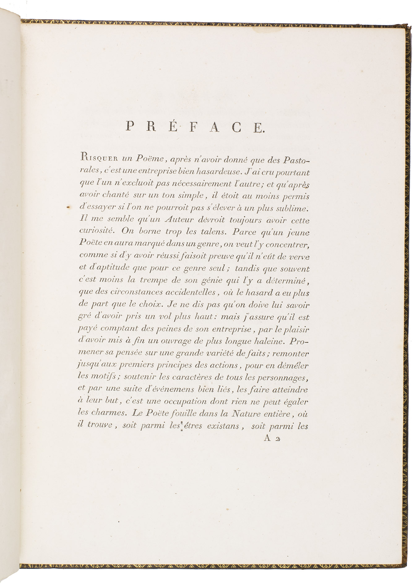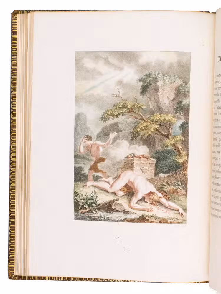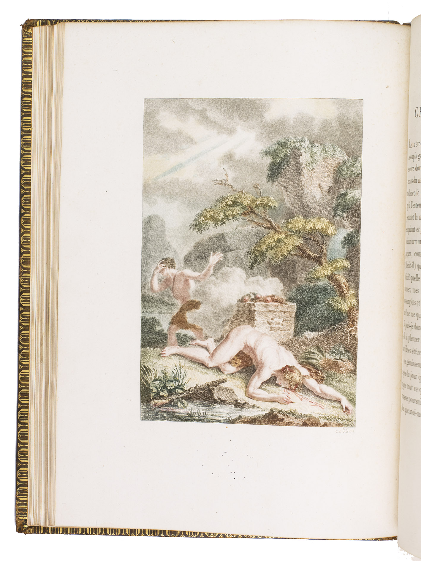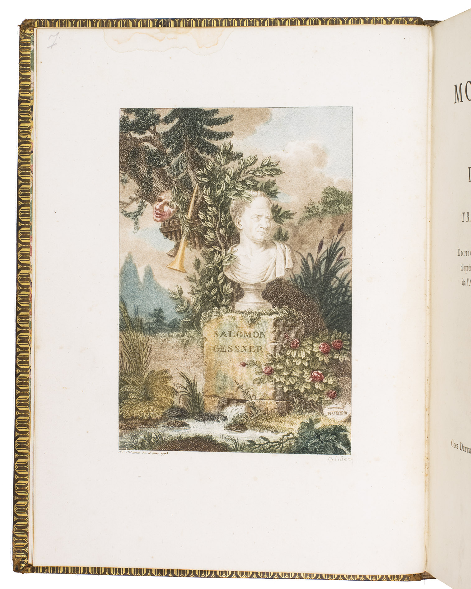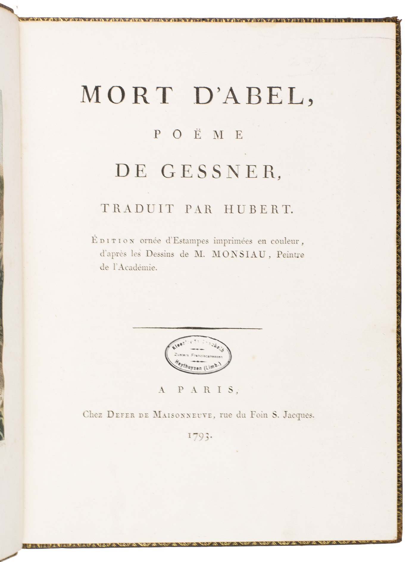 First edition of Hubert's prose translation of Gessner's celebrated poem Der Tod Abels, which was first published in German in 1758. Salomon Gessner (1730-1788), known throughout Europe for literary works of pastoral themes and his rococo style, was a bookseller's son, and started his career as an apprentice to the bookseller Spener in Berlin. Giving up this employment, he lived for a time by painting and engraving. In 1750, he settled in Zurich, continuing to live by painting, including painting on porcelain. Later he was also a town councillor and a forestry superintendent, who also ran an important publishing house, from which he published his books with his own excellent etchings. He began to write idylls in poetic prose, beginning with Daphnis (1754) and his Idyllen (1756-72) achieved nation-wide success. In Der Tod Abels (1758), he attempted to write an epic in prose in five "chants", quickly becoming his most renowned work, and making him the most successful and typical representative of a literary rococo movement. In his idylls, Gessner is indebted to Theocritus and Virgil, creating an idealized, orderly, almost horticultural state of nature.