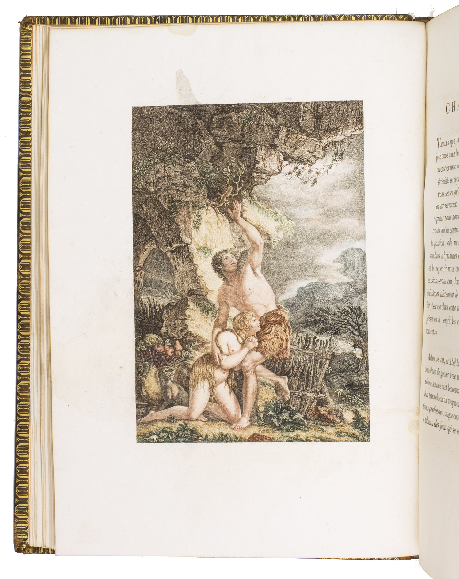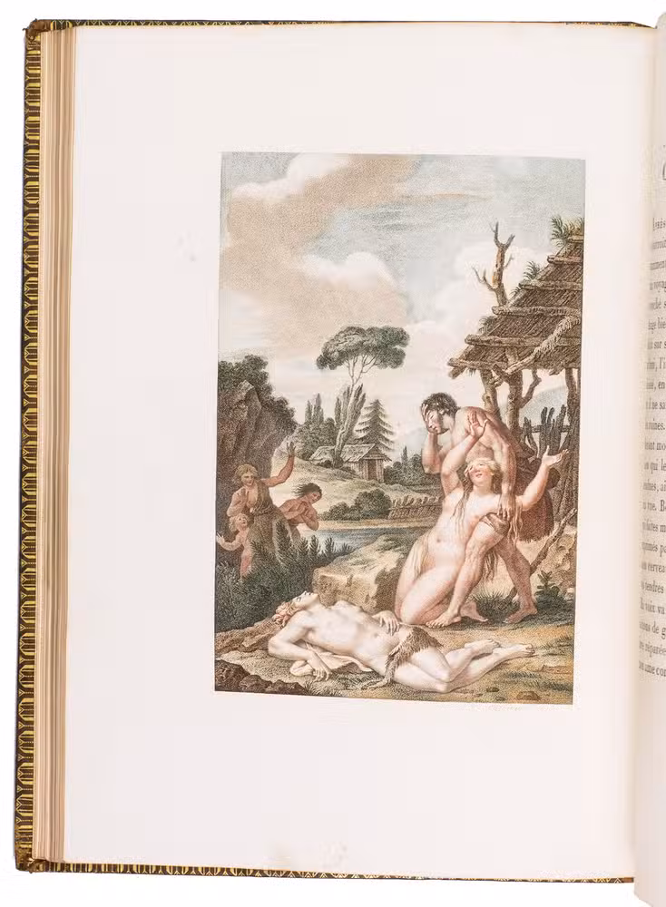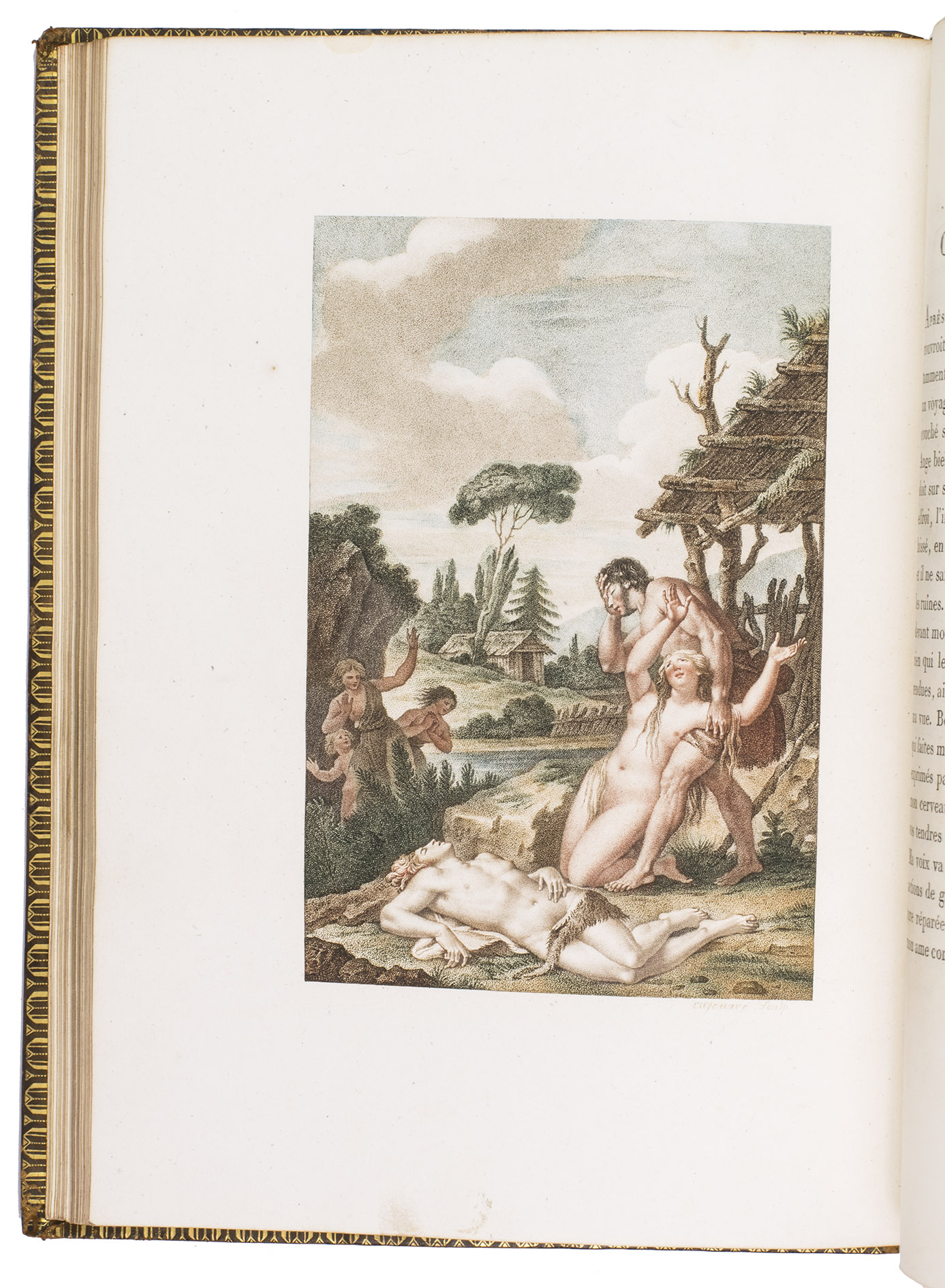 The beautiful stipple engraved plates are after the drawings by Nicolas Monsiau. Nicolas-André Monsiau (1754-1837) was a Parisian who attained some reputation as a painter of both classical and modern subjects. He was elected to the Academy in 1789. These scenes were engraved by Colibert, Casenave, and Clément, and printed in colour in one run through the press. The six plates in this copy are in their first state, before numbers; two have the artist's and engraver's name; 3 have only the engraver's name.