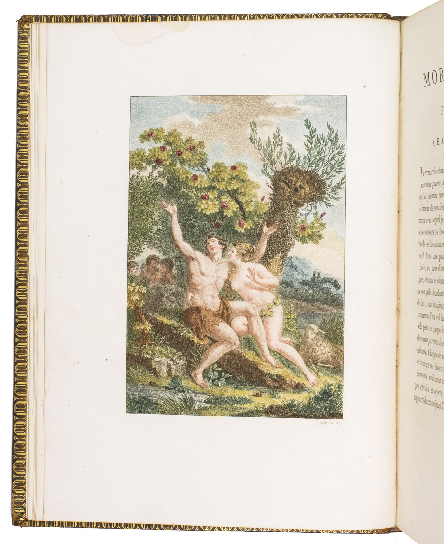 Paris, chez Defer de Maisonneuve, 1793. Large 4to. With a stipple-engraved colour-printed frontispiece, and 5 stipple-engraved colour printed plates by Colibert, Casenave, and Clément after the designs of Nicolas Moniau. Contemporary gold-tooled brown and green mottled calf. 161, [3 blank] pp.