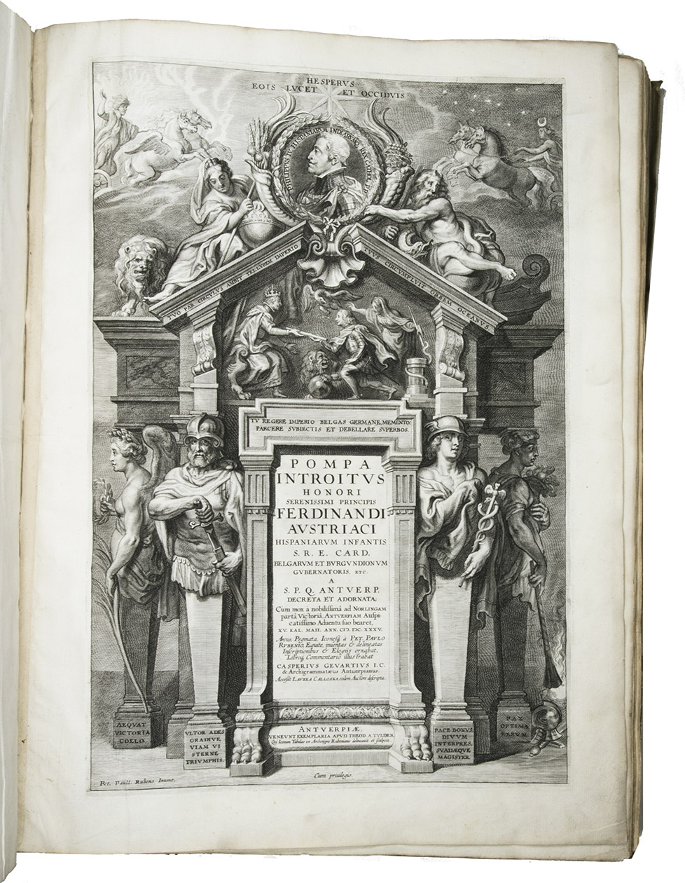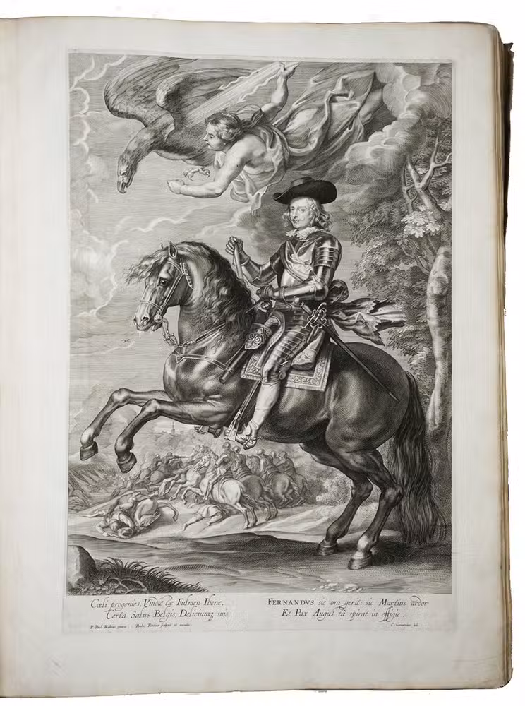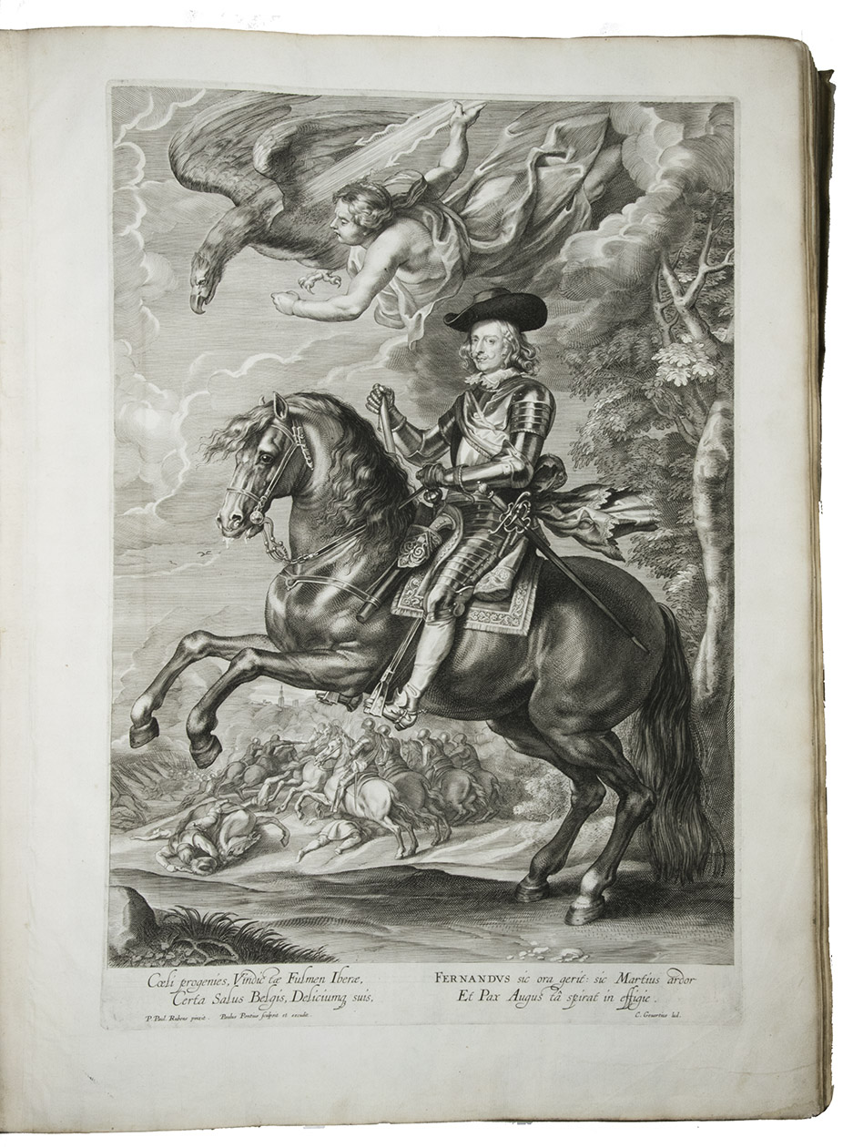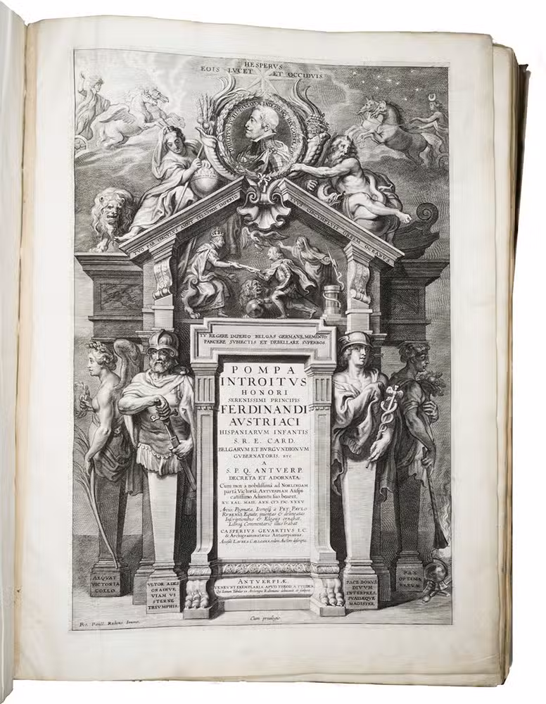 One of the 200 deluxe copies reserved for the Antwerp magistrates, printed on heavy Venetian paper and including the equestrian portrait of Ferdinand, of a splendid monument of Baroque book illustration by Pieter Paul Rubens (1577-1640), the greatest Flemish artist of the 17th century: one of the most sumptuously illustrated books of the 17th century. It illustrates and describes the spectacular triumphal entry of Cardinal-Infante Ferdinand of Austria (1609-1641), Infante of Spain, into the city of Antwerp on 16 May 1635, after his victory at the Battle of Nördingen in 1634. The city was richly decorated for his triumphal procession with wooden arches, stages and paintings by Rubens. The present work, commissioned by the Antwerp city magistrates to commemorate the procession and festivities, records Ferdinands entry into Antwerp in great detail, in both words and images.