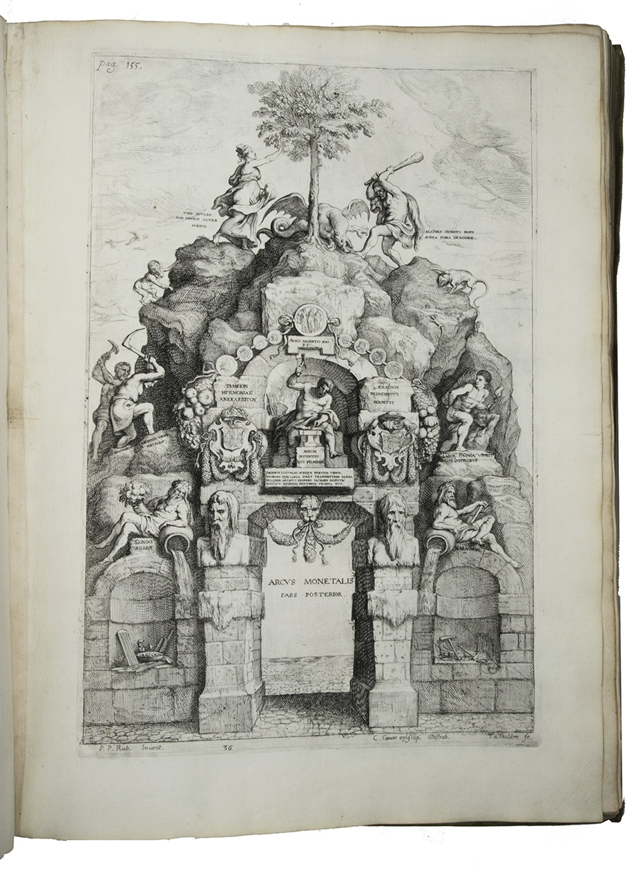 Antwerp, Theodoor van Tulden (colophon: printed by Jan van Meurs, 1641), [published January 1643]. Royal 1mo (full-sheet leaves) (57 x 42 cm). With a letterpress half-title and XXXIX single-page, double-page and larger folding plates (numbered I-XXXIX in the table of plates, printed and assembled from 43 copper plates numbered [1]-[2], 3-43) depicting the rich allegorical and ornamental triumphal arches and festive decorations, paintings, statues, etc., all designed by Pieter Paul Rubens, all but one for the triumphal entry of the Spanish cardinal-infante Ferdinand into Antwerp in 1635. Further with 46 smaller engravings in the text, depicting coins and medals, and numerous woodcut decorated initials (4 series). Contemporary overlapping vellum, manuscript title on spine. [10], 189, [13] pp. plus 38 plates.