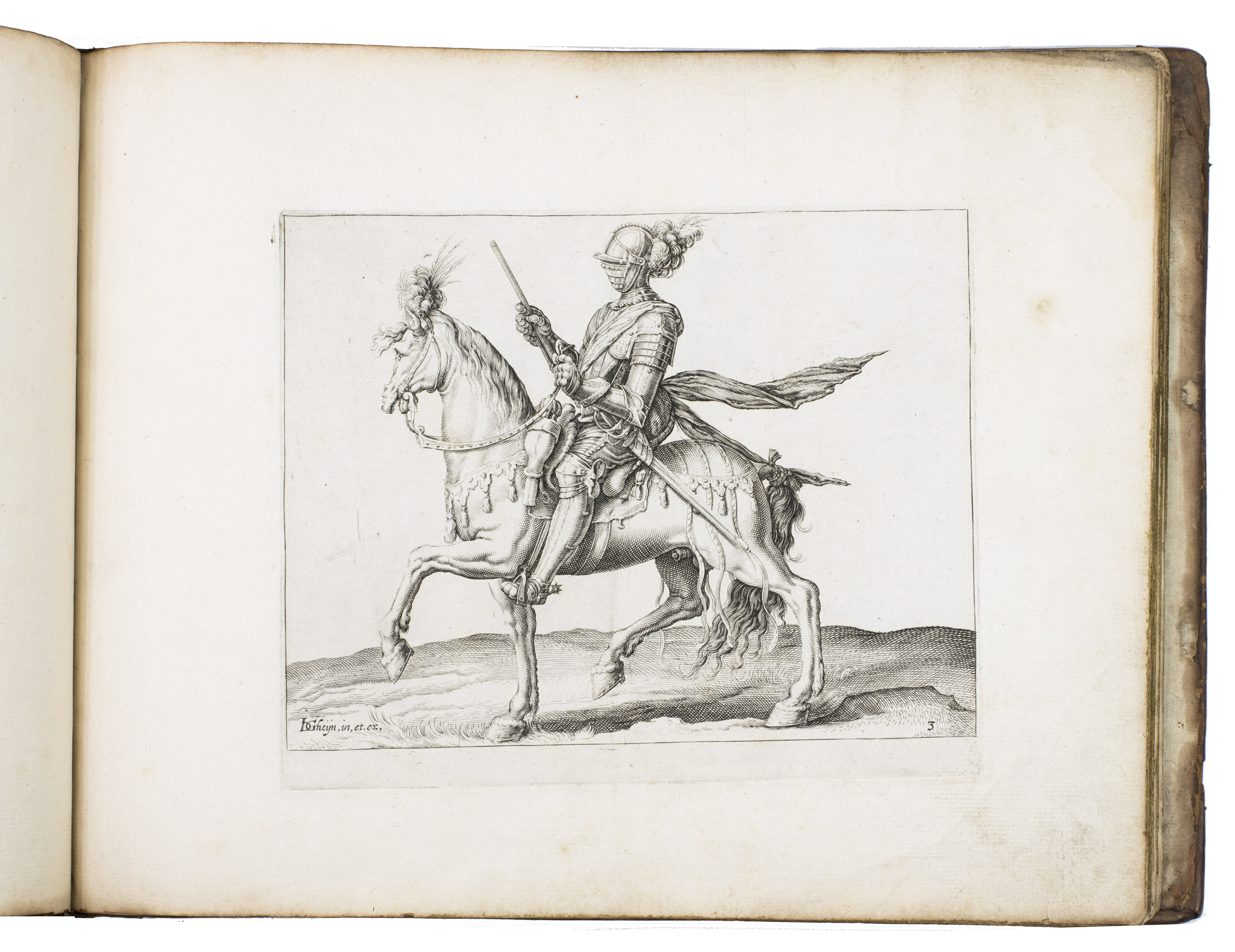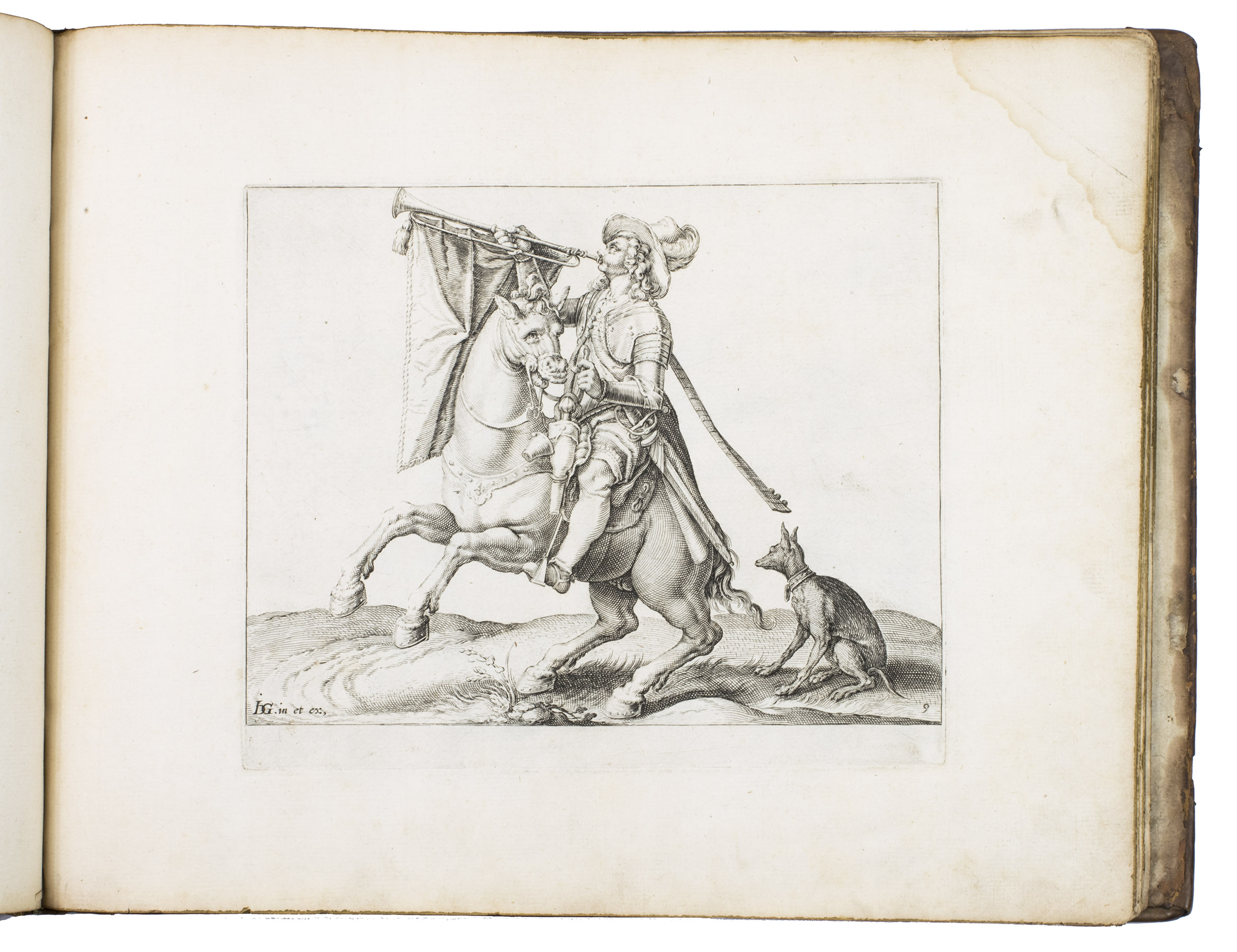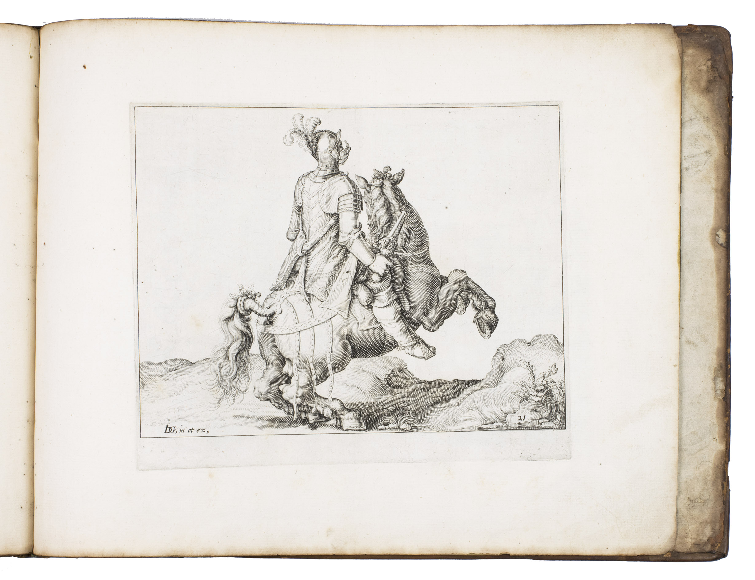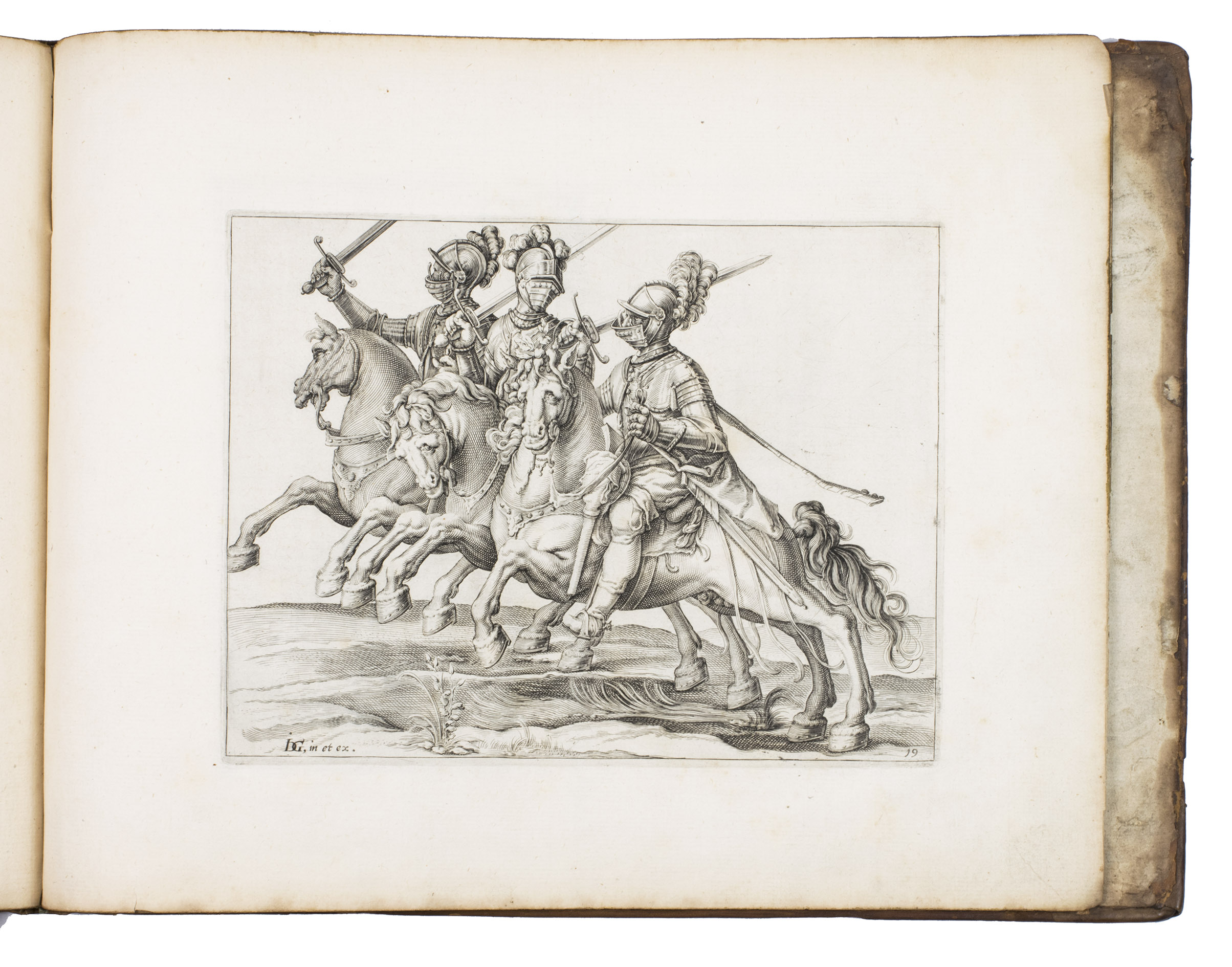 Very rare first edition of this magnificent series of cavalrymen and lansquentes in various positions, bound for Henry Frederick, Prince of Wales (1598-1612) with his coat-of-arms on the boards. All plates are signed by Jacob II de Gheyn ("IDGheyn in. et ex.") and engraved either by De Gheyn himself, or by Zacharias Dolendo after De Gheyn. The famous designer, engraver, publisher, and painter Jacob II de Gheyn, born in Antwerp in 1565, was an apprentice of Hendrick Goltzius in Haarlem between 1585 and 1587. In 1596, he moved to Leiden where he lived till 1602 working together with many of the professors of the newly founded University, amongst whom the "prodigy" Hugo de Groot (1583-1645), who became world famous as a lawyer and humanist. De Groot supplied the eight lines of poetry for the frontispiece of The Riding School, engraved within an elaborate border full of military symbols, such as a knight in armour holding a horse bridle on the left and a training master to the right, a stirrup, a currycomb, weapons, a skull with a laurel wreath symbolising "Death and Glory", and smoking trumpets. During these years in Leiden, De Gheyn worked mainly as a designer and publisher, leaving most of the engraving to apprentices, especially to Zacharias Dolendo (1561-1601). From ca. 1600 till his death in 1629, De Gheyn was active as a painter, draughtsman, and publisher in The Hague.