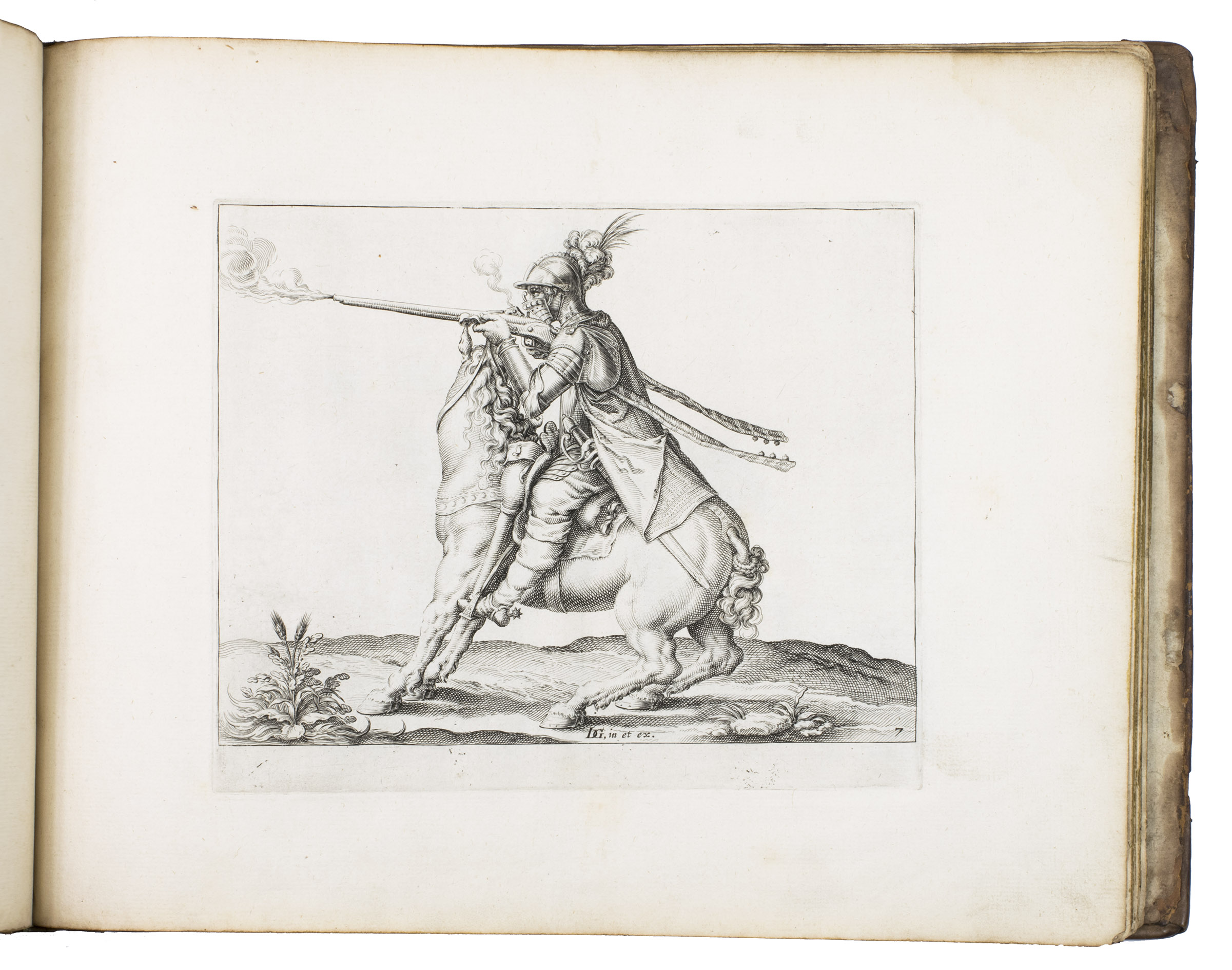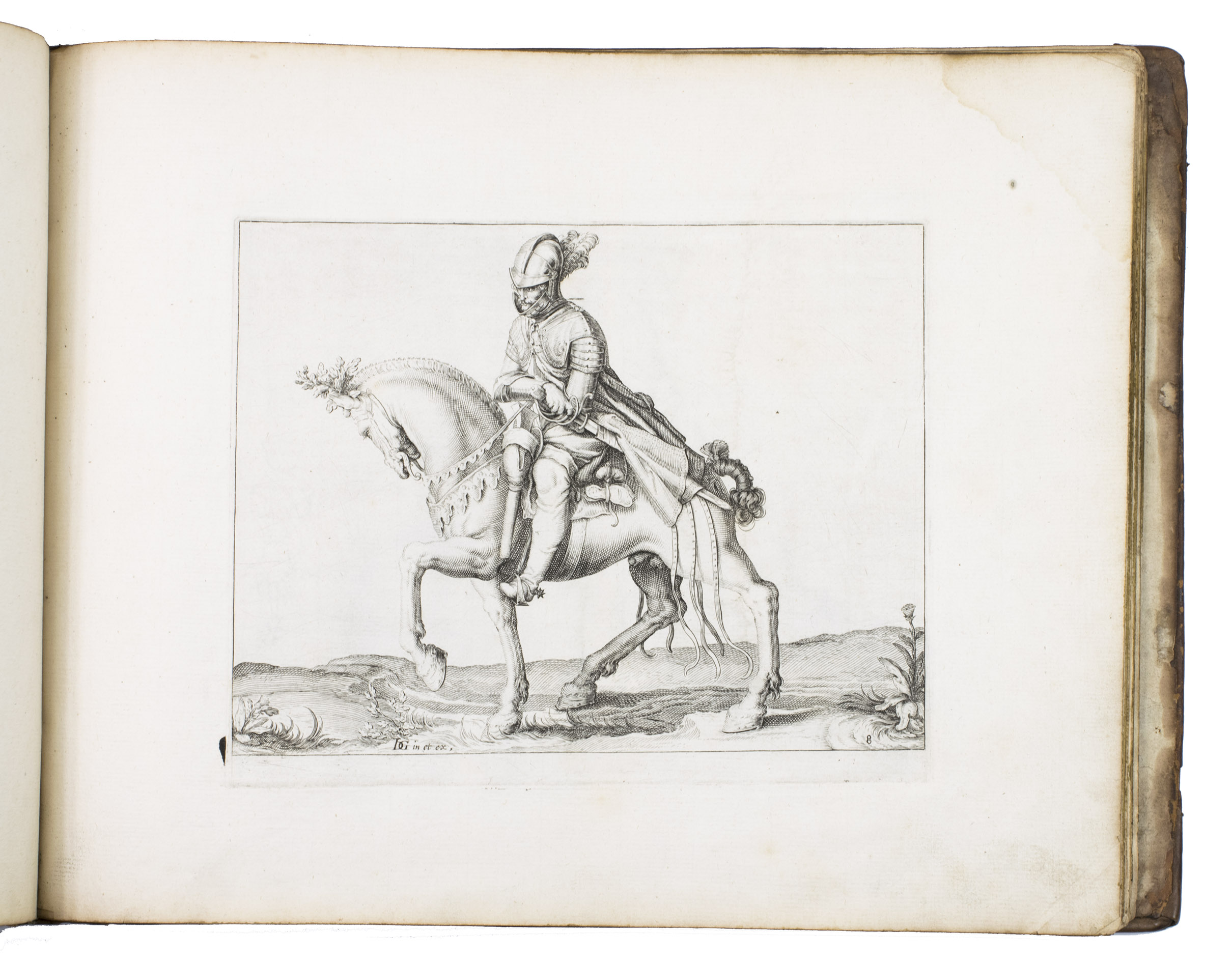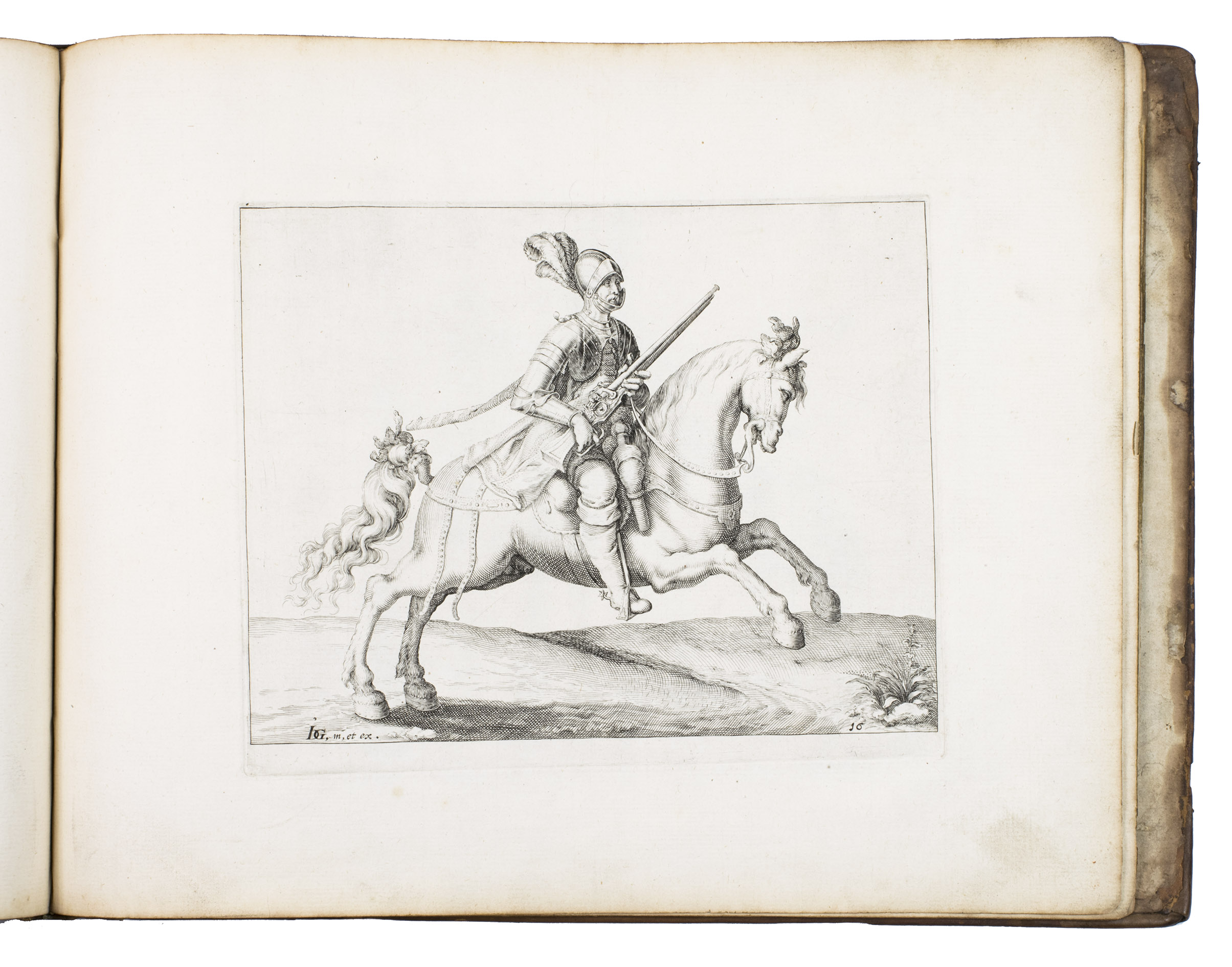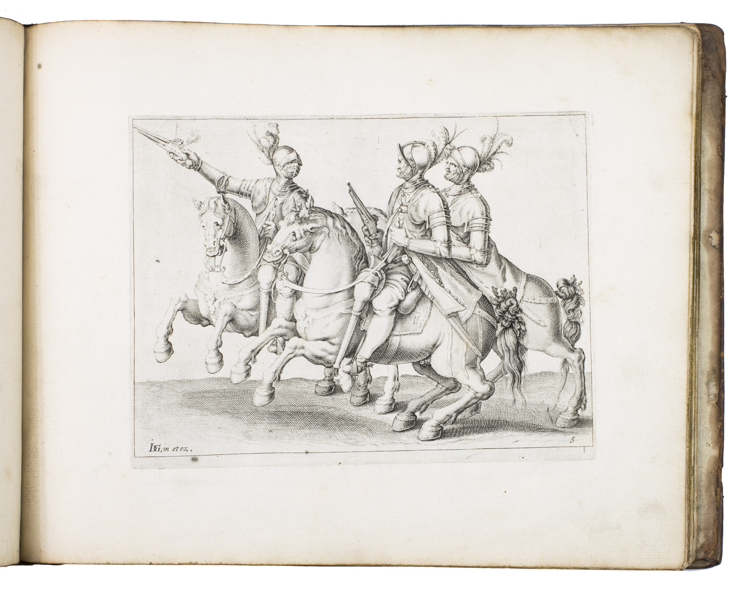 Very rare first edition of this magnificent series of cavalrymen and lansquentes in various positions, bound for Henry Frederick, Prince of Wales (1598-1612) with his coat-of-arms on the boards. All plates are signed by Jacob II de Gheyn ("IDGheyn in. et ex.") and engraved either by De Gheyn himself, or by Zacharias Dolendo after De Gheyn. The famous designer, engraver, publisher, and painter Jacob II de Gheyn, born in Antwerp in 1565, was an apprentice of Hendrick Goltzius in Haarlem between 1585 and 1587. In 1596, he moved to Leiden where he lived till 1602 working together with many of the professors of the newly founded University, amongst whom the "prodigy" Hugo de Groot (1583-1645), who became world famous as a lawyer and humanist. De Groot supplied the eight lines of poetry for the frontispiece of The Riding School, engraved within an elaborate border full of military symbols, such as a knight in armour holding a horse bridle on the left and a training master to the right, a stirrup, a currycomb, weapons, a skull with a laurel wreath symbolising "Death and Glory", and smoking trumpets. During these years in Leiden, De Gheyn worked mainly as a designer and publisher, leaving most of the engraving to apprentices, especially to Zacharias Dolendo (1561-1601). From ca. 1600 till his death in 1629, De Gheyn was active as a painter, draughtsman, and publisher in The Hague.
