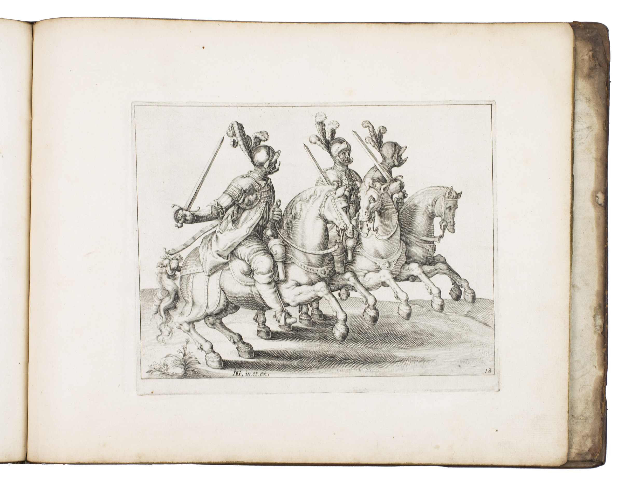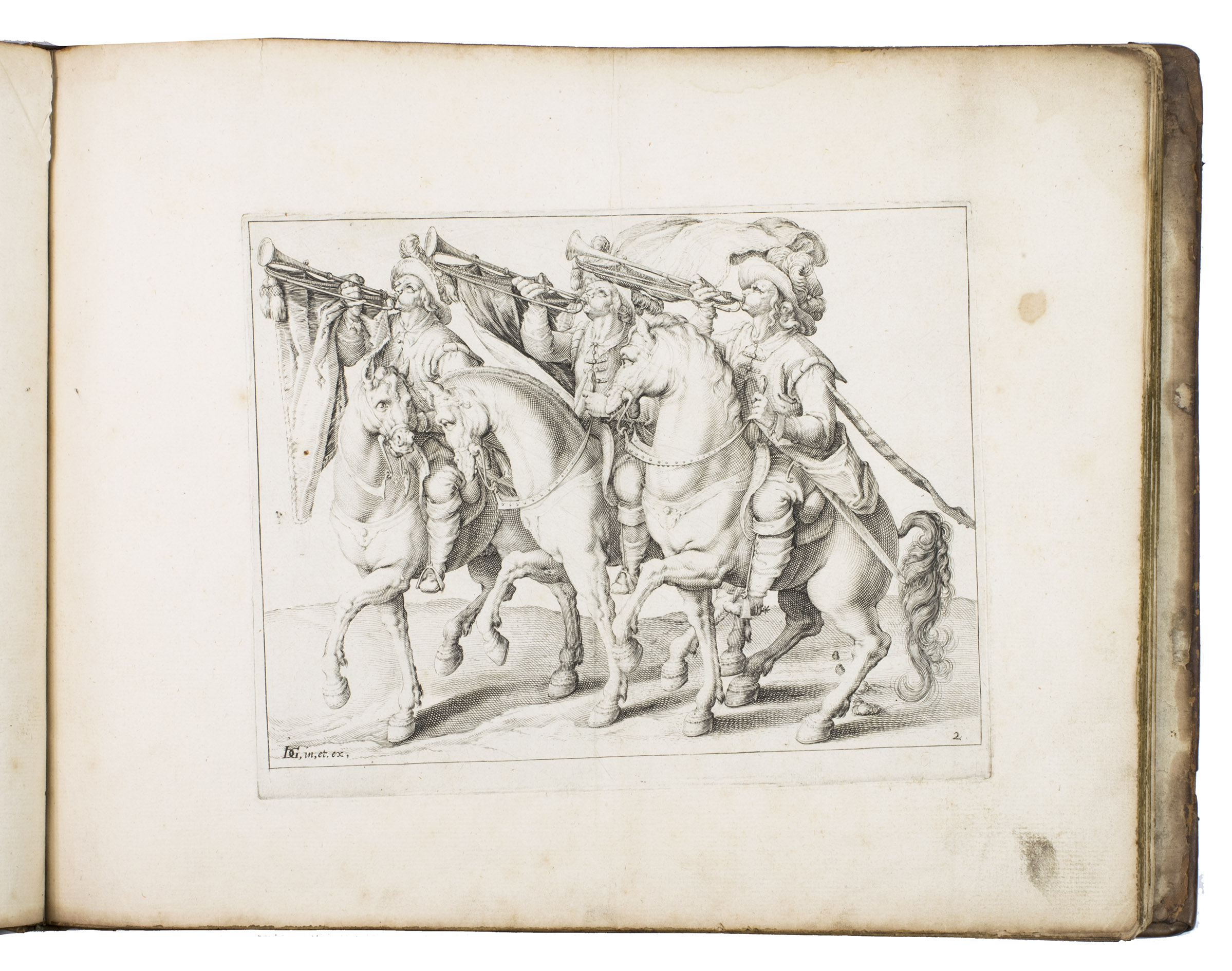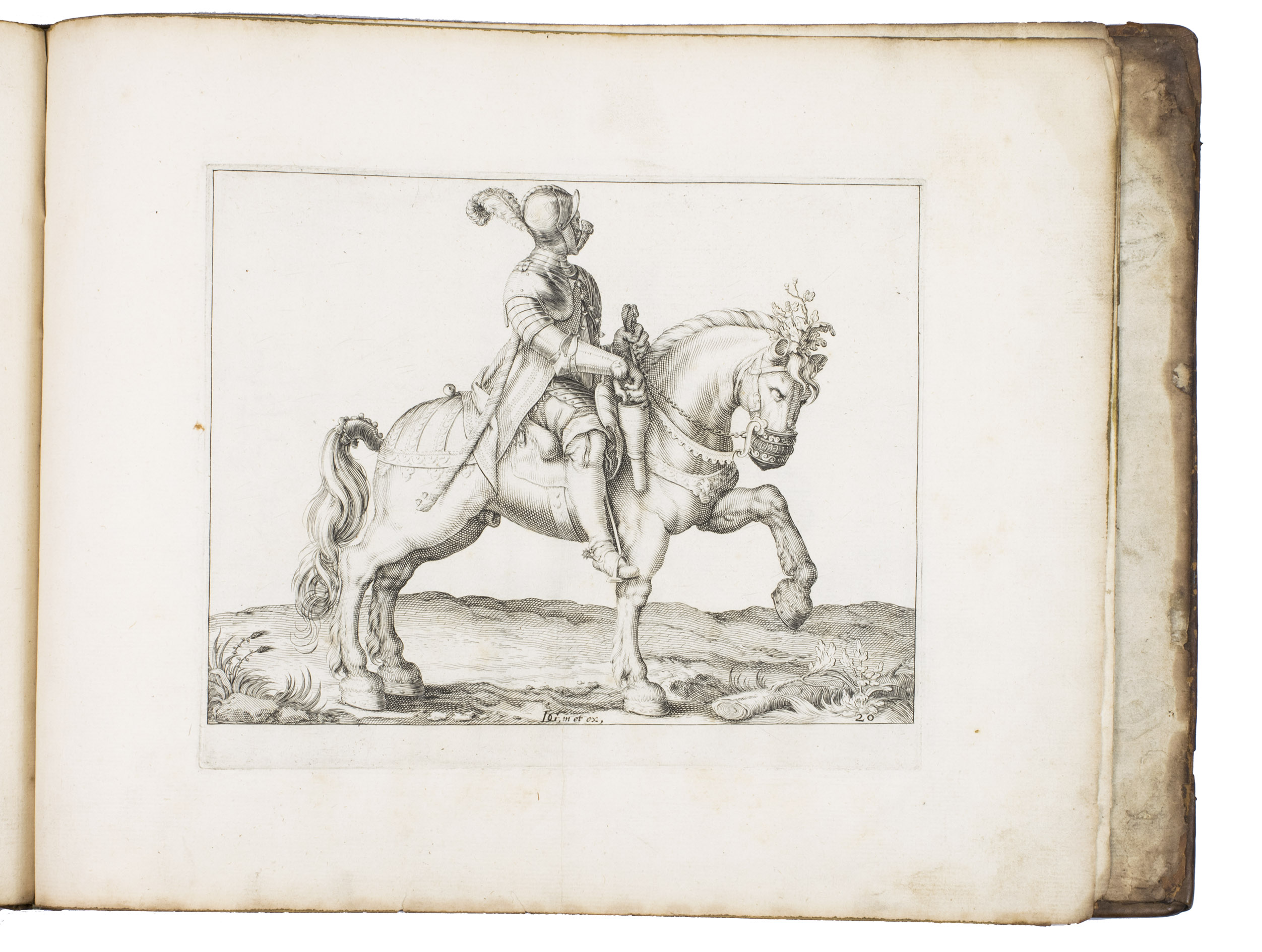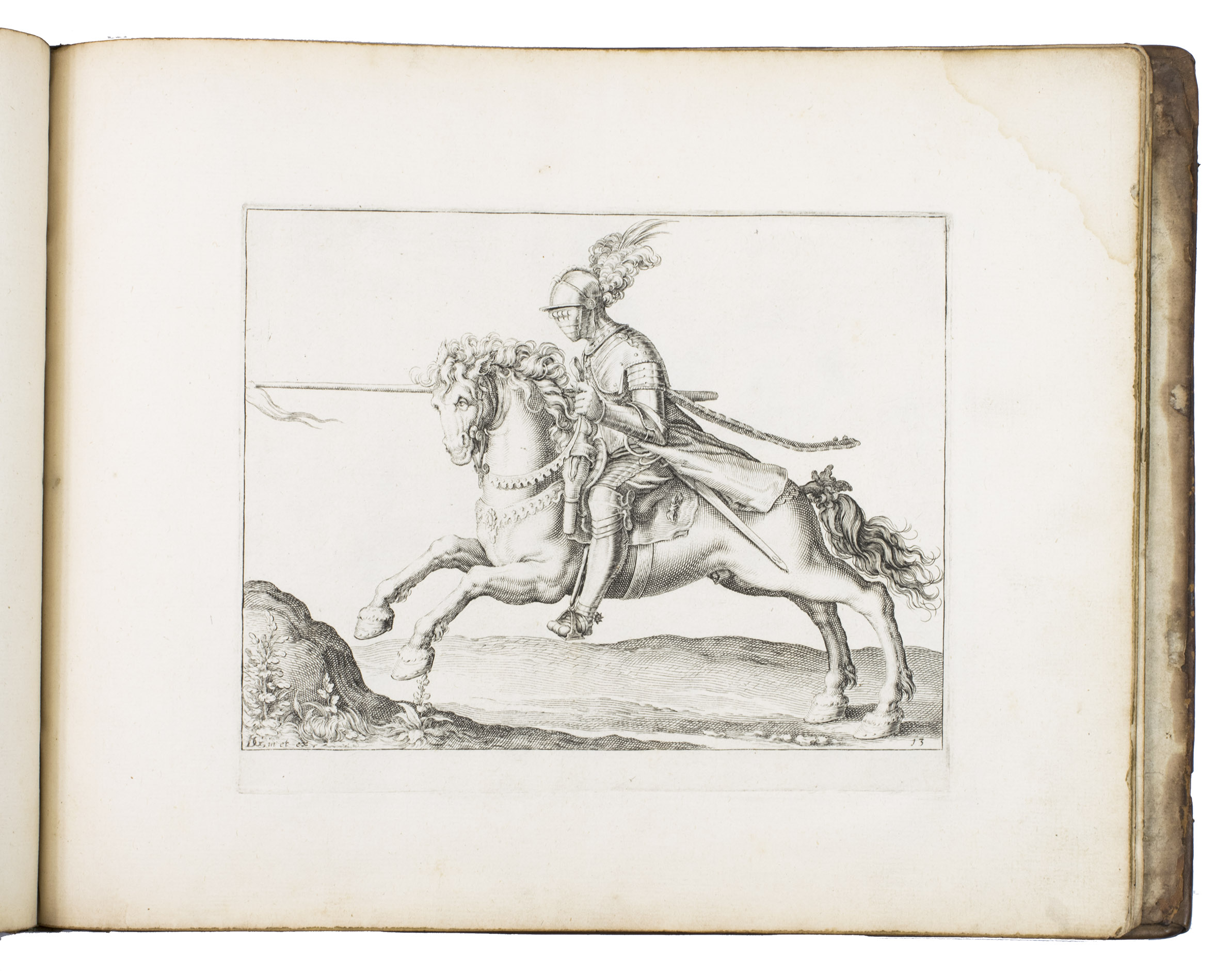 Very rare first edition of this magnificent series of cavalrymen and lansquentes in various positions, bound for Henry Frederick, Prince of Wales (1598-1612) with his coat-of-arms on the boards. All plates are signed by Jacob II de Gheyn ("IDGheyn in. et ex.") and engraved either by De Gheyn himself, or by Zacharias Dolendo after De Gheyn. The famous designer, engraver, publisher, and painter Jacob II de Gheyn, born in Antwerp in 1565, was an apprentice of Hendrick Goltzius in Haarlem between 1585 and 1587. In 1596, he moved to Leiden where he lived till 1602 working together with many of the professors of the newly founded University, amongst whom the "prodigy" Hugo de Groot (1583-1645), who became world famous as a lawyer and humanist. De Groot supplied the eight lines of poetry for the frontispiece of The Riding School, engraved within an elaborate border full of military symbols, such as a knight in armour holding a horse bridle on the left and a training master to the right, a stirrup, a currycomb, weapons, a skull with a laurel wreath symbolising "Death and Glory", and smoking trumpets. During these years in Leiden, De Gheyn worked mainly as a designer and publisher, leaving most of the engraving to apprentices, especially to Zacharias Dolendo (1561-1601). From ca. 1600 till his death in 1629, De Gheyn was active as a painter, draughtsman, and publisher in The Hague.