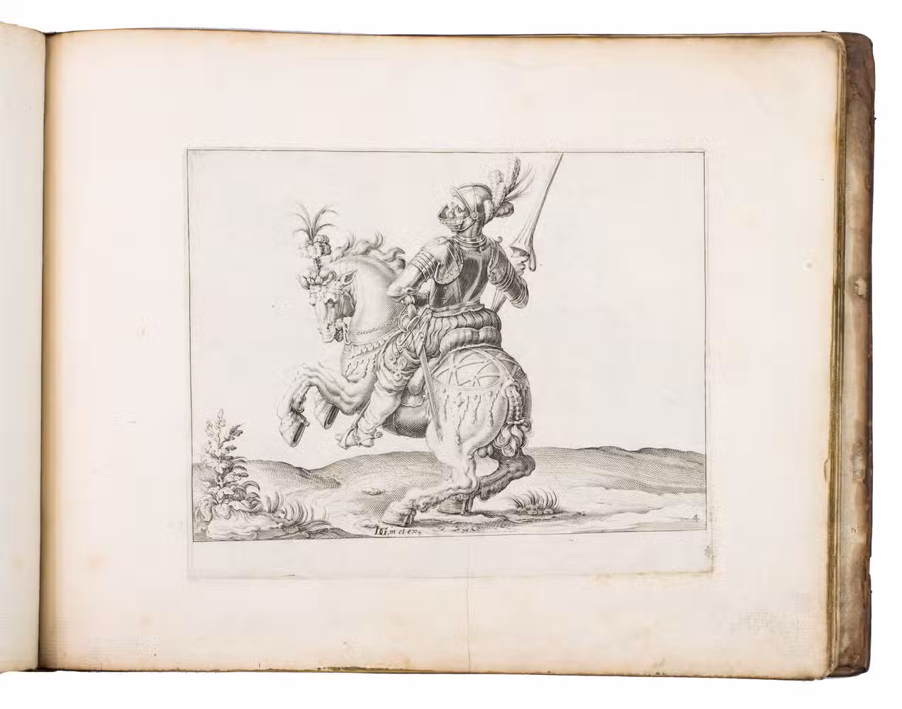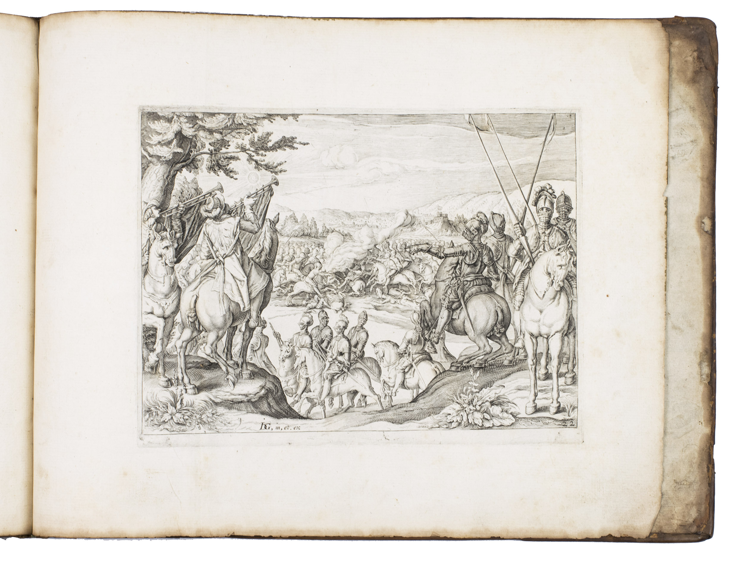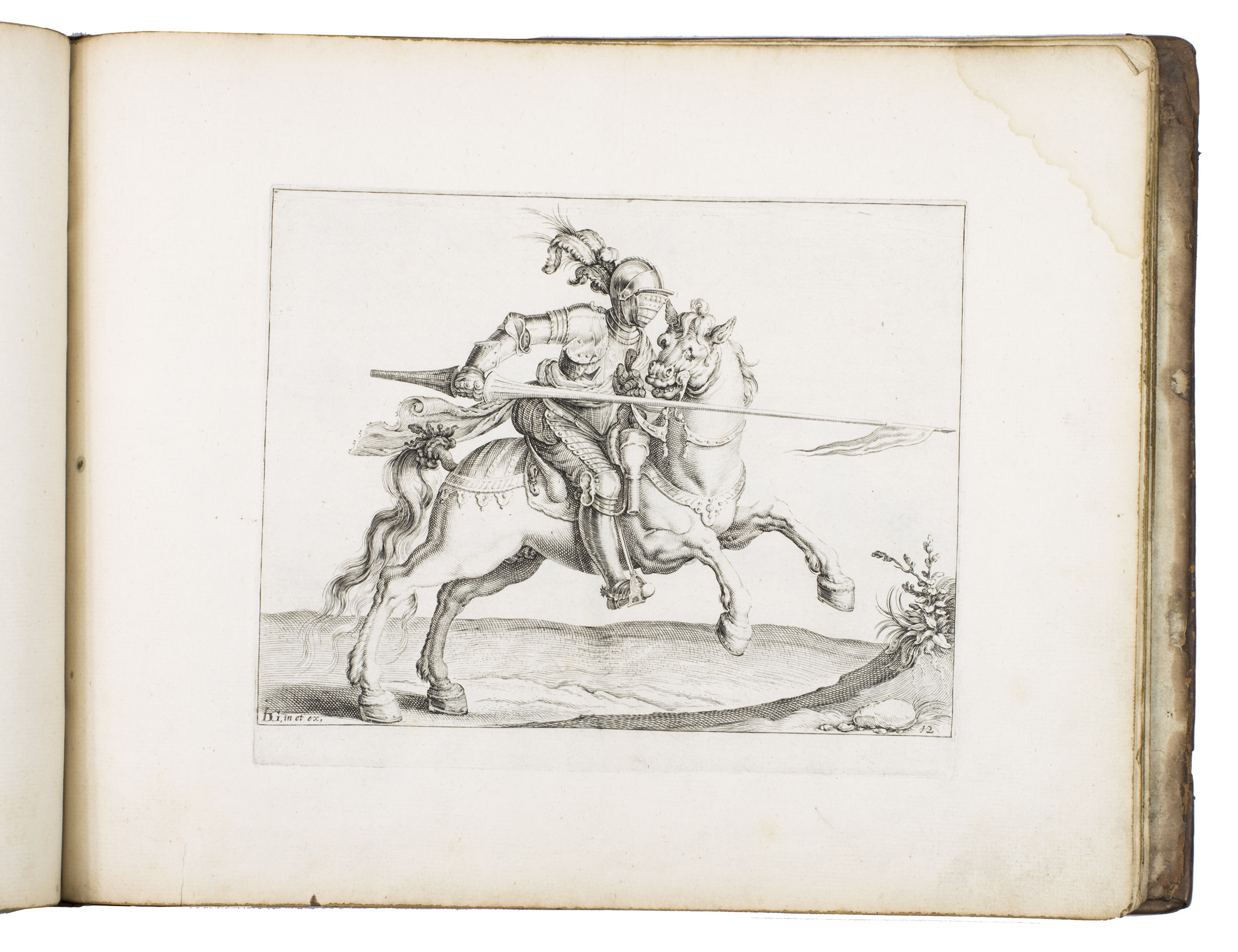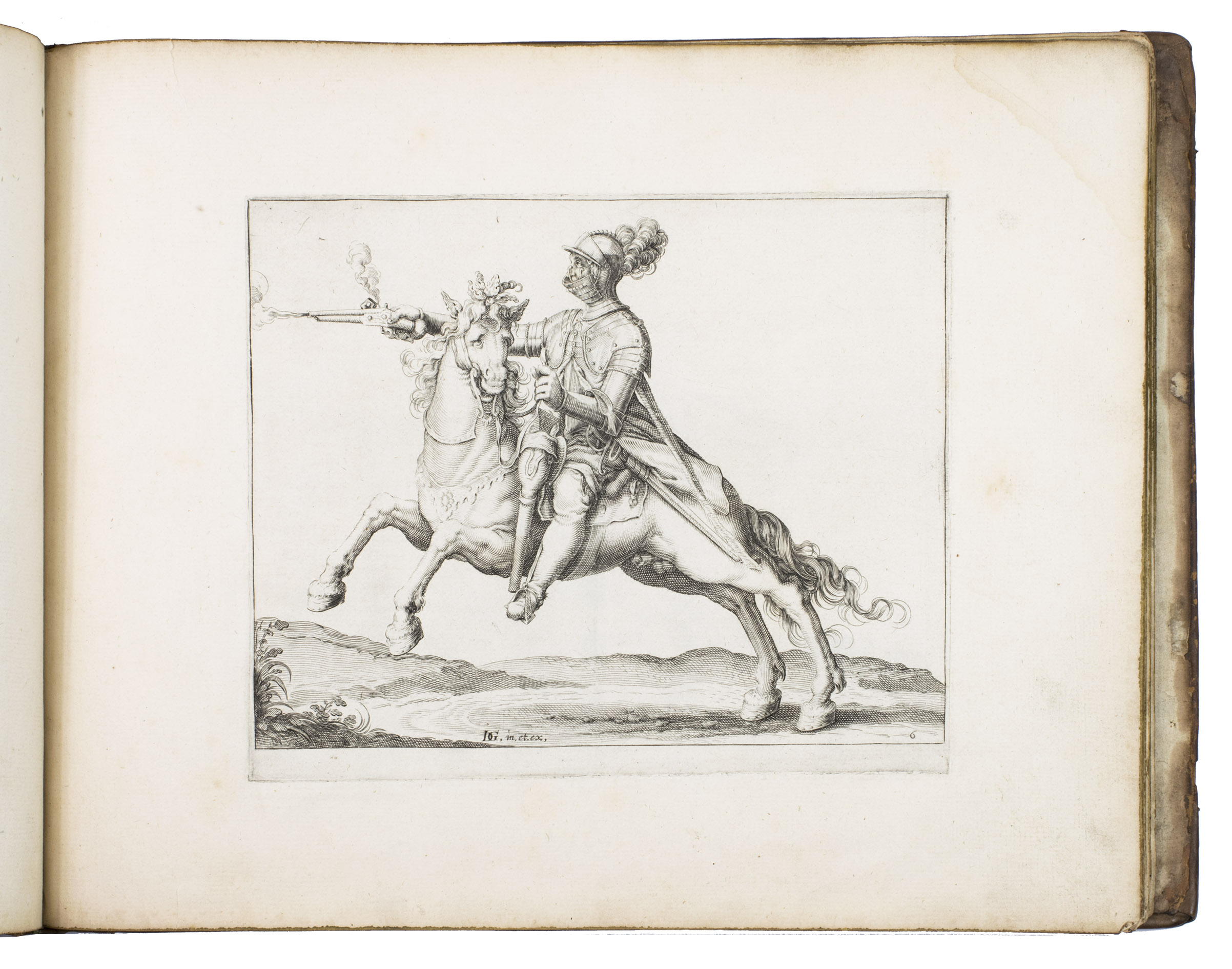 Very rare first edition of this magnificent series of cavalrymen and lansquentes in various positions, bound for Henry Frederick, Prince of Wales (1598-1612) with his coat-of-arms on the boards. All plates are signed by Jacob II de Gheyn ("IDGheyn in. et ex.") and engraved either by De Gheyn himself, or by Zacharias Dolendo after De Gheyn. The famous designer, engraver, publisher, and painter Jacob II de Gheyn, born in Antwerp in 1565, was an apprentice of Hendrick Goltzius in Haarlem between 1585 and 1587. In 1596, he moved to Leiden where he lived till 1602 working together with many of the professors of the newly founded University, amongst whom the "prodigy" Hugo de Groot (1583-1645), who became world famous as a lawyer and humanist. De Groot supplied the eight lines of poetry for the frontispiece of The Riding School, engraved within an elaborate border full of military symbols, such as a knight in armour holding a horse bridle on the left and a training master to the right, a stirrup, a currycomb, weapons, a skull with a laurel wreath symbolising "Death and Glory", and smoking trumpets. During these years in Leiden, De Gheyn worked mainly as a designer and publisher, leaving most of the engraving to apprentices, especially to Zacharias Dolendo (1561-1601). From ca. 1600 till his death in 1629, De Gheyn was active as a painter, draughtsman, and publisher in The Hague.