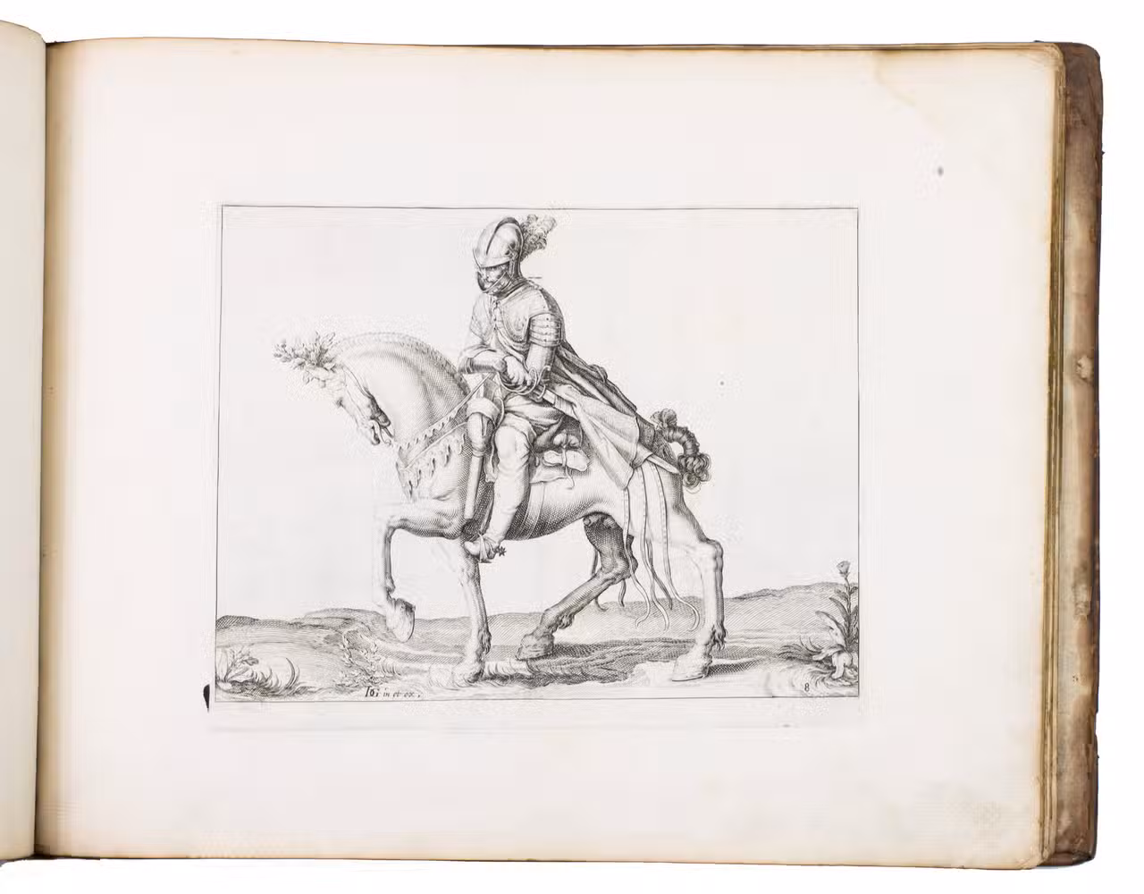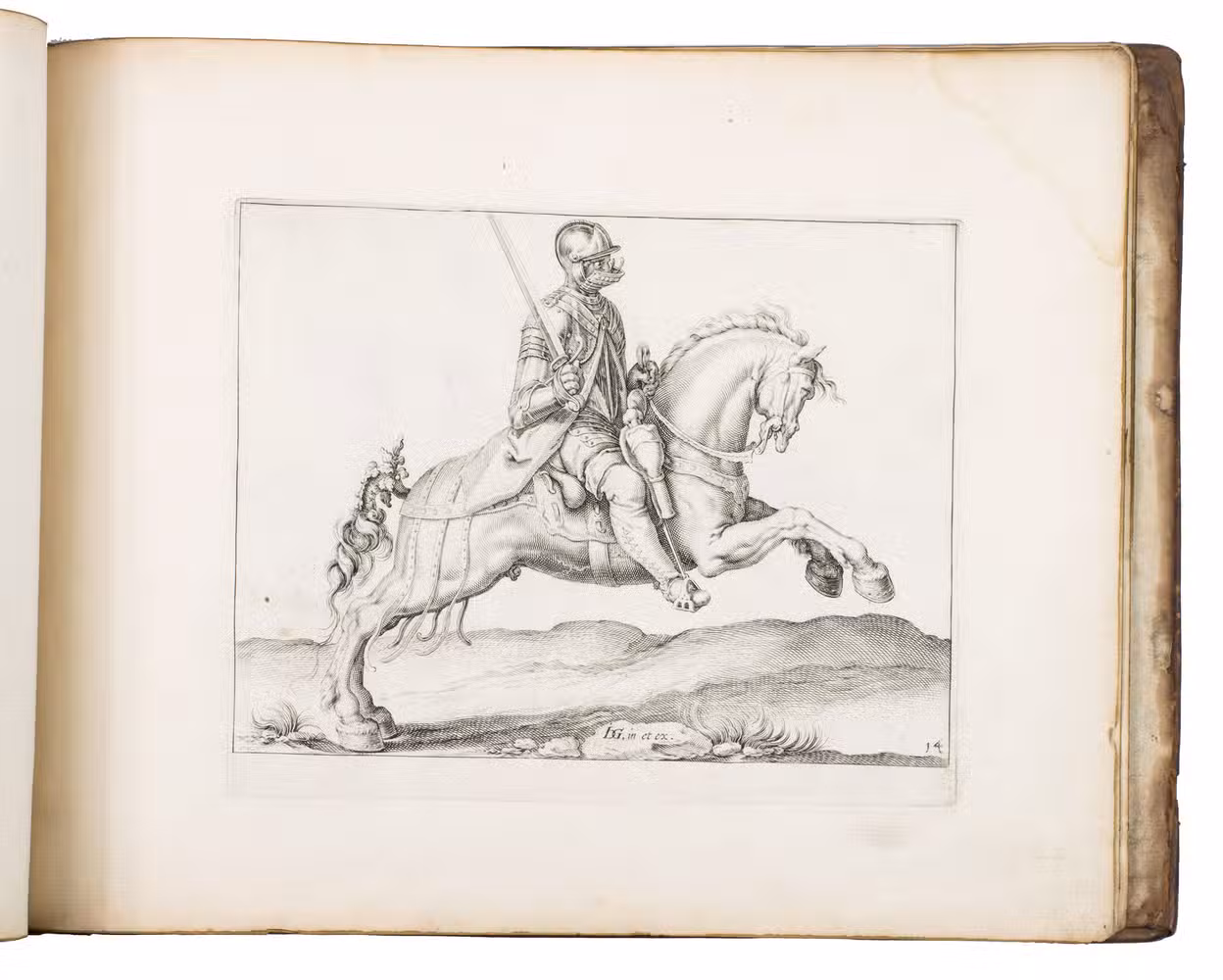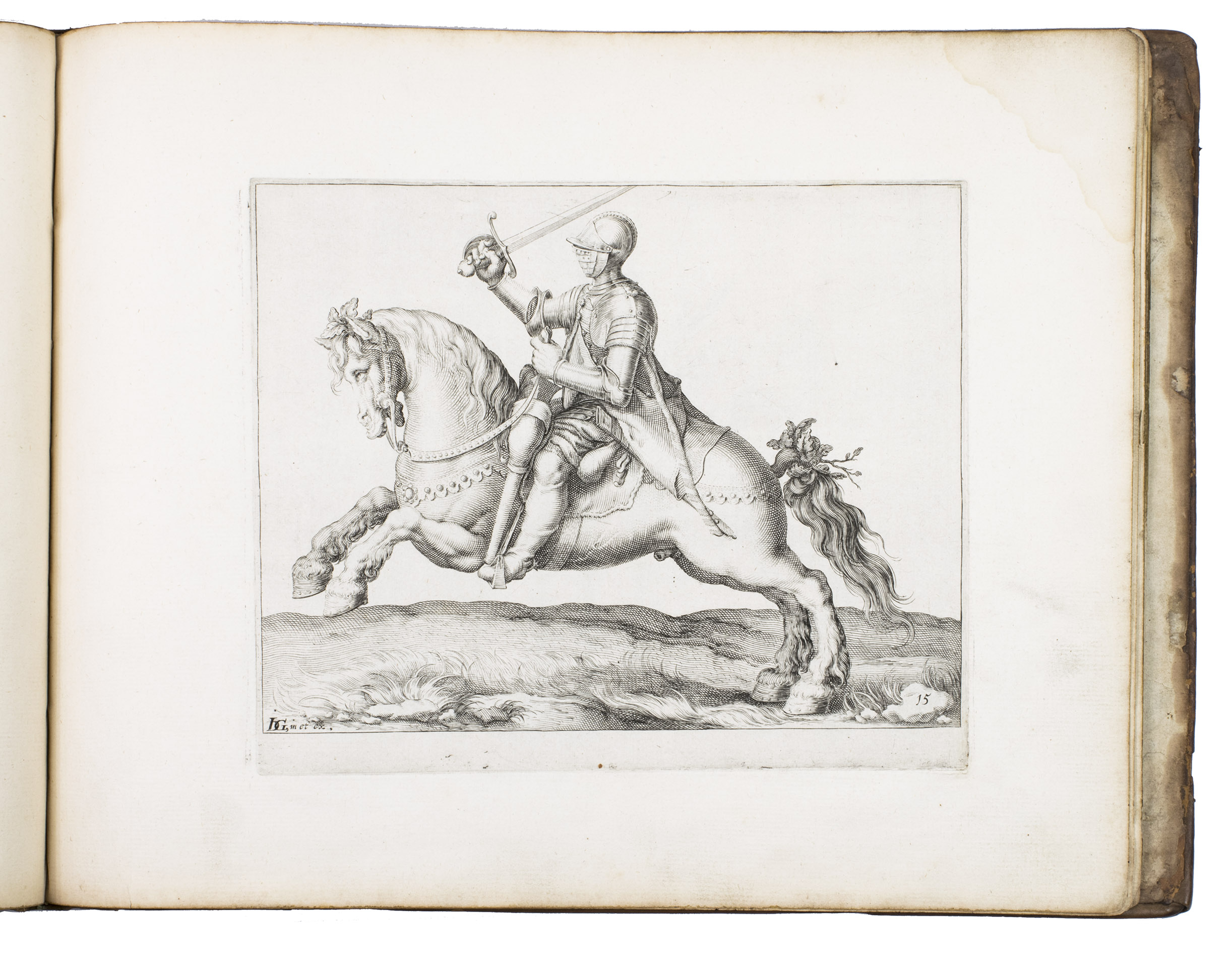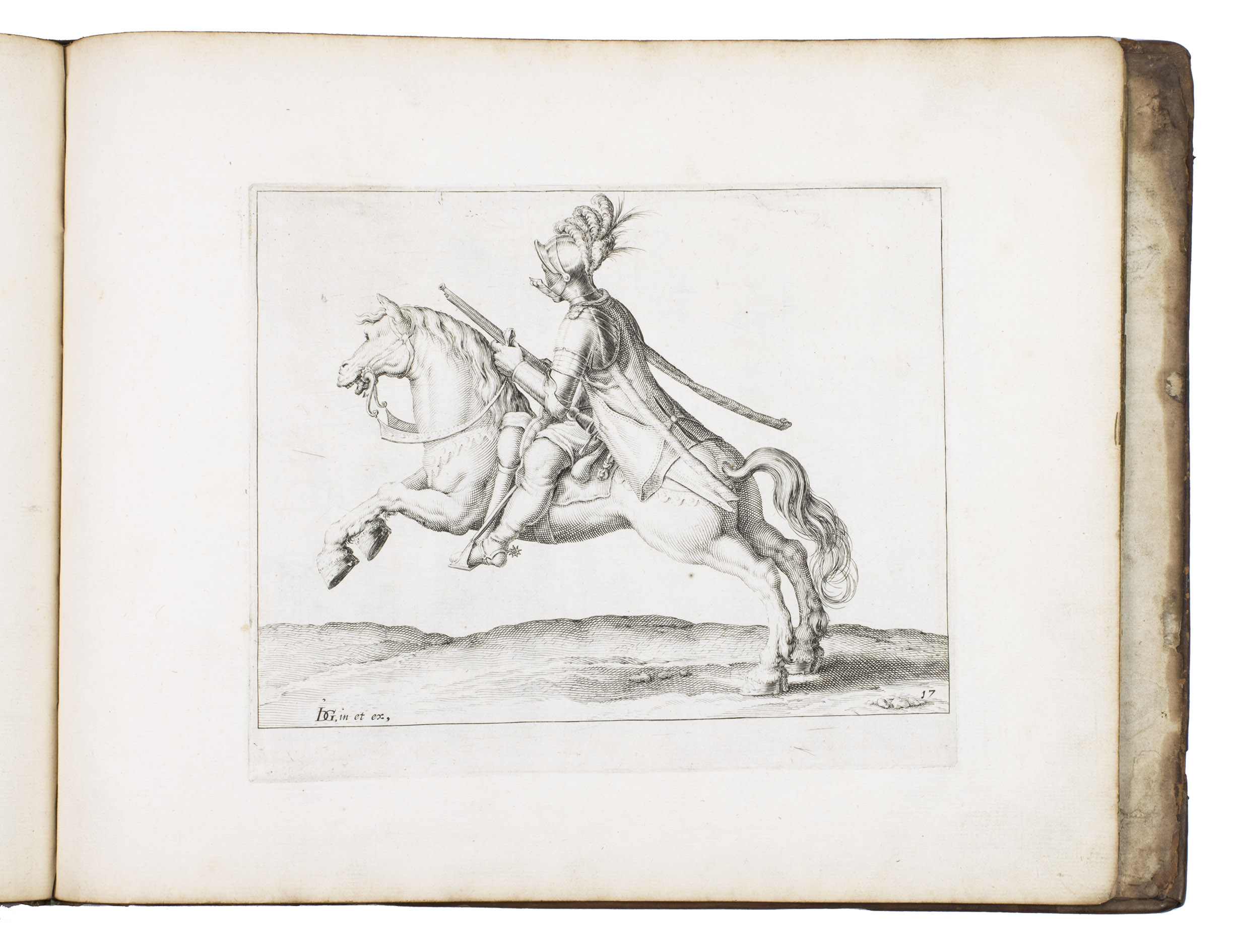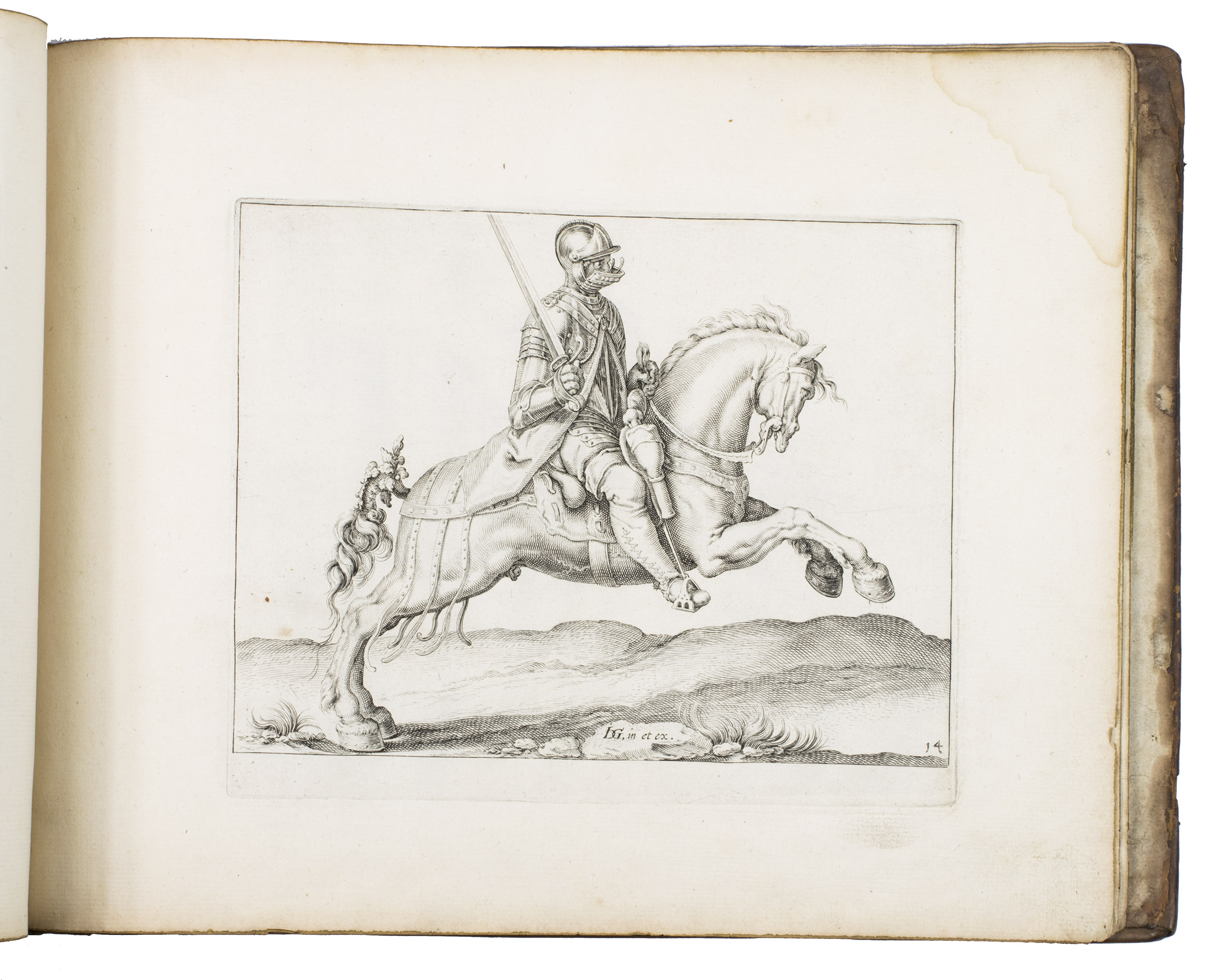 With a small engraved book plate showing a CR monogram of Richard Cosway, and a 19th-century inscription "Bought at Mr Cosway's sale 1822 for Lord Harrington" (probably referring to Charles Stanhope, 4th Earl of Harrington), both on the front paste-down. The binding has been re-backed, with the original back strip laid down, and the leather on the boards is somewhat scratched and rubbed, but still leaving the coat-of-arms centrepiece quite clear. All plates show a vertical fold line in the middle, the leaves are slightly dust soiled and the upper outer corner of the leaves are somewhat water stained, without affecting the plates, otherwise the engravings remain fine and clean. Overall in very good condition. The complete collection of De Gheyn's "Riding School" plates in a royal binding. Biblioth. Hippologica Johan Dejager (2014), pp. 780-781, no. 011; Hollstein VII, 263-284; New Hollstein, The De Gheyn Family, vol. 2, 190-211 (descriptions and illustrations of all plates); Polman, De ruiterserie van Jacob de Gheyn (1998); Rechteren Altena, Jacques de Gheyn, Three generations (1983) vol. 1, p. 54, vol. 2, pp. 62-64, nos. 200-321; for the coat-of-arms on the binding see: UofT - British Armorial Bindings - Henry Frederick, Prince of Wales (1594-1612) (Stamp 01) https://armorial.library.utoronto.ca/stamps/IHEN004_s01.