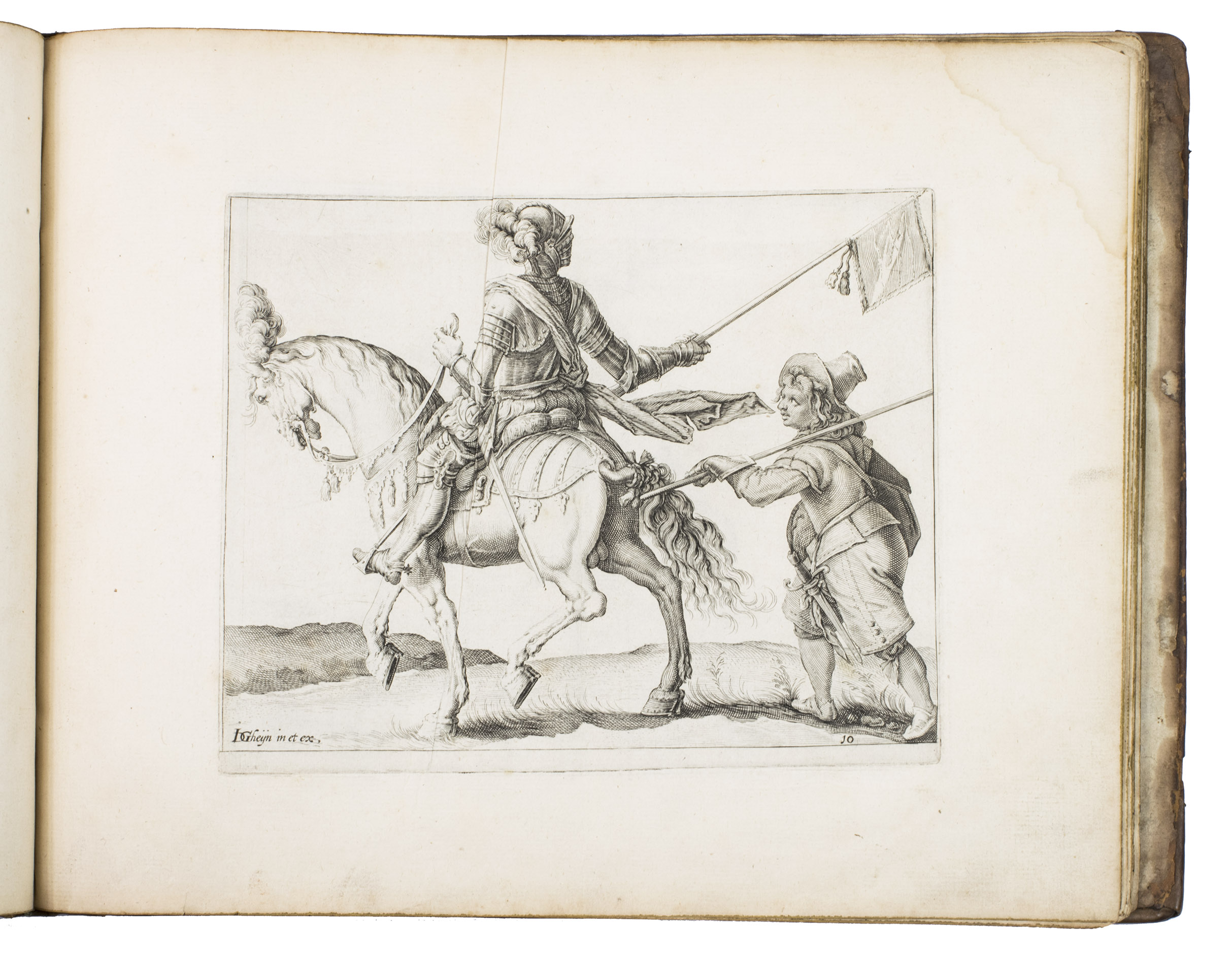 [Leiden, workshop of Jacob II de Gheyn, 1599]. Oblong folio (25 x 32 cm). With 22 numbered engraved plates (varying sizes, ca. 15.4-16 x 19.7 x 21.5 cm), including the engraved title-page. The illustrations are designed by De Gheyn and possibly engraved by him or by Zacharias Dolendo. Contemporary gold-tooled calf with the large gold-tooled coat-of-arms of the Stuart Princes of Wales (Stuart Prince of Wales, Henry Frederick (1594-1612)) within a gold- and blind-tooled double fillet frame on both boards, with small gold-tooled flowers on the spine, gold-tooled board edges. [22 engraved plates].