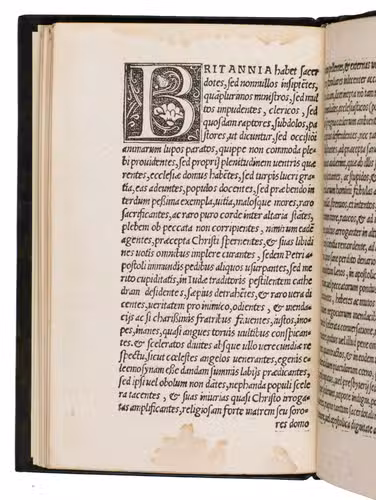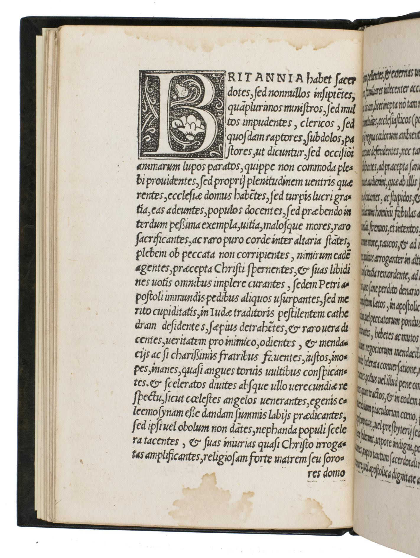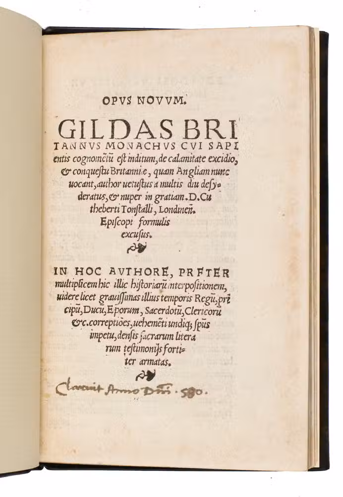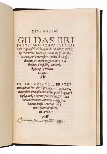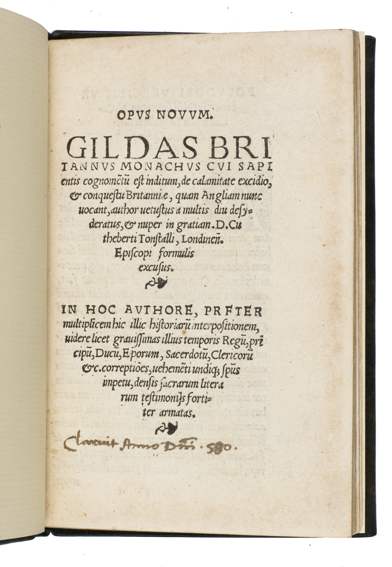 First edition of one of the most important sources for the history of Britain in the 5th and 6th centuries, written by a near-contemporary, the 6th-century British monk Saint Gildas (ca. 450/500-ca. 570). This religious polemic condemns the acts of several of the most important figures of his time, and blames them for the state of the country. It also includes one of the earliest descriptions of Hadrian's Wall. The present copy is the rare first issue, with the misprint on the title page.