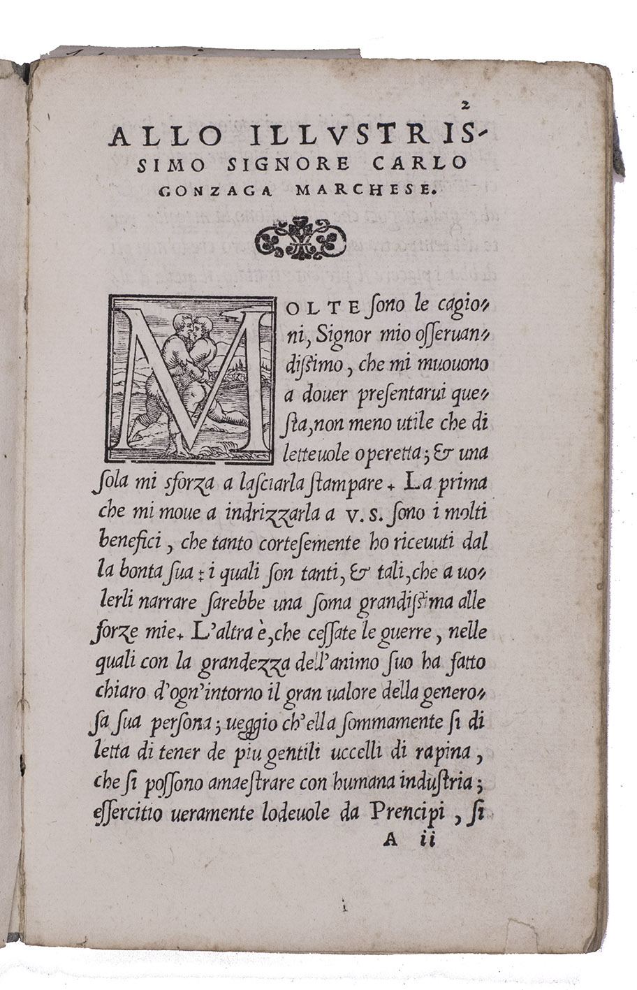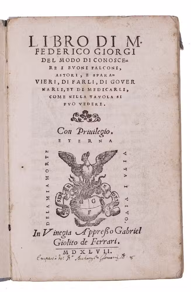First edition of an early and "esteemed" (Harting) work on falconry, containing detailed information on the breeding and training of falcons, hawks, and sparrow hawks, with notes on their feeding and care. It was an important source for Turberville's The booke of faulconrie or hawking, the best known work on hawking of the 16th century. With a dedication to Marchese Carlo Gonzaga, whom Giorgio appears to have served as falconer. Carlo Gonzaga was a member of the well-known Italian Gonzaga family, which ruled Mantua from 1328 to 1708. At the Gonzaga court there, falconry was practiced according to ancient traditions and was an important part of the family's favourite pastime: hunting.