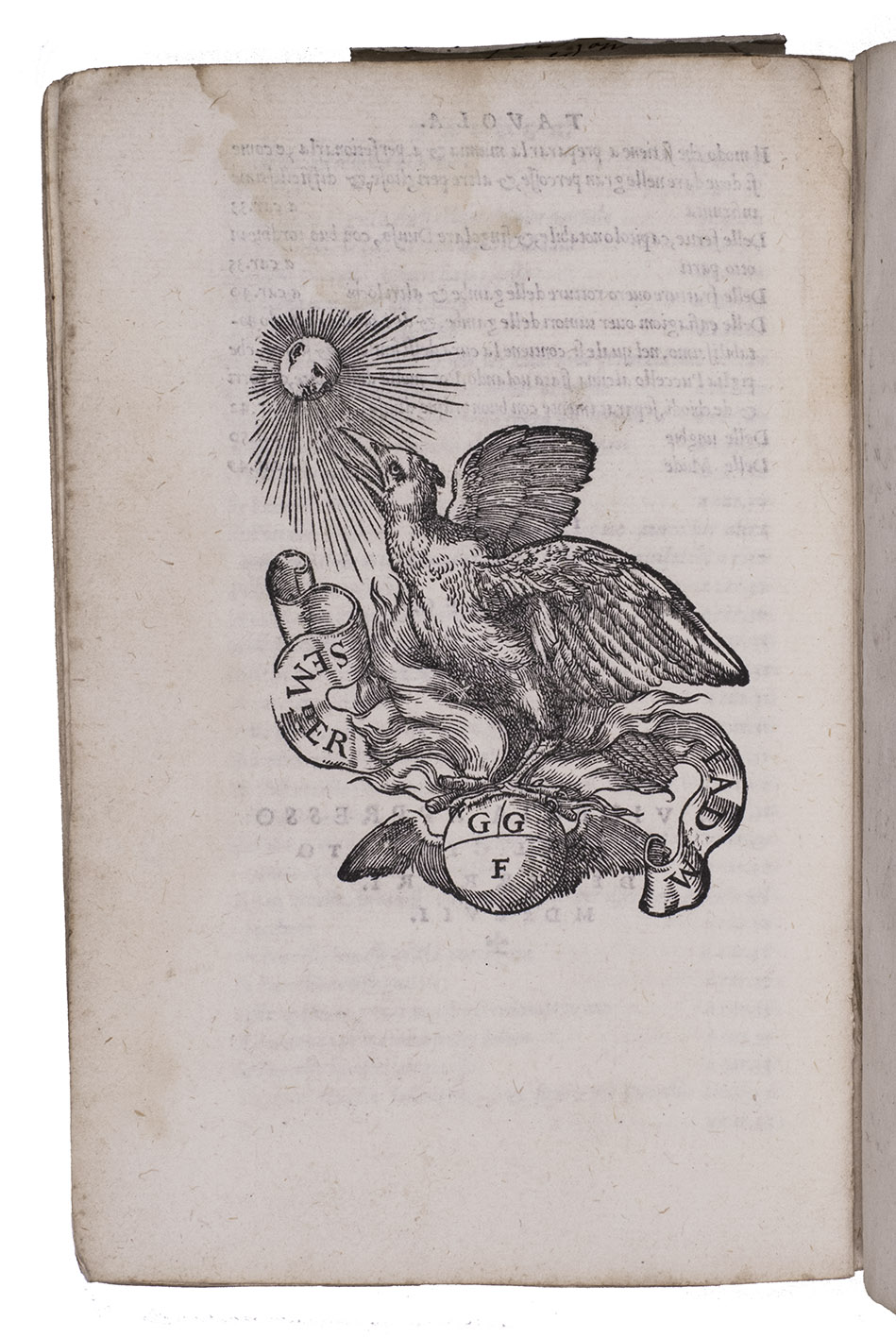 Venice, Gabriel Giolito de Ferrari, 1547. 8vo. With Giorgi's woodcut phoenix printer's device on title-page and a stunning larger one at the end. Blue stiff paper wrappers (ca. 1800). 53, [2], [1 blank] ll.