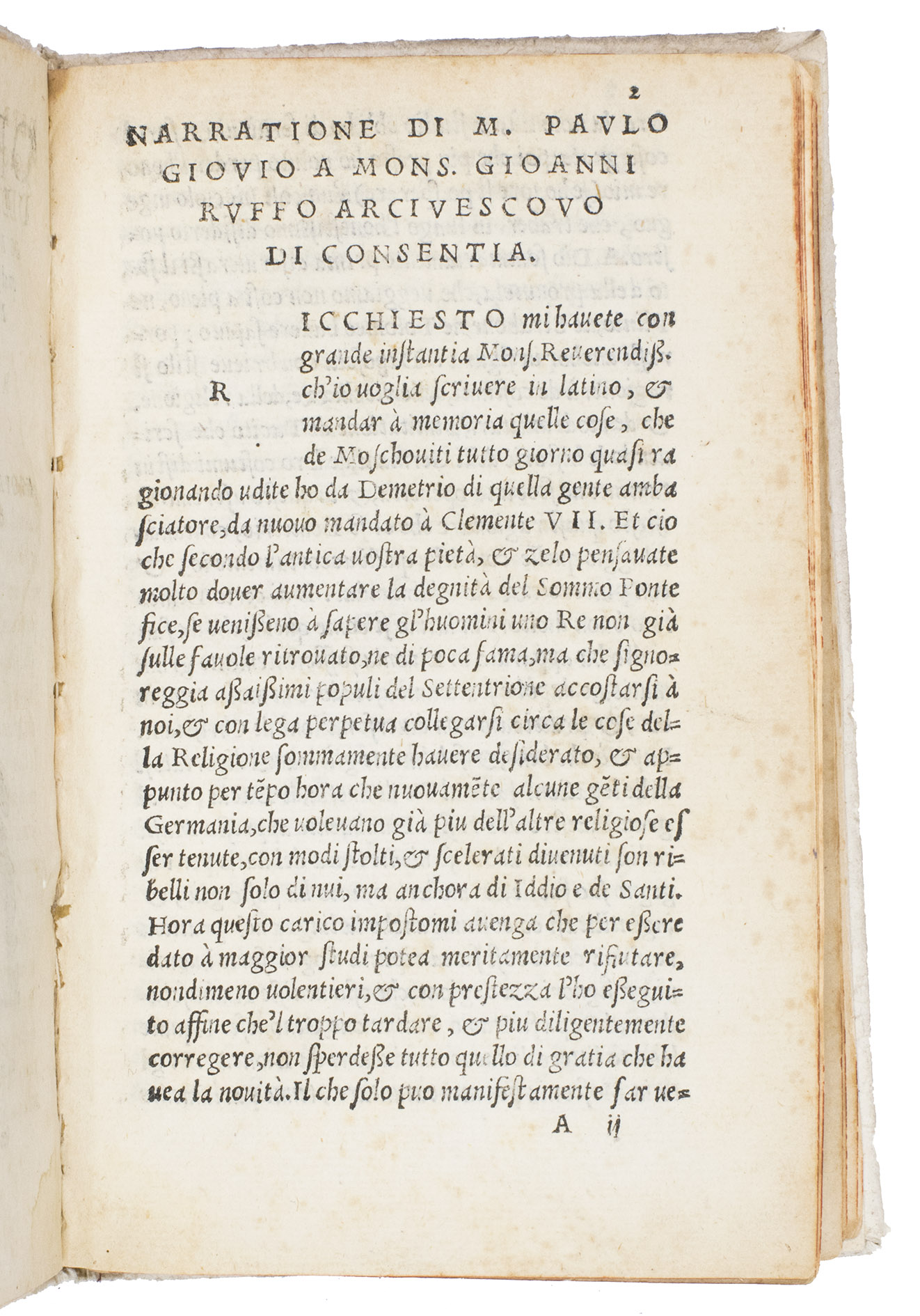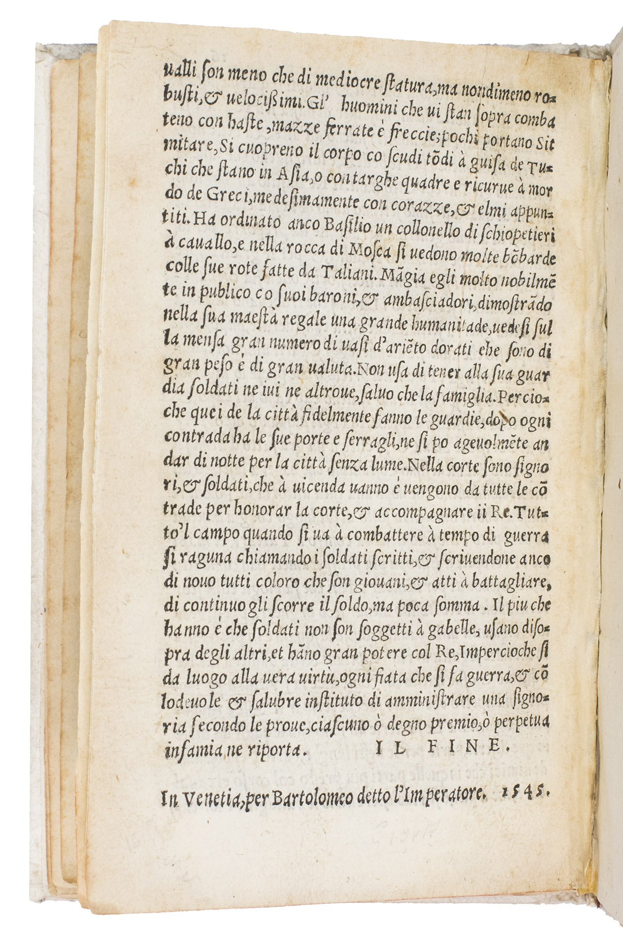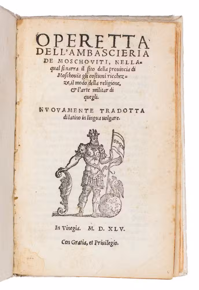 First and only edition of the Italian translation of a short description of Russia, one of the most important of the 16th century on these then remote parts of the world. It was originally published in Latin as De legatione Basilii Magni principis Moschoviae (Rome, 1525). The treatise was written in the context of European efforts to convince the Muscovites to help remove the Turks from the continent and the papal efforts for a clerical union between Rome and Moscow to counter the Reformation.