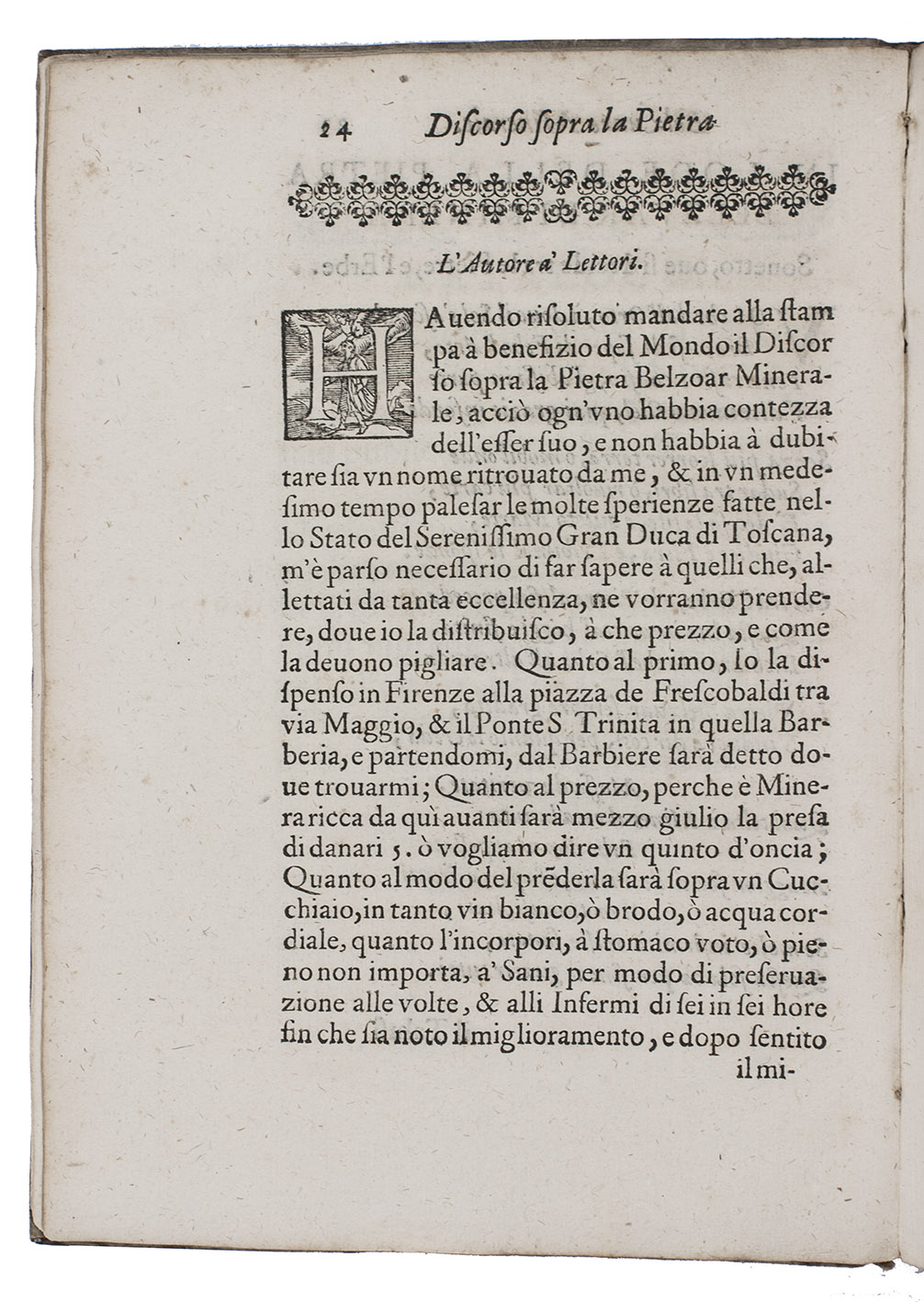 Rare first and only edition of an Italian treatise on the medicinal qualities of mineral bezoar (antimony oxide). It discusses the nature, preparation and medicinal properties of the powdered mineral bezoar, which is presented as a wonder drug, and gives numerous testimonial letters of its remarkable qualities from physicians and patients. The author was a pharmacist and of course could supply the miraculous cure to those in need.