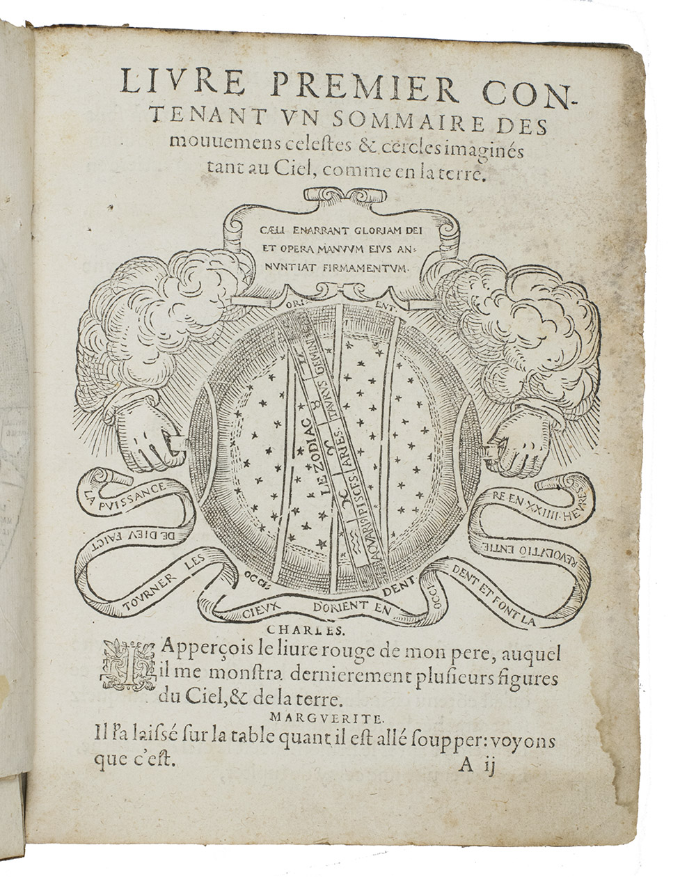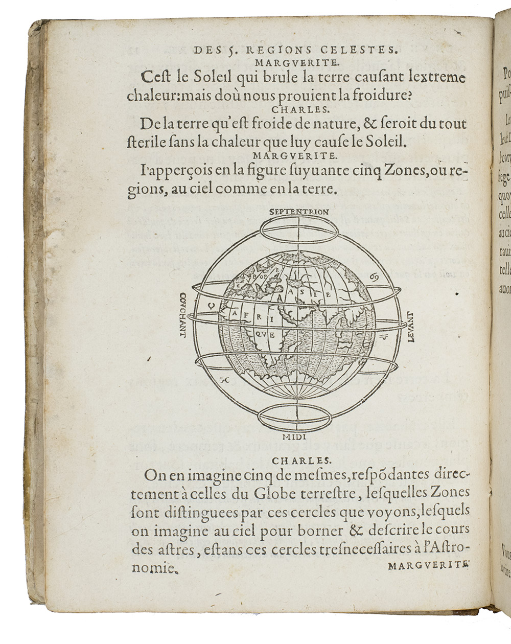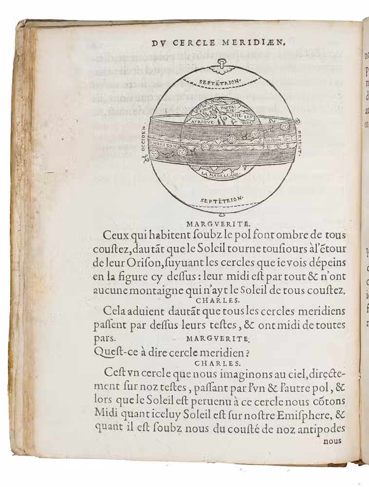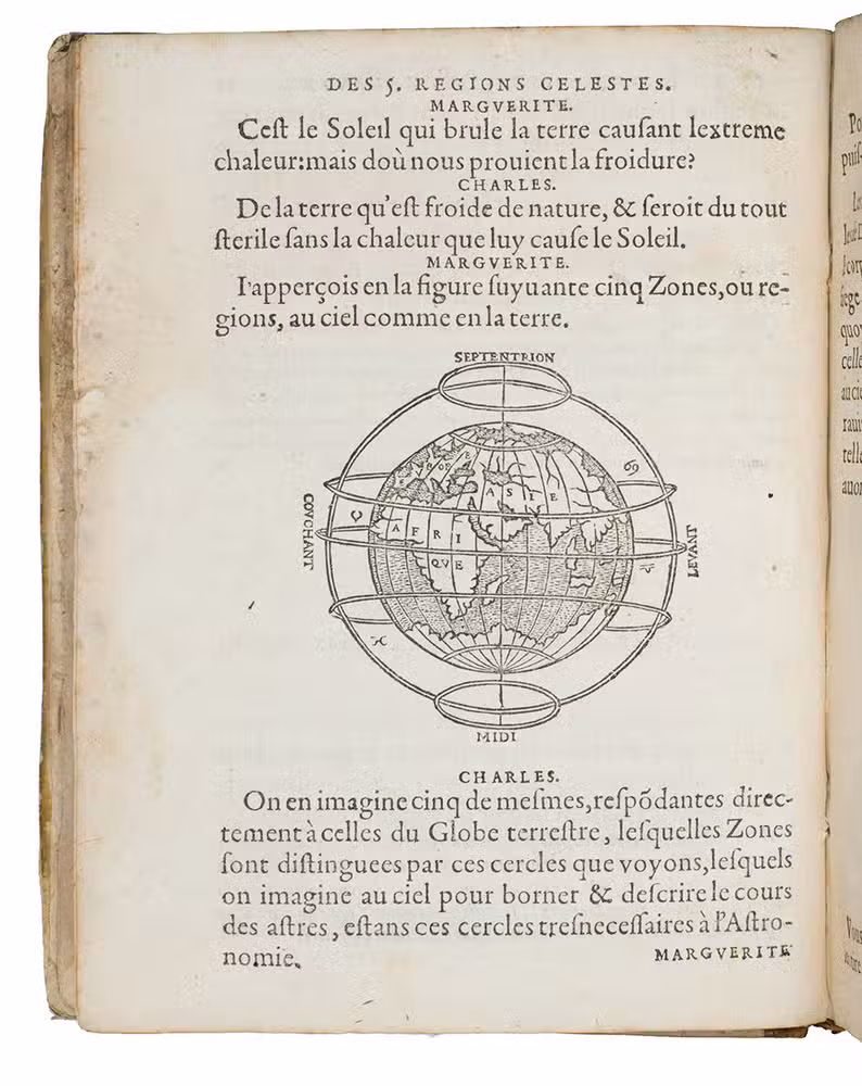 Rare French 16th-century astronomical, cosmographical and geographical work by Simon Girault. This short treatise, comprising three books presented in the form of a dialogue between two children named Charles and Marguerite, discussing several aspects of heaven and earth. The first book discusses celestial movements and circles, the second book treats the solar system more extensively, the quality of different planets, the size of the earth and its proportion and distance to the other celestial bodies. Girault also discusses why the sun appears to be larger in the winter than in the summer, explains eclipses and tells more about the directions and retrograde movements of several planets. The third book is more on terrestrial topics.