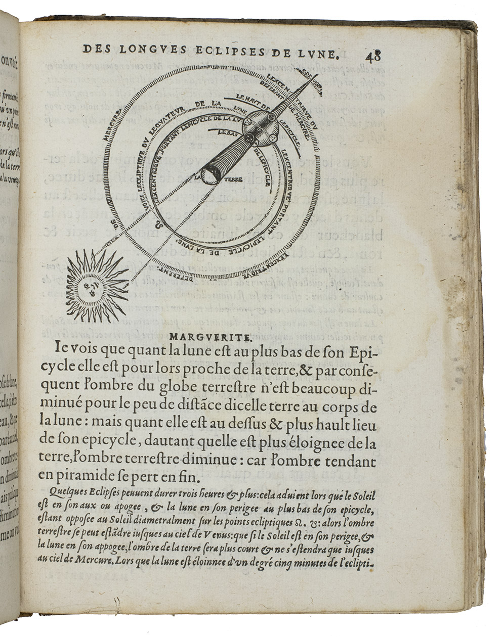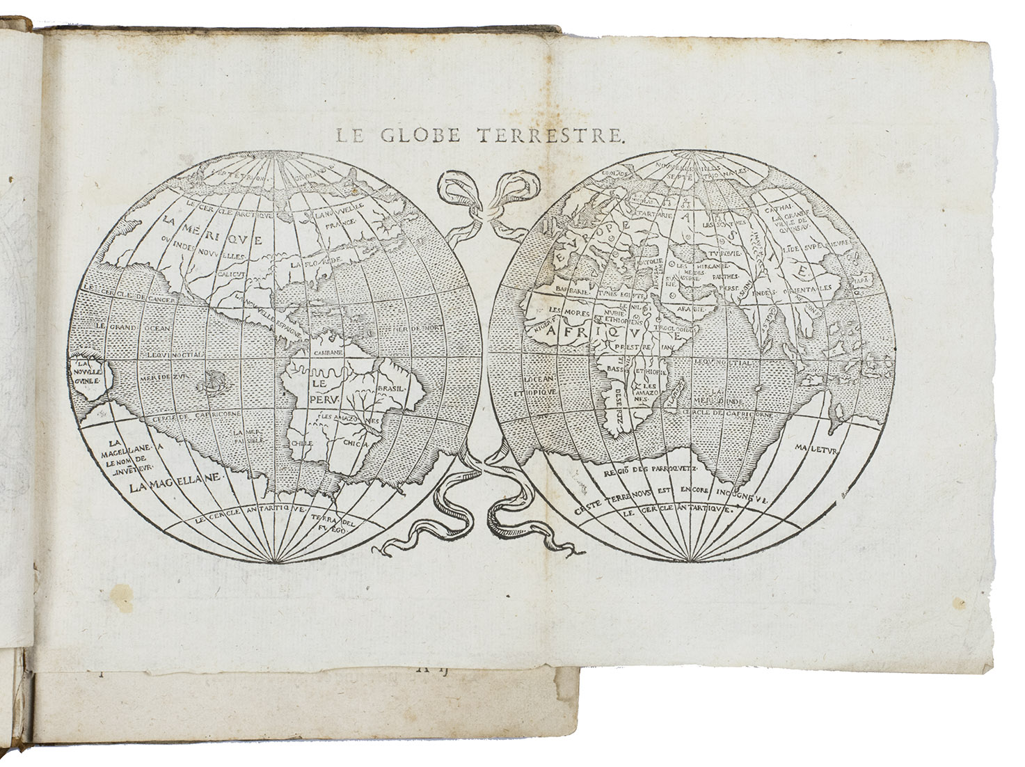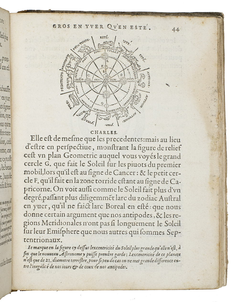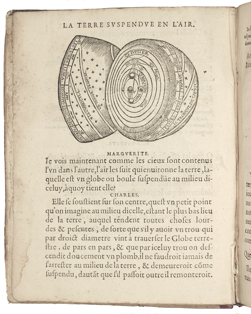 Rare French 16th-century astronomical, cosmographical and geographical work by Simon Girault. This short treatise, comprising three books presented in the form of a dialogue between two children named Charles and Marguerite, discussing several aspects of heaven and earth. The first book discusses celestial movements and circles, the second book treats the solar system more extensively, the quality of different planets, the size of the earth and its proportion and distance to the other celestial bodies. Girault also discusses why the sun appears to be larger in the winter than in the summer, explains eclipses and tells more about the directions and retrograde movements of several planets. The third book is more on terrestrial topics.