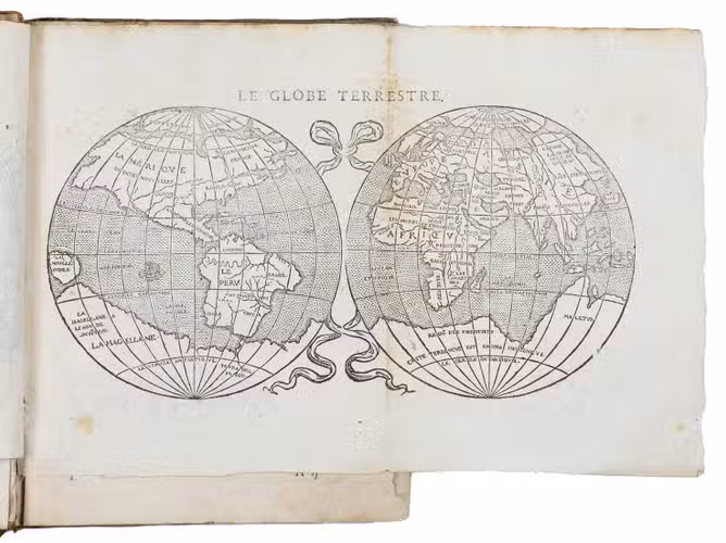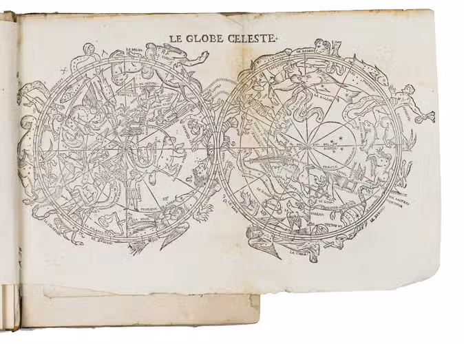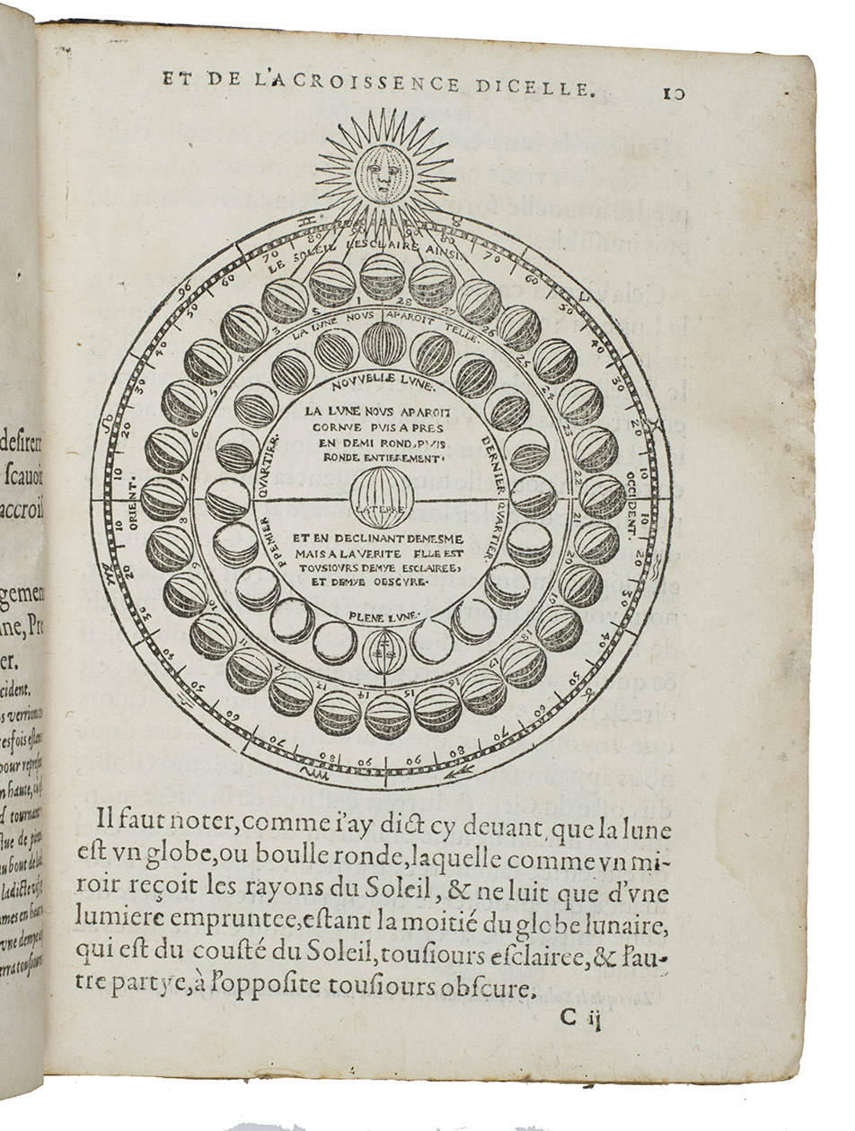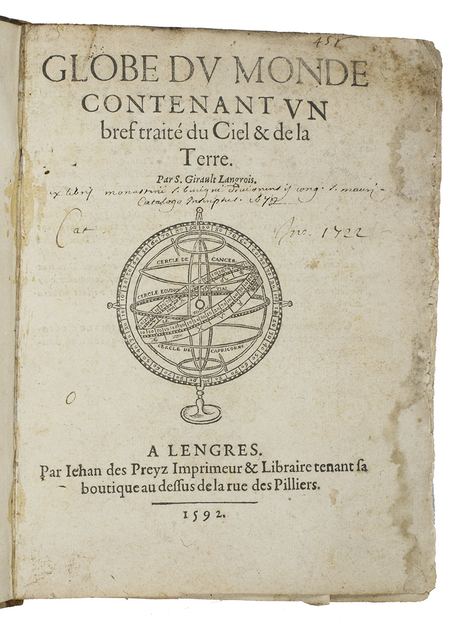 Langres, Jean des Preyz, 1592. 4to. With a woodcut on the title-page showing an armillary sphere, 3 woodcut folding plates of the solar system, a celestial chart in two hemispheres and a (terrestrial) map of the world in two hemispheres, 4 woodcut maps in the text (including a map of Europe), many astronomical and cosmographical woodcut figures and tables in the text and woodcut head- and tailpieces and initials. 18th-century half brown sheepskin, brown paper sides. 92 ll.